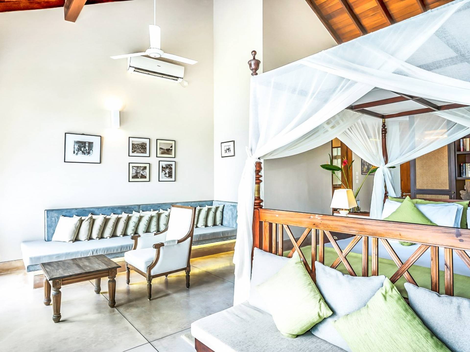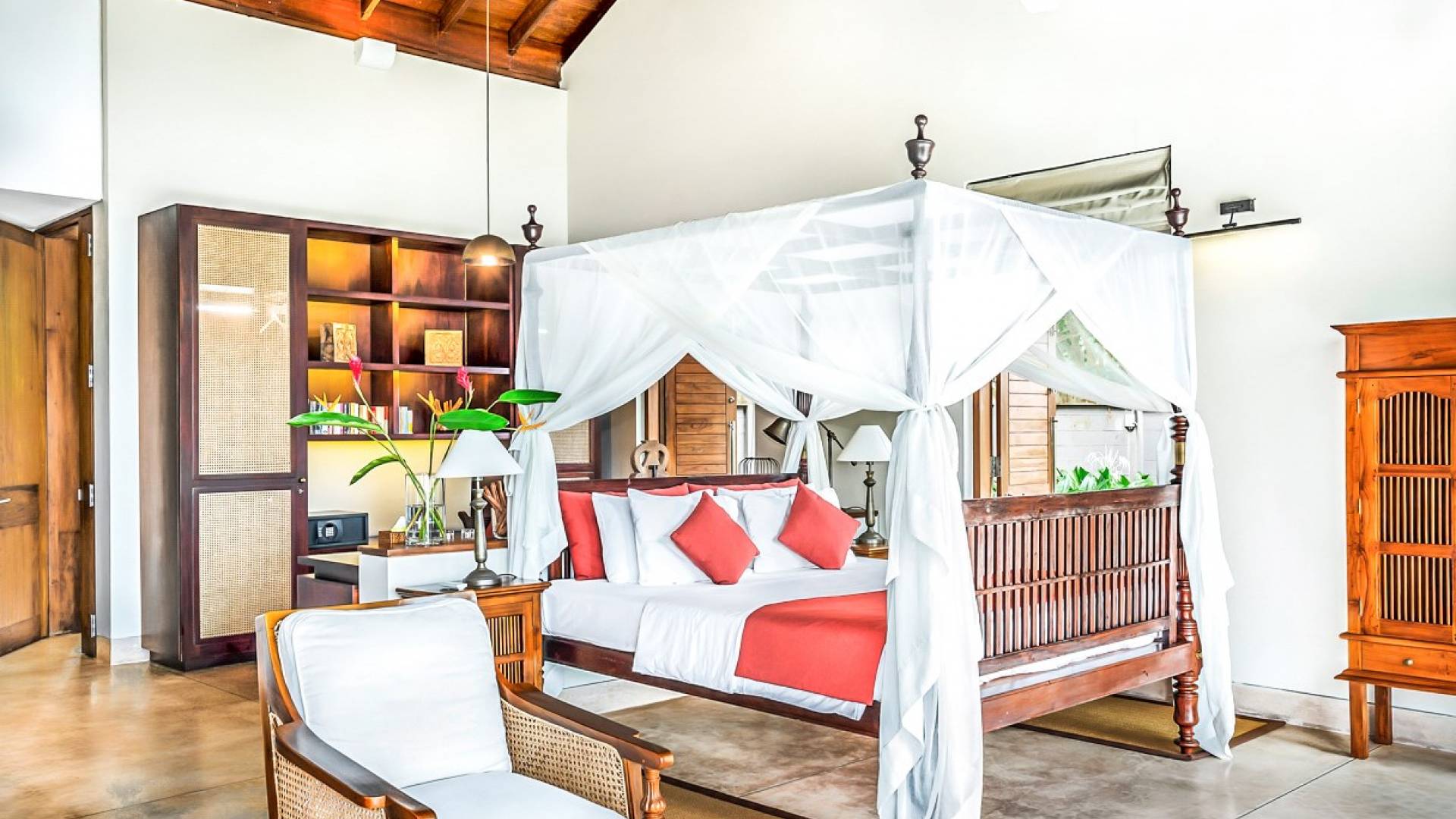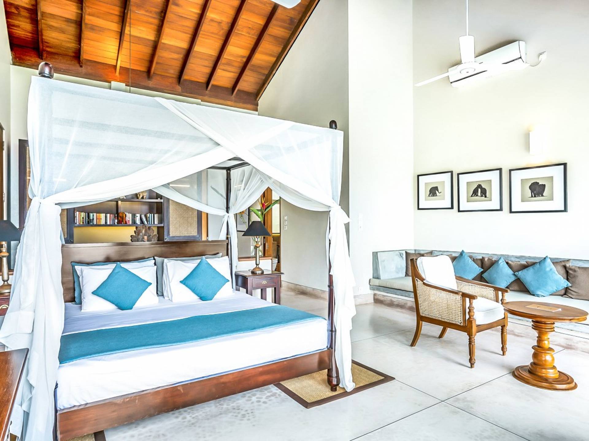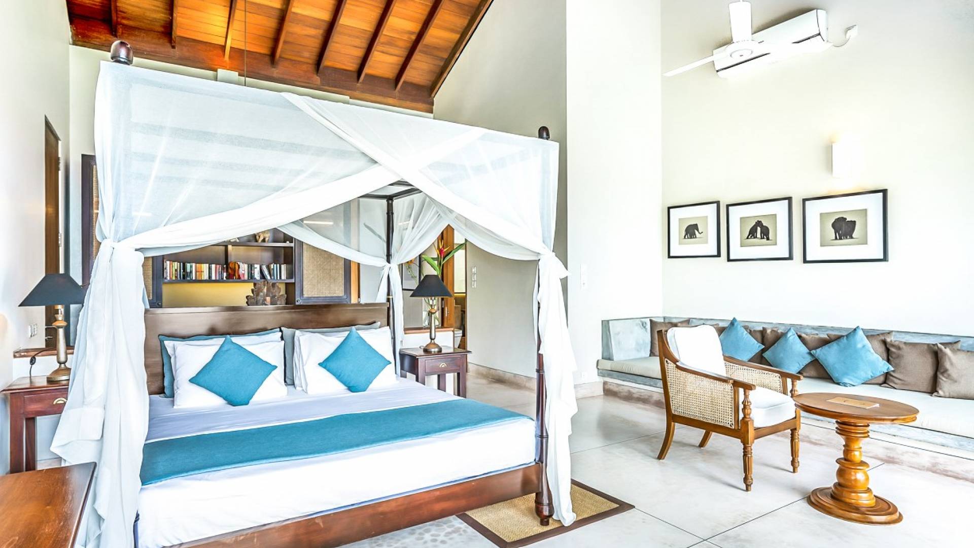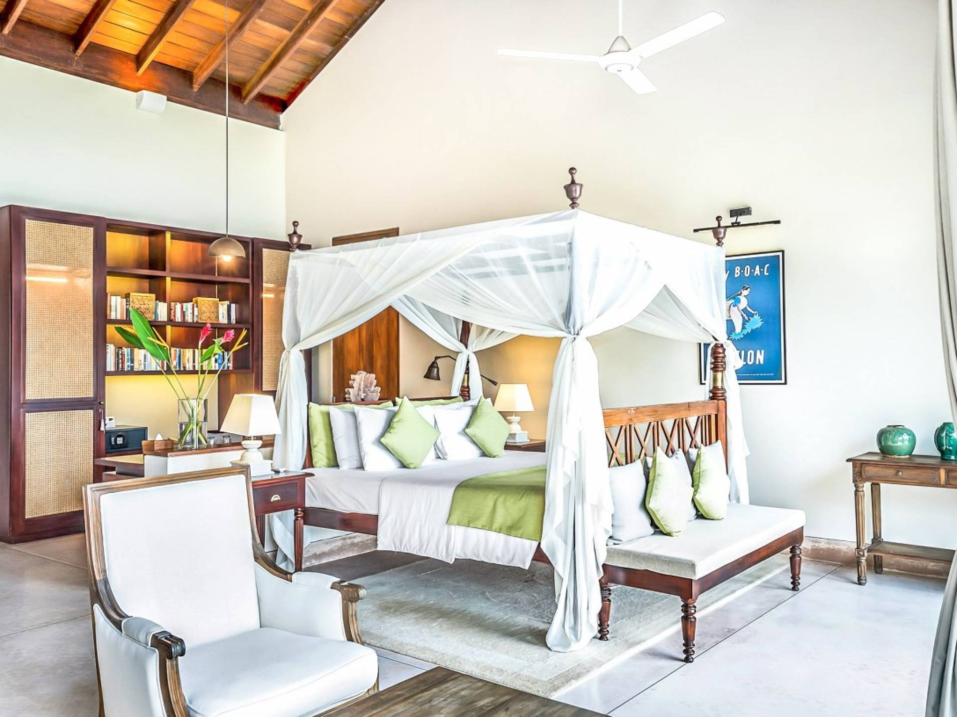 Главная вилла состоит из четырех красивых, просторных и, казалось бы, идентичных спален с отдельными ванными комнатами, оформленных в тематике храма, чая, слона и корицы, и все с видом на очаровательное озеро. В каждом номере есть кондиционер с потолочным вентилятором, кровать размера "king-size" с балдахином, противомоскитная сетка, просторный гардероб, кушетка и письменный стол. Две центральные комнаты соединены между собой, что делает их идеальными для семей с детьми. Все четыре впечатляющие ванные комнаты могут похвастаться крытым душем на открытом воздухе, ванной в помещении и двумя раковинами, а также собственным тропическим садом. Вдоль спален проходит общая открытая смотровая терраса, украшенная плетеными креслами, чтобы вы могли наслаждаться и восхищаться феноменальным озерным мысом с другого уровня.