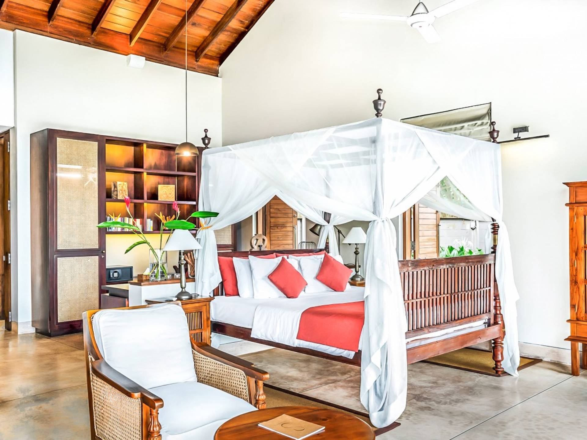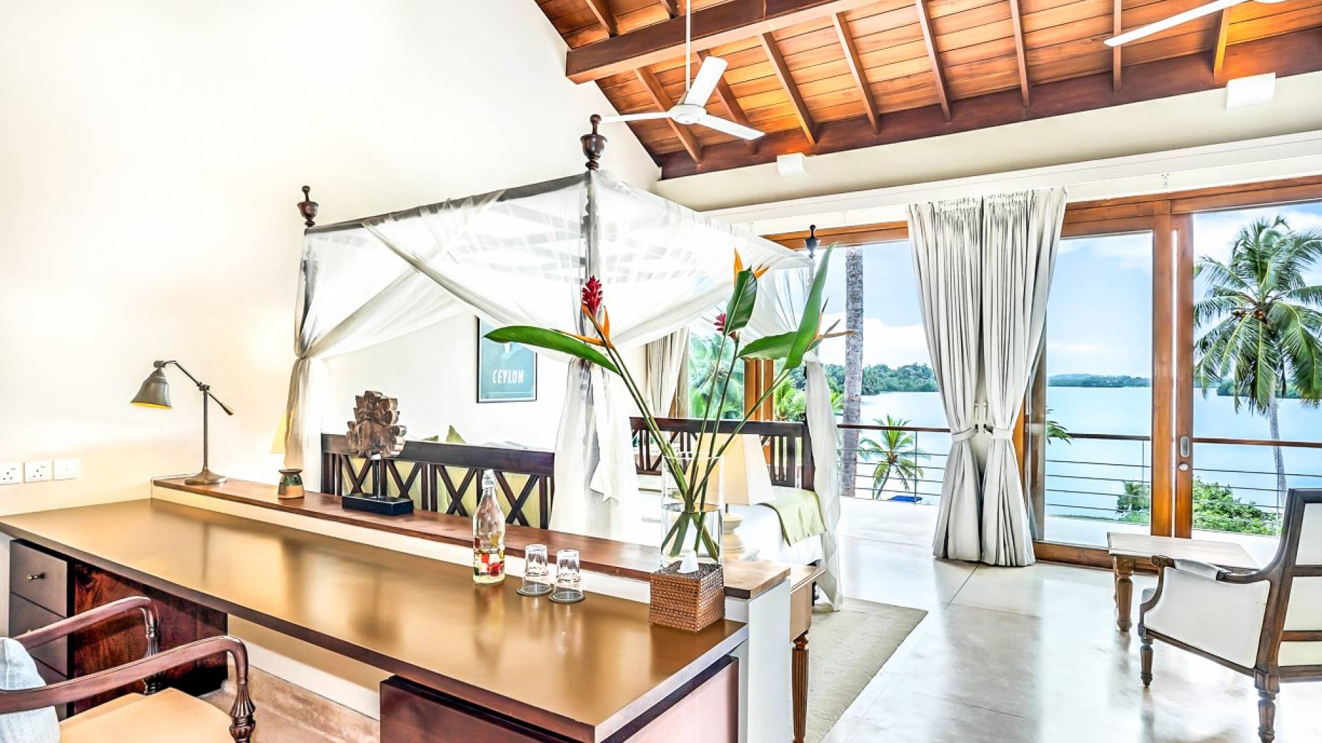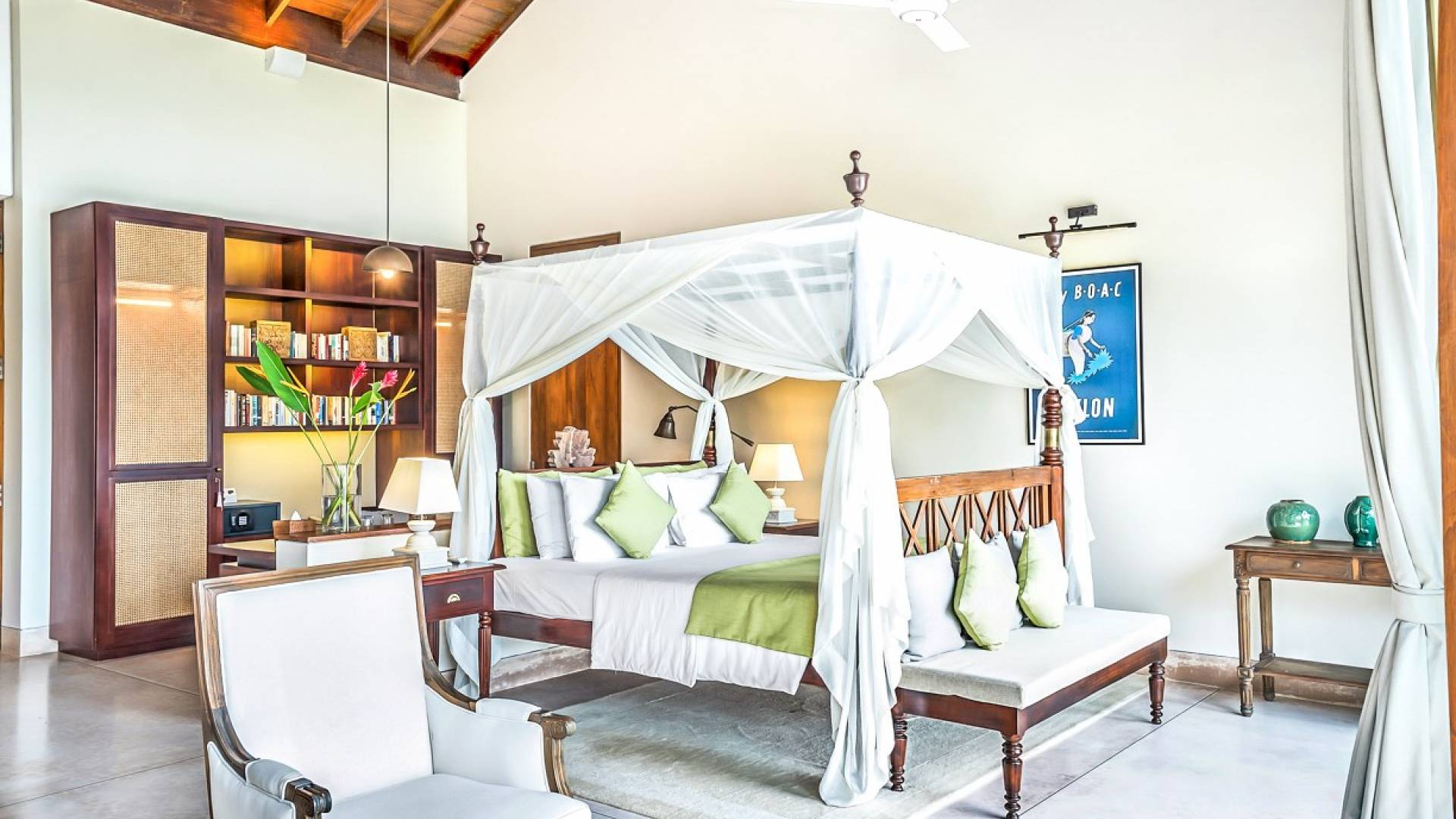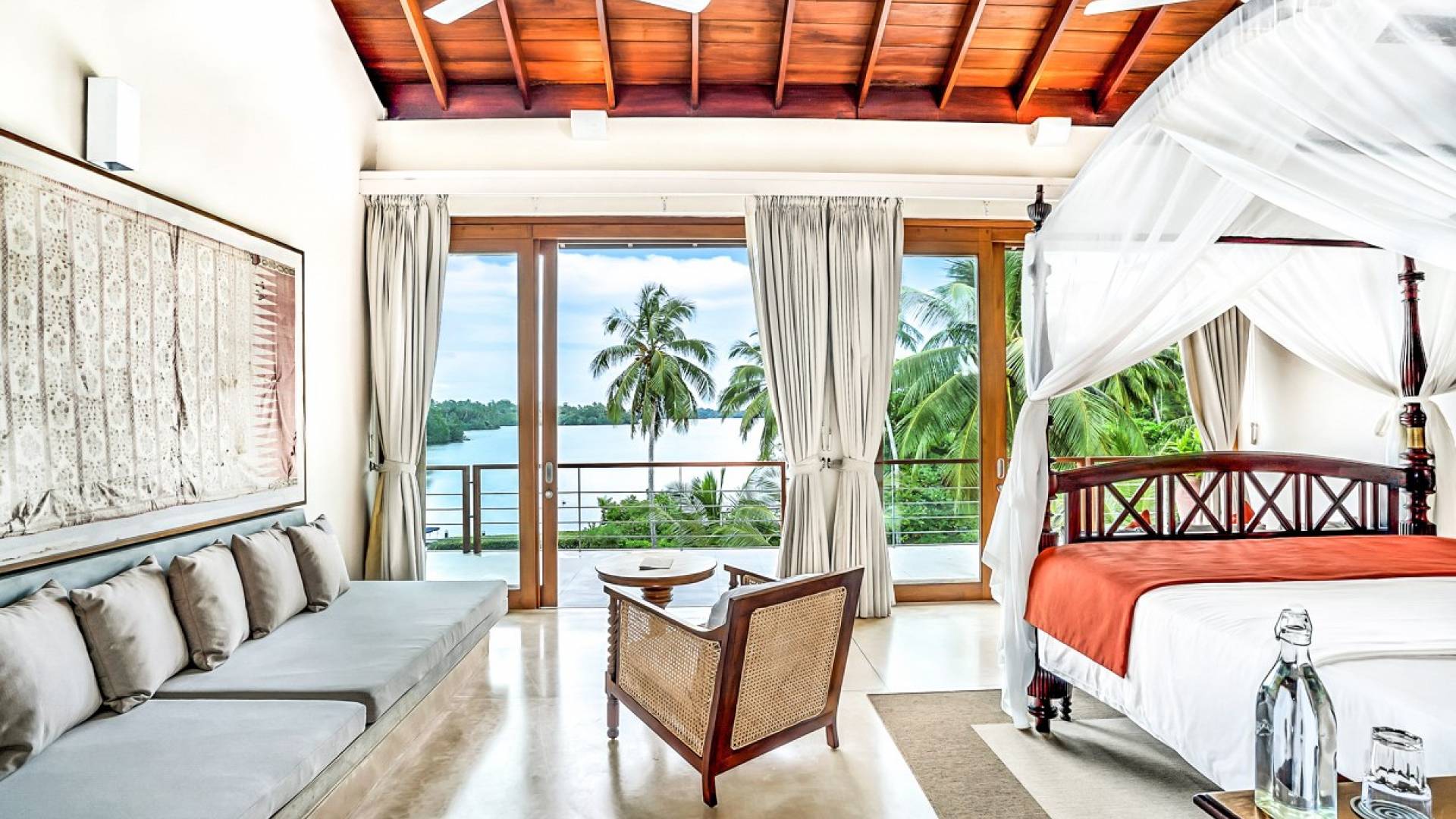 Главная вилла состоит из четырех красивых, просторных и, казалось бы, идентичных спален с отдельными ванными комнатами, оформленных в тематике храма, чая, слона и корицы, и все с видом на очаровательное озеро. В каждом номере есть кондиционер с потолочным вентилятором, кровать размера "king-size" с балдахином, противомоскитная сетка, просторный гардероб, кушетка и письменный стол. Две центральные комнаты соединены между собой, что делает их идеальными для семей с детьми. Все четыре впечатляющие ванные комнаты могут похвастаться крытым душем на открытом воздухе, ванной в помещении и двумя раковинами, а также собственным тропическим садом. Вдоль спален проходит общая открытая смотровая терраса, украшенная плетеными креслами, чтобы вы могли наслаждаться и восхищаться феноменальным озерным мысом с другого уровня.