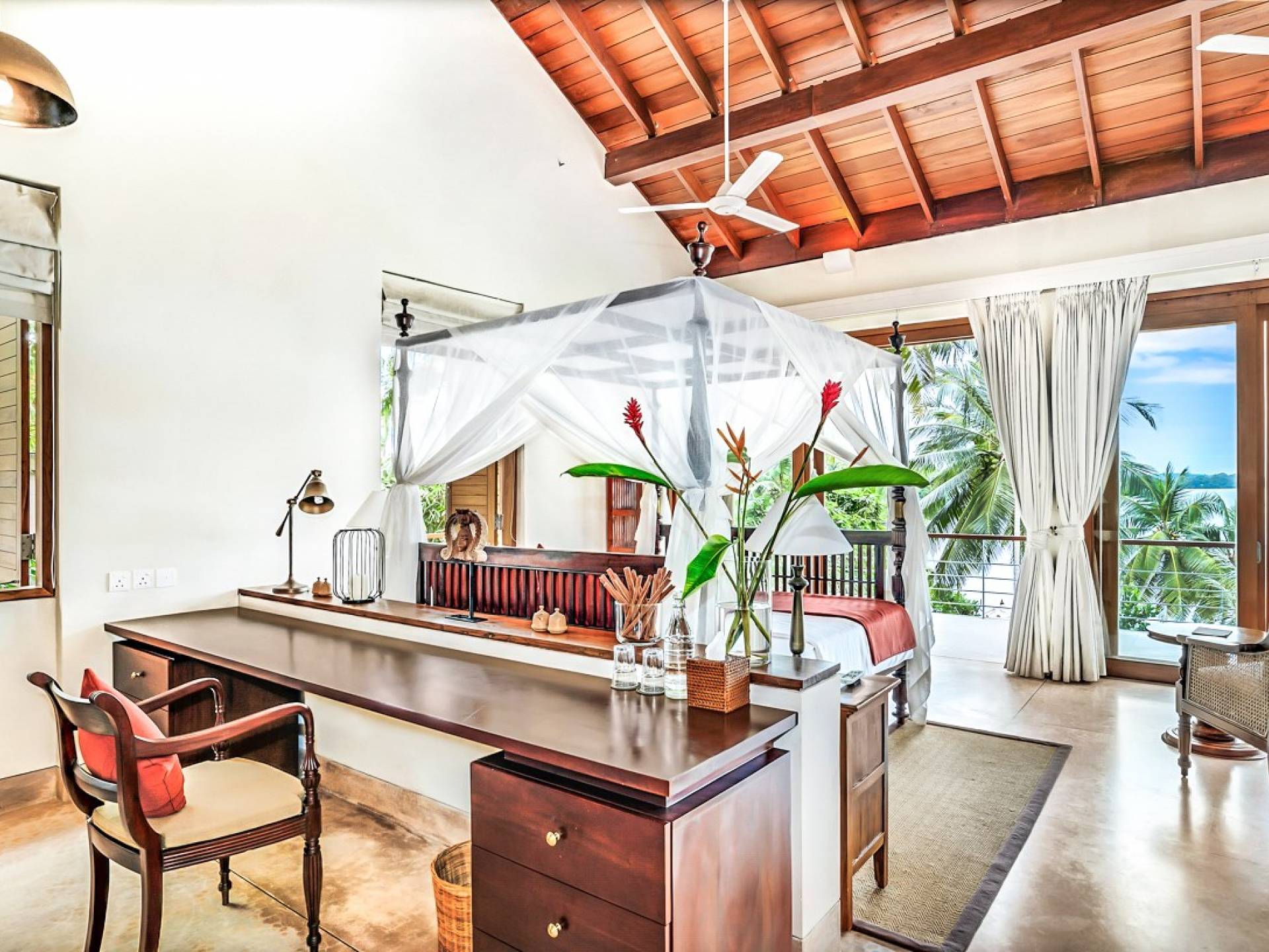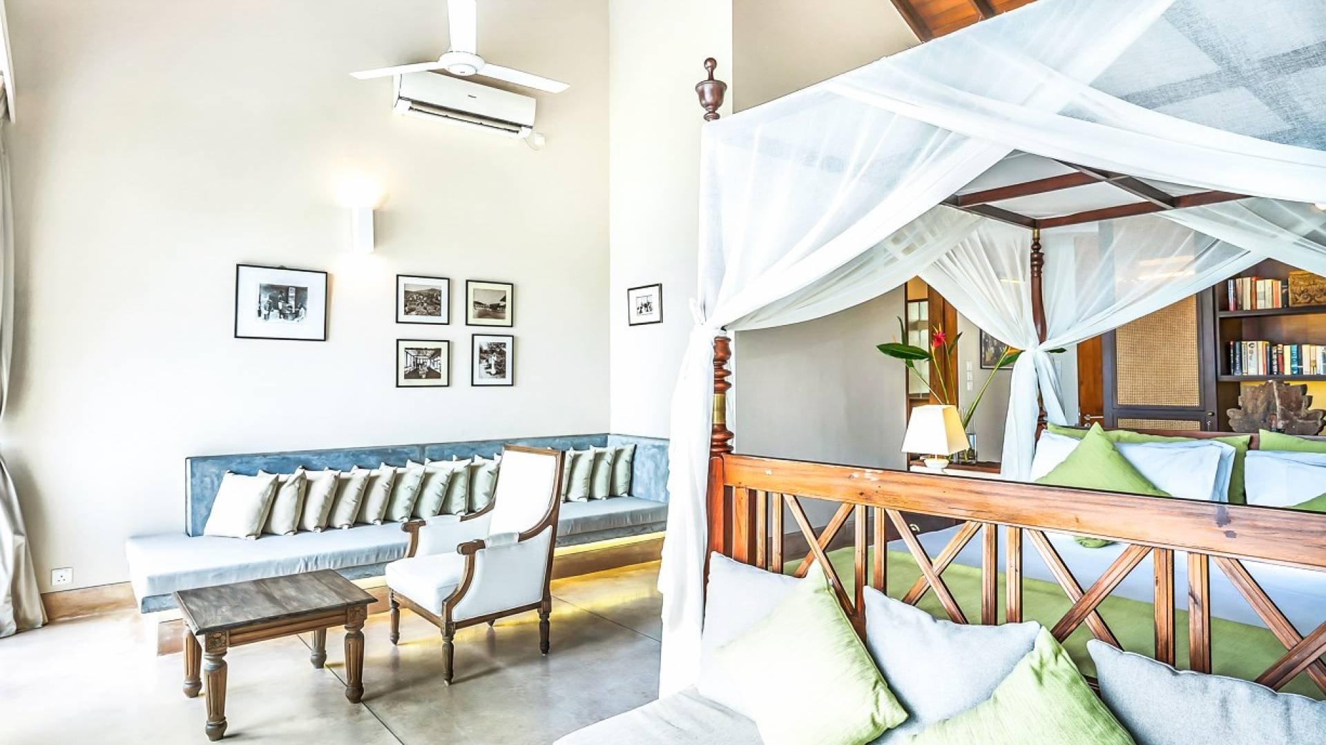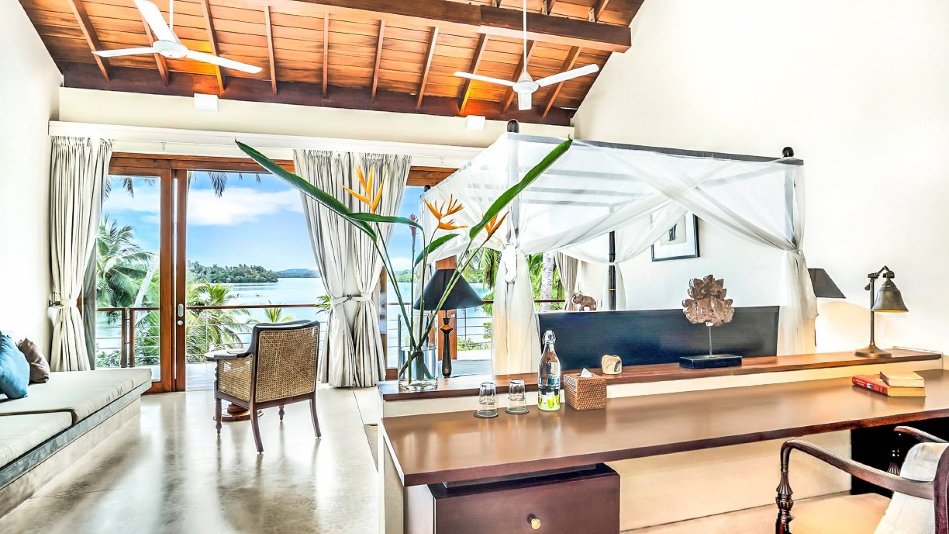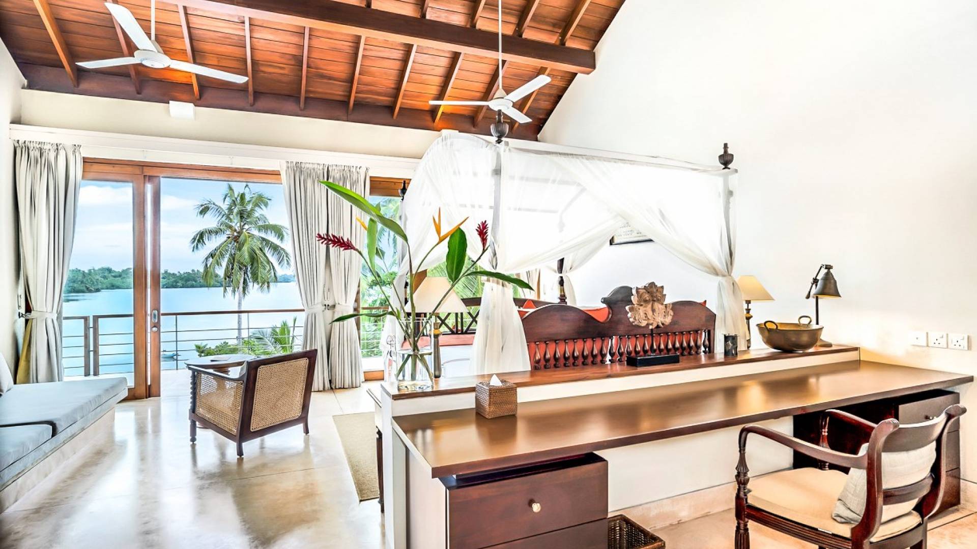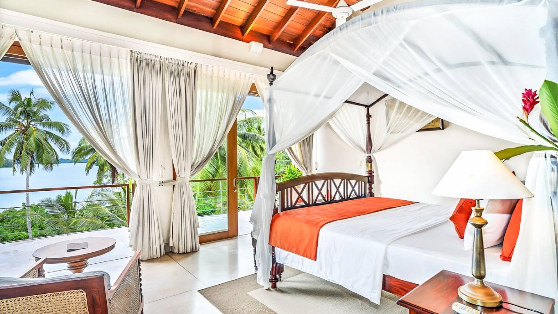Главная вилла состоит из четырех красивых, просторных и, казалось бы, идентичных спален с отдельными ванными комнатами, оформленных в тематике храма, чая, слона и корицы, и все с видом на очаровательное озеро. В каждом номере есть кондиционер с потолочным вентилятором, кровать размера "king-size" с балдахином, противомоскитная сетка, просторный гардероб, кушетка и письменный стол. Две центральные комнаты соединены между собой, что делает их идеальными для семей с детьми. Все четыре впечатляющие ванные комнаты могут похвастаться крытым душем на открытом воздухе, ванной в помещении и двумя раковинами, а также собственным тропическим садом. Вдоль спален проходит общая открытая смотровая терраса, украшенная плетеными креслами, чтобы вы могли наслаждаться и восхищаться феноменальным озерным мысом с другого уровня.