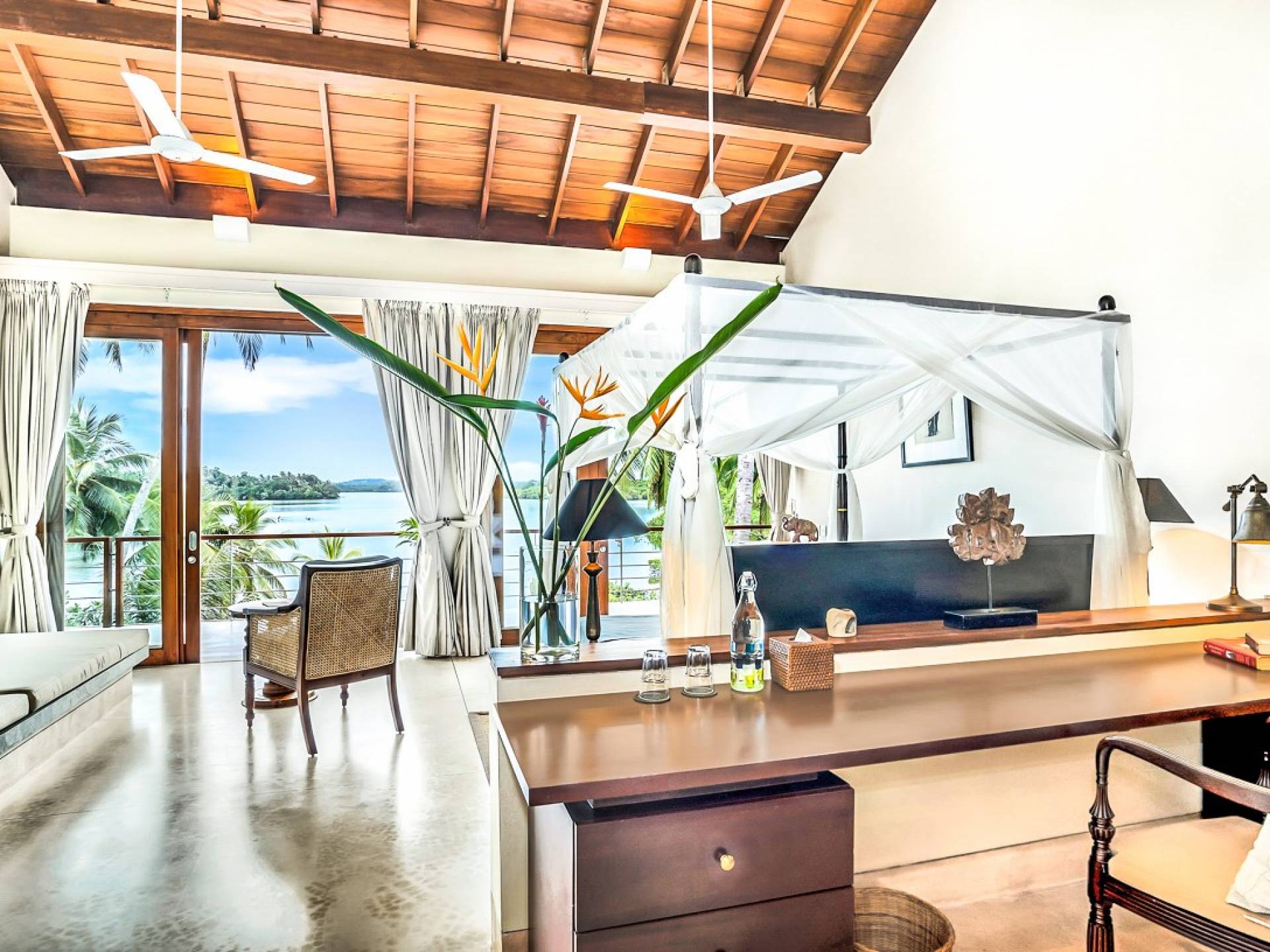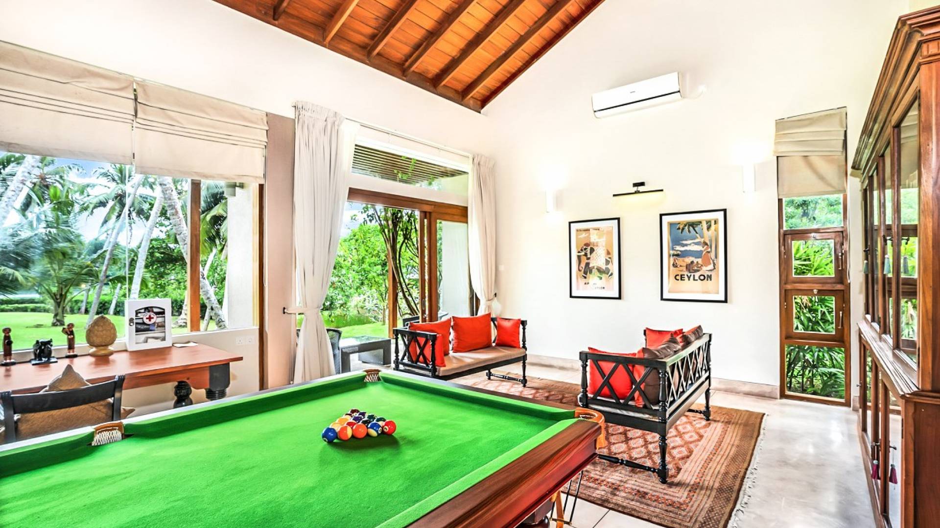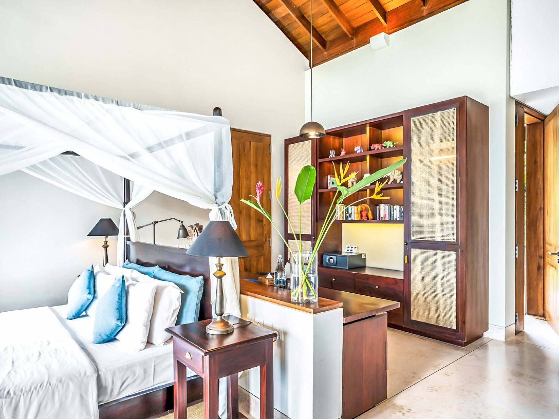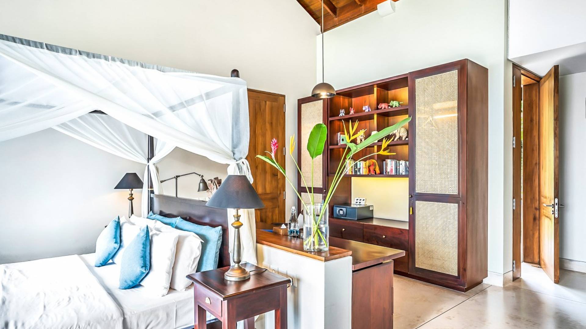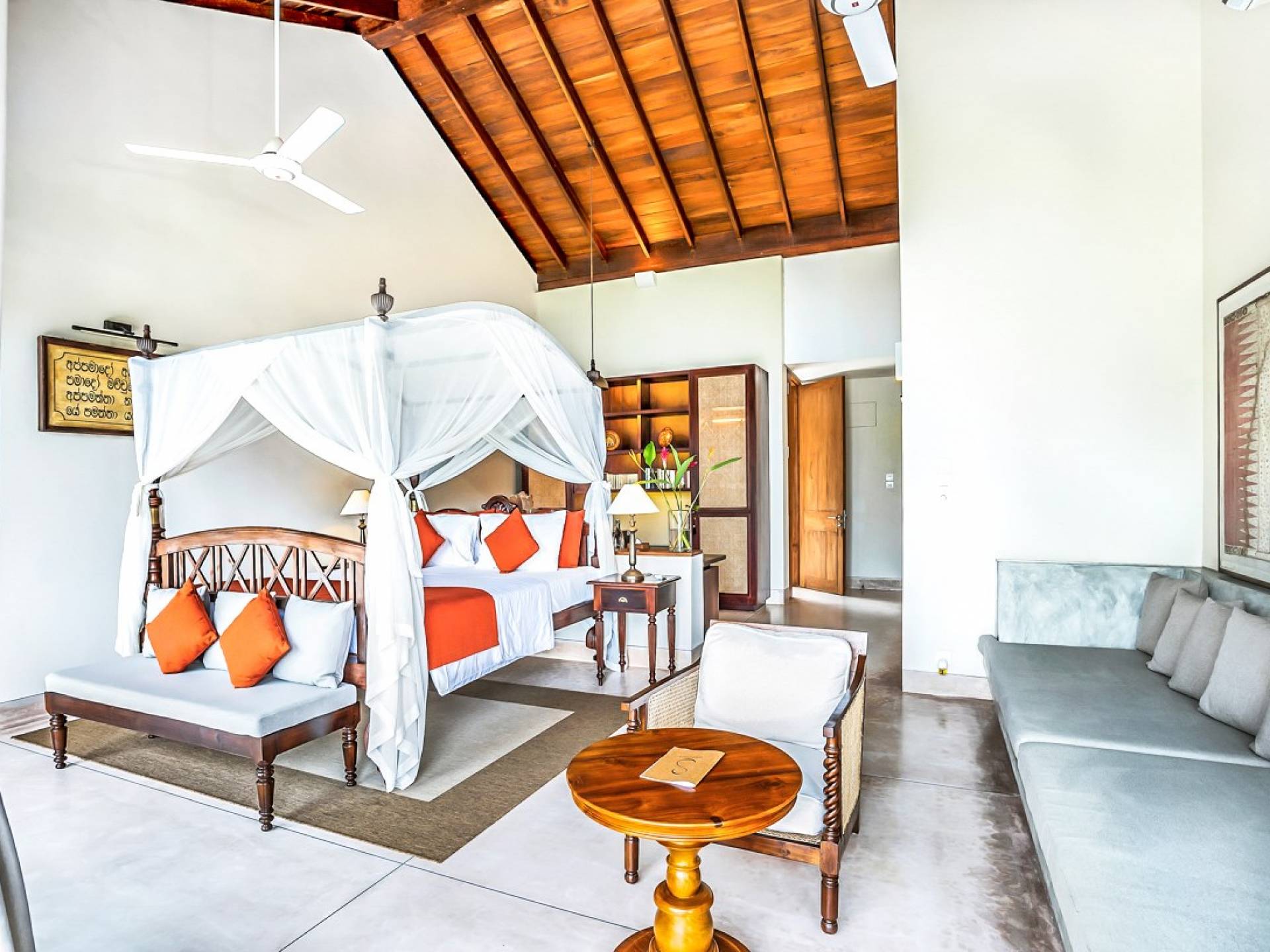 Главная вилла состоит из четырех красивых, просторных и, казалось бы, идентичных спален с отдельными ванными комнатами, оформленных в тематике храма, чая, слона и корицы, и все с видом на очаровательное озеро. В каждом номере есть кондиционер с потолочным вентилятором, кровать размера "king-size" с балдахином, противомоскитная сетка, просторный гардероб, кушетка и письменный стол. Две центральные комнаты соединены между собой, что делает их идеальными для семей с детьми. Все четыре впечатляющие ванные комнаты могут похвастаться крытым душем на открытом воздухе, ванной в помещении и двумя раковинами, а также собственным тропическим садом. Вдоль спален проходит общая открытая смотровая терраса, украшенная плетеными креслами, чтобы вы могли наслаждаться и восхищаться феноменальным озерным мысом с другого уровня.