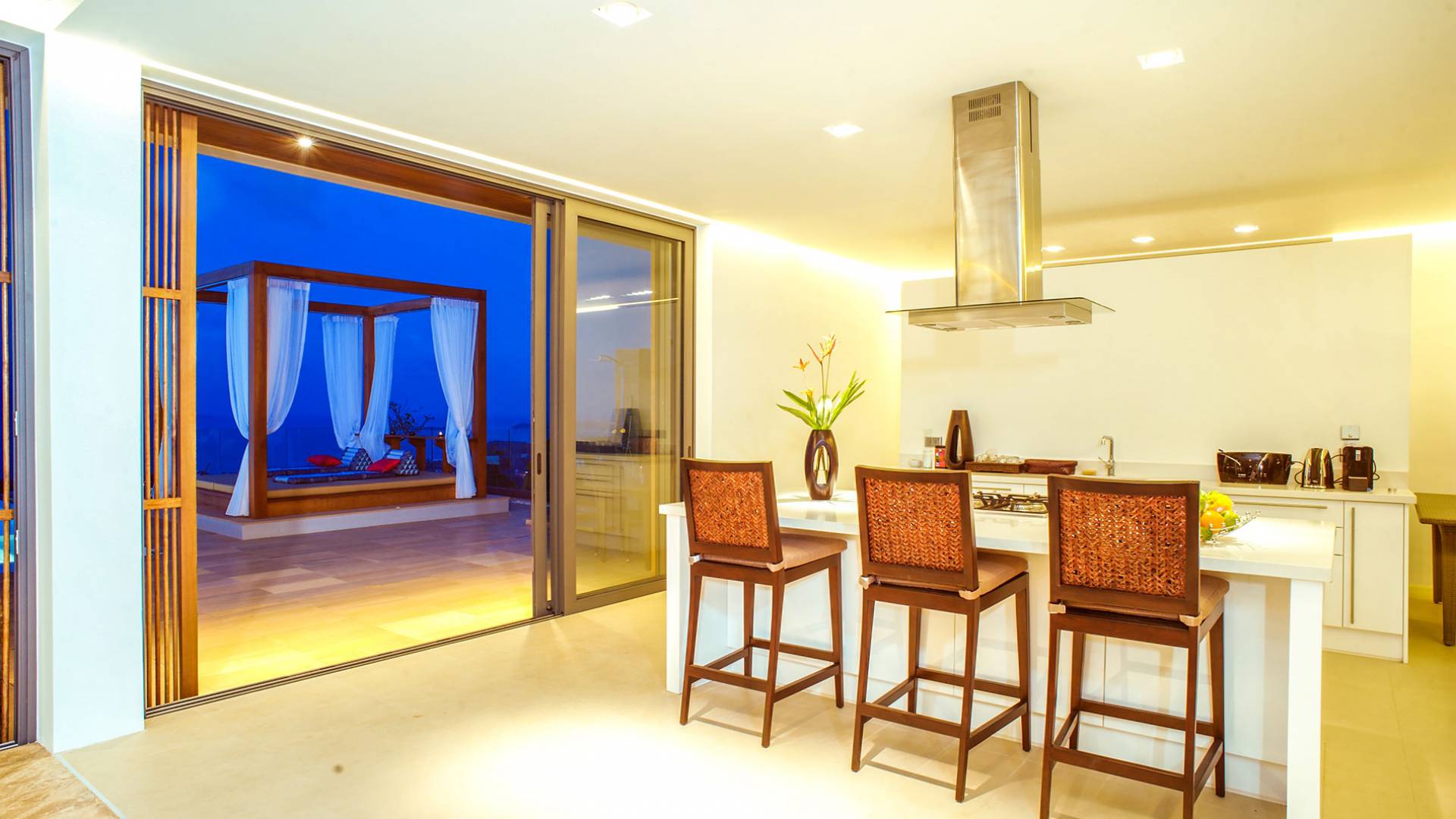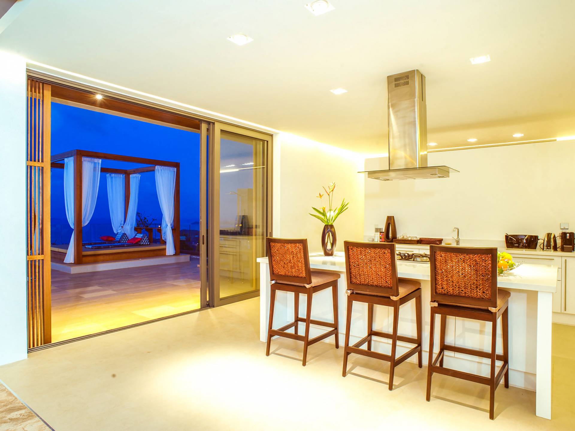 На первом этаже прекрасная жилая площадь 410 квадратных метров способствует развлечениям и общению. Просторная открытая кухня, оснащенная всей современной бытовой техникой, идеально подходит для праздничного приготовления пищи, а ее центральный островной стол также является барной стойкой с высокими стульями. В столовой вы будете окружены звуком и светом от восьмиметровой стены водопада. С другой стороны виллы, за лестницей из пурпурного стекла, бильярдом и кабинетом, вы попадаете в удобную гостиную с потрясающим панорамным видом. На террасе из песчаника вокруг бассейна есть обеденный стол и шезлонги для каждого гостя. Пейзажный бассейн высотой 12 метров свисает с невероятно бирюзовой водой. Джакузи у бассейна позволяет развлечь обоих друзей, загорая в соседней беседке или наслаждаясь бассейном.