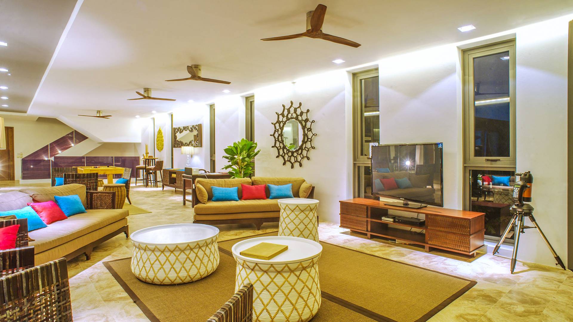 Небольшой мостик, окаймленный зеленью, ведет к главному входу виллы, где вас встречает большой зал. Внушительный объем Crystal Blue Villa Samui дает ощущение свободы и комфорта.