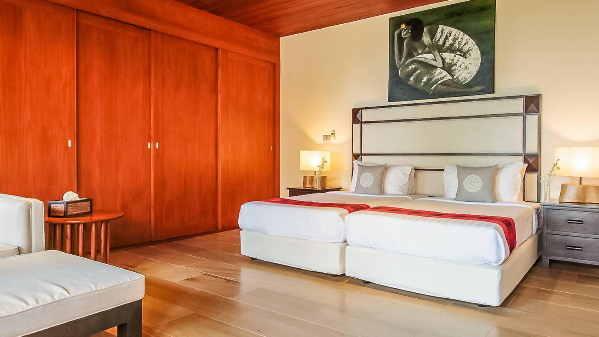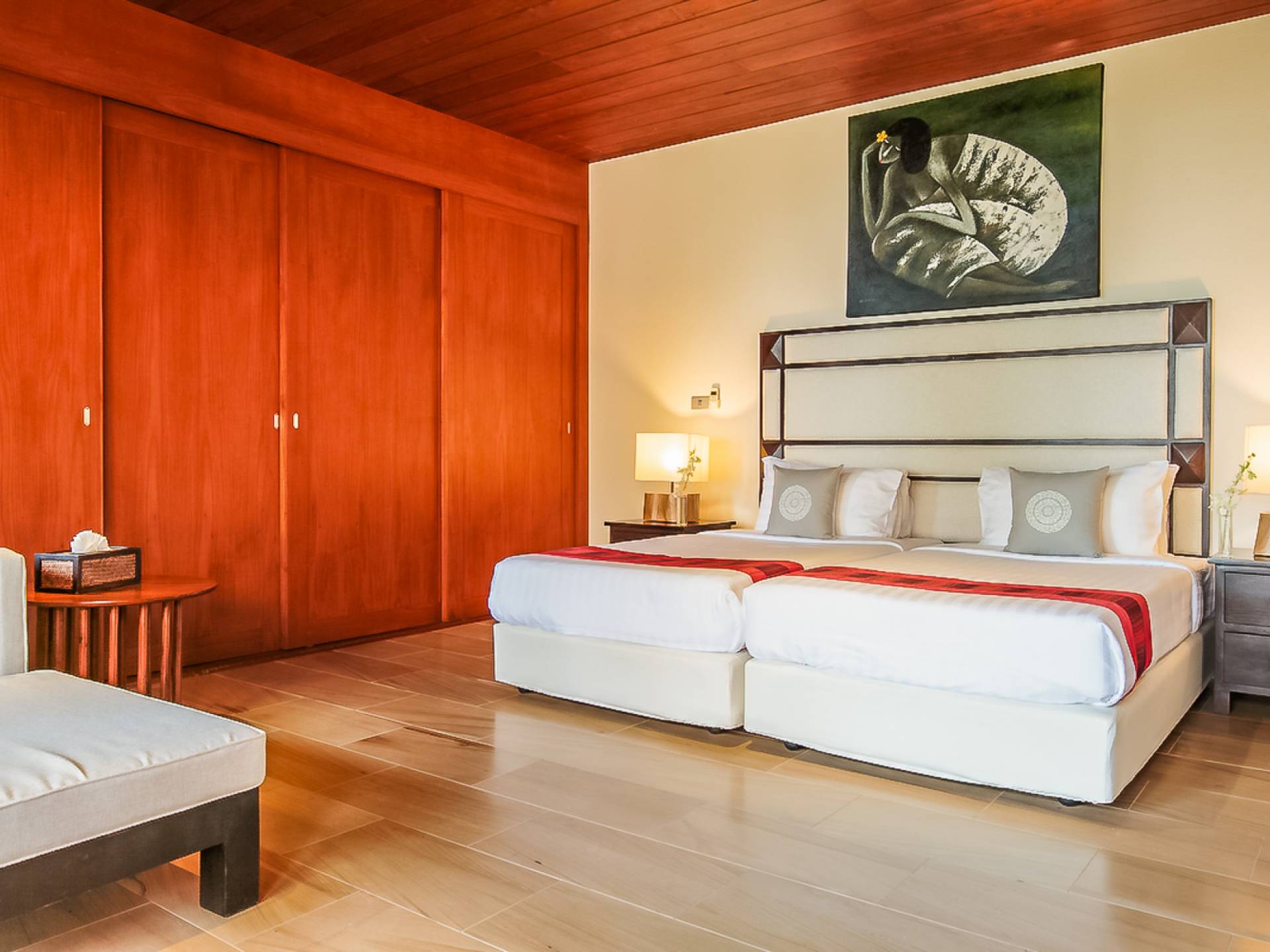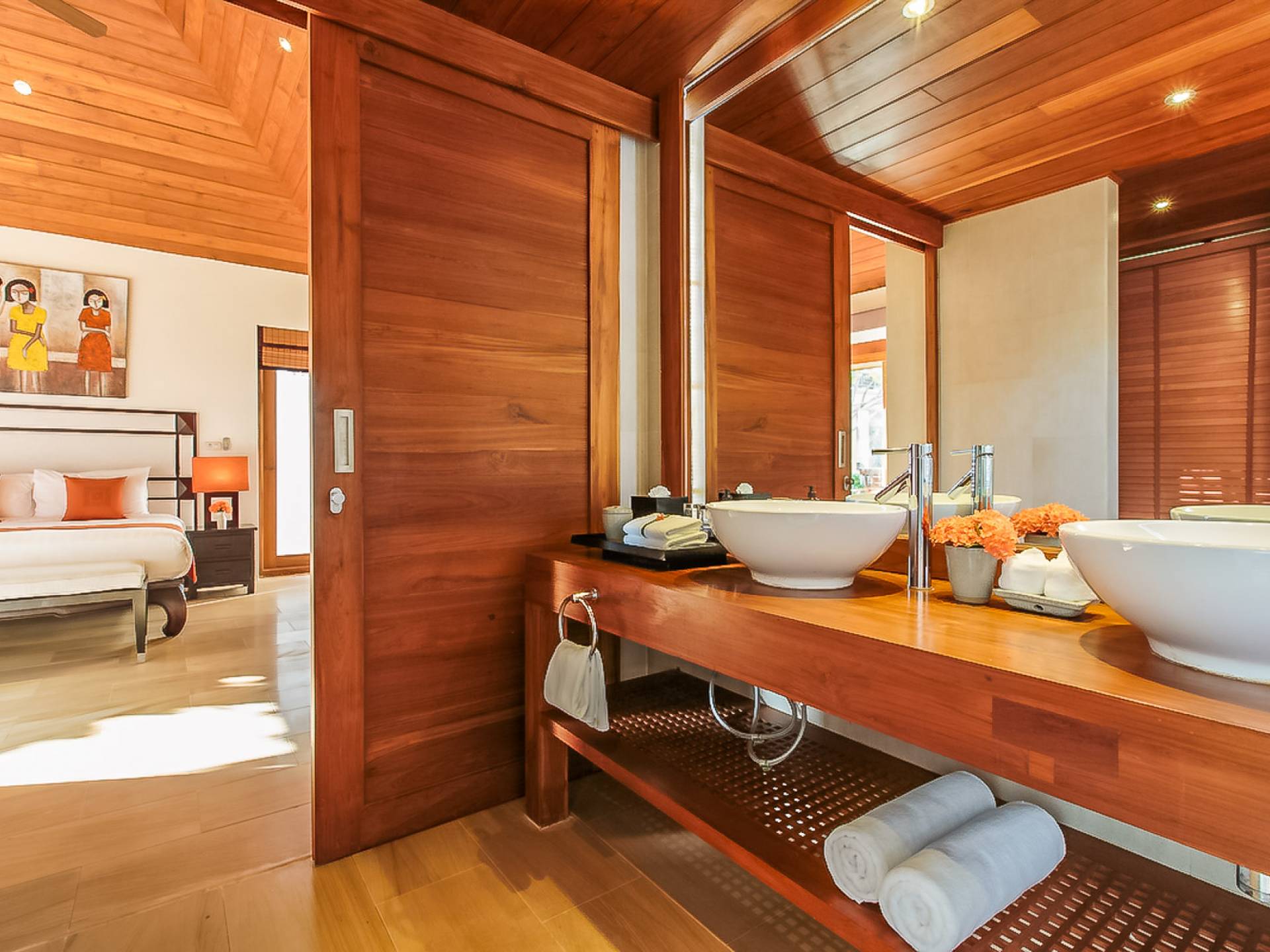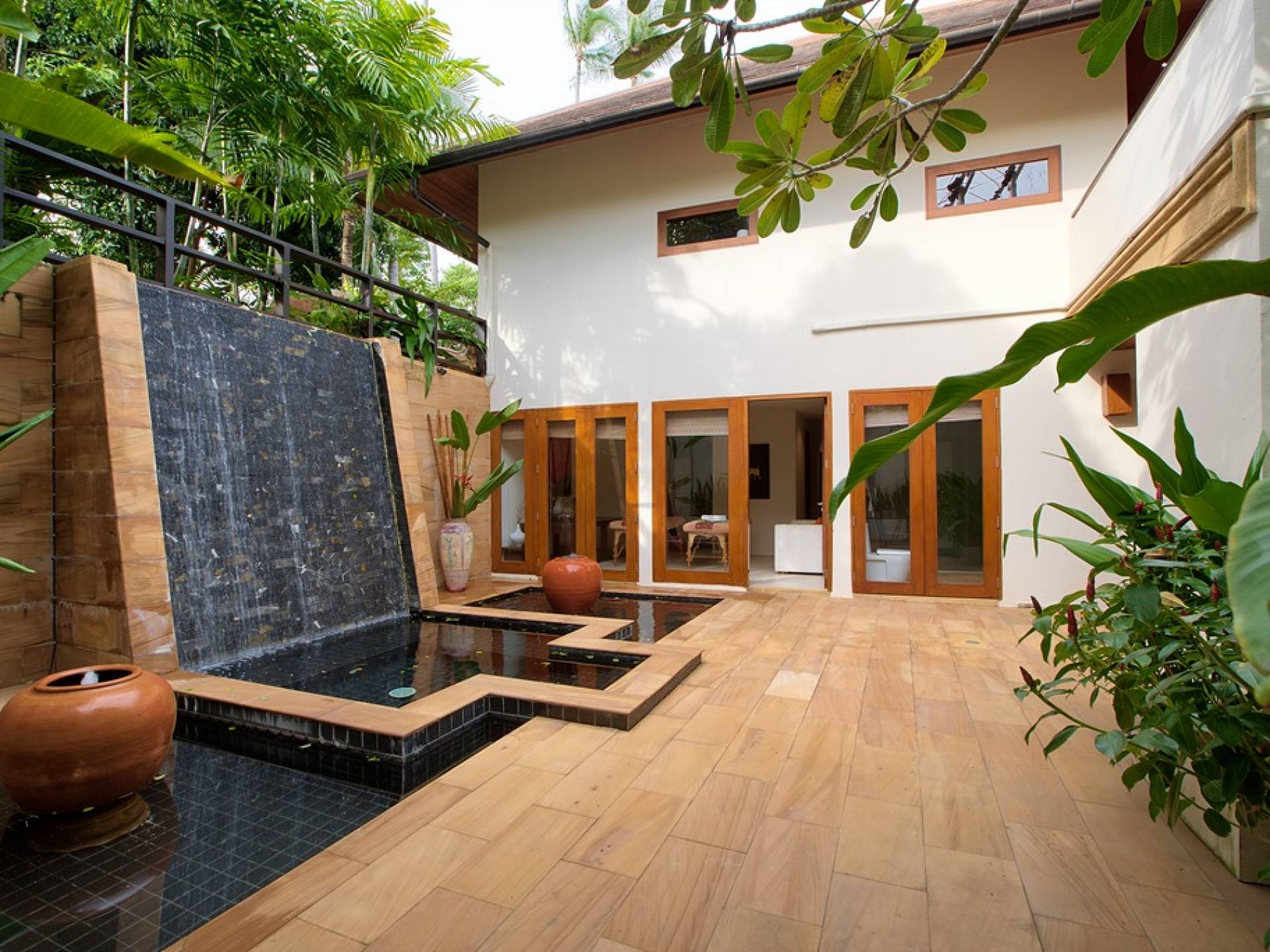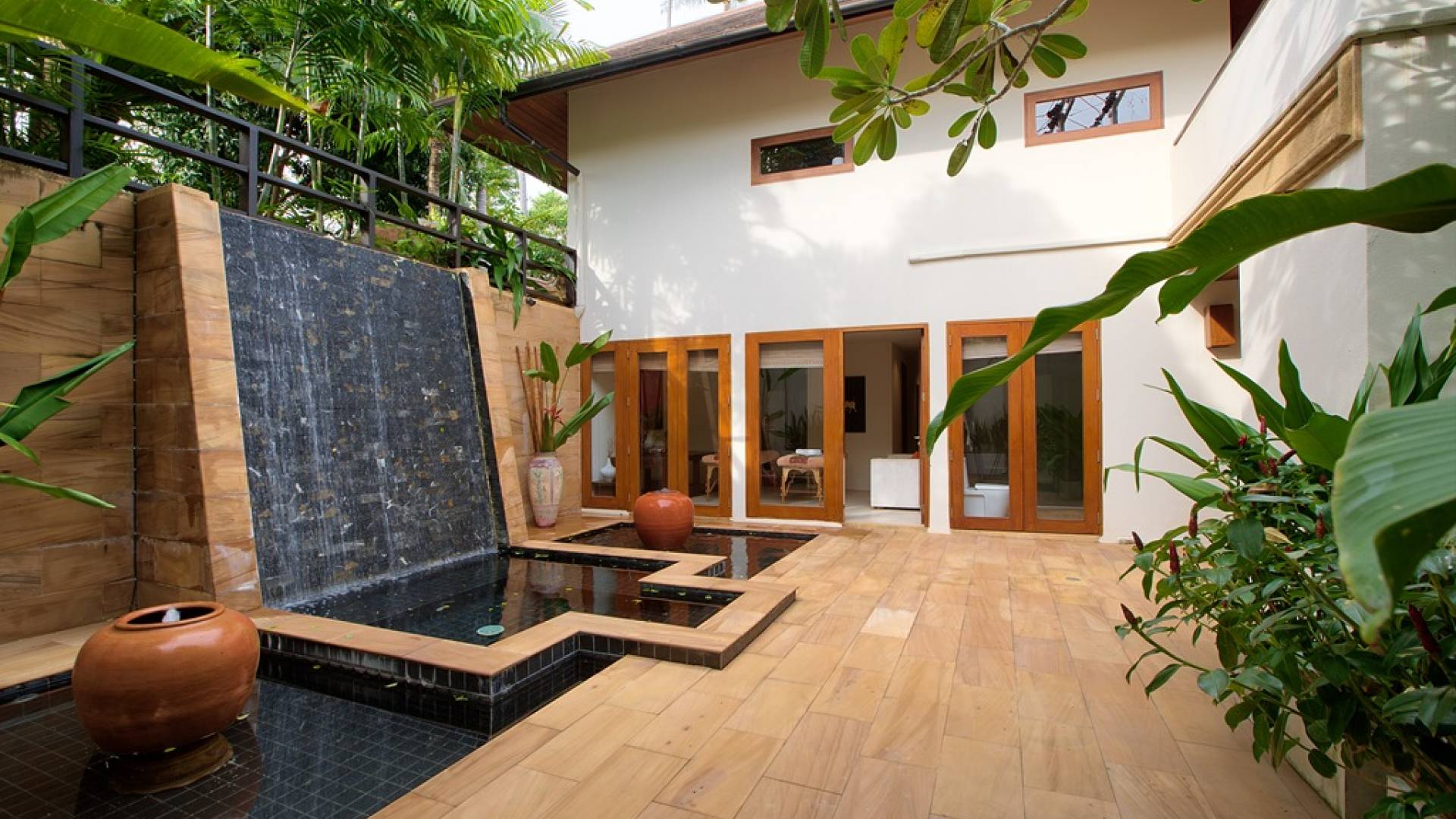 Вы покидаете это место через большой крытый балкон и спускаетесь на первый этаж по лестнице, выходящей на водопад, который впадает во внутренний двор внизу. Этот уровень содержит 6 спален, состоящих из 3 разных стилей (по 2 спальни на каждый дизайн). Все спальни имеют конфигурацию двуспальных кроватей (кровати размера «king-size»), оснащены ванными комнатами с большими душевыми кабинами и ваннами, а также телевизором / DVD-плеером с индивидуальными модулями спутникового телевидения. На первом этаже главного здания находятся спальни 5 и 6, а также парная. Далее по саду идут еще четыре индивидуальных спальных павильона. Спальни 3 и 4 - первые две по обе стороны от центральной лужайки и оснащены дополнительным душем на открытом воздухе в собственном частном дворе. Спальни 1 и 2 - это главные спальни и самые большие из них с дополнительным преимуществом в виде собственных стереосистем объемного звучания, которые можно изолировать от системы в главном доме.