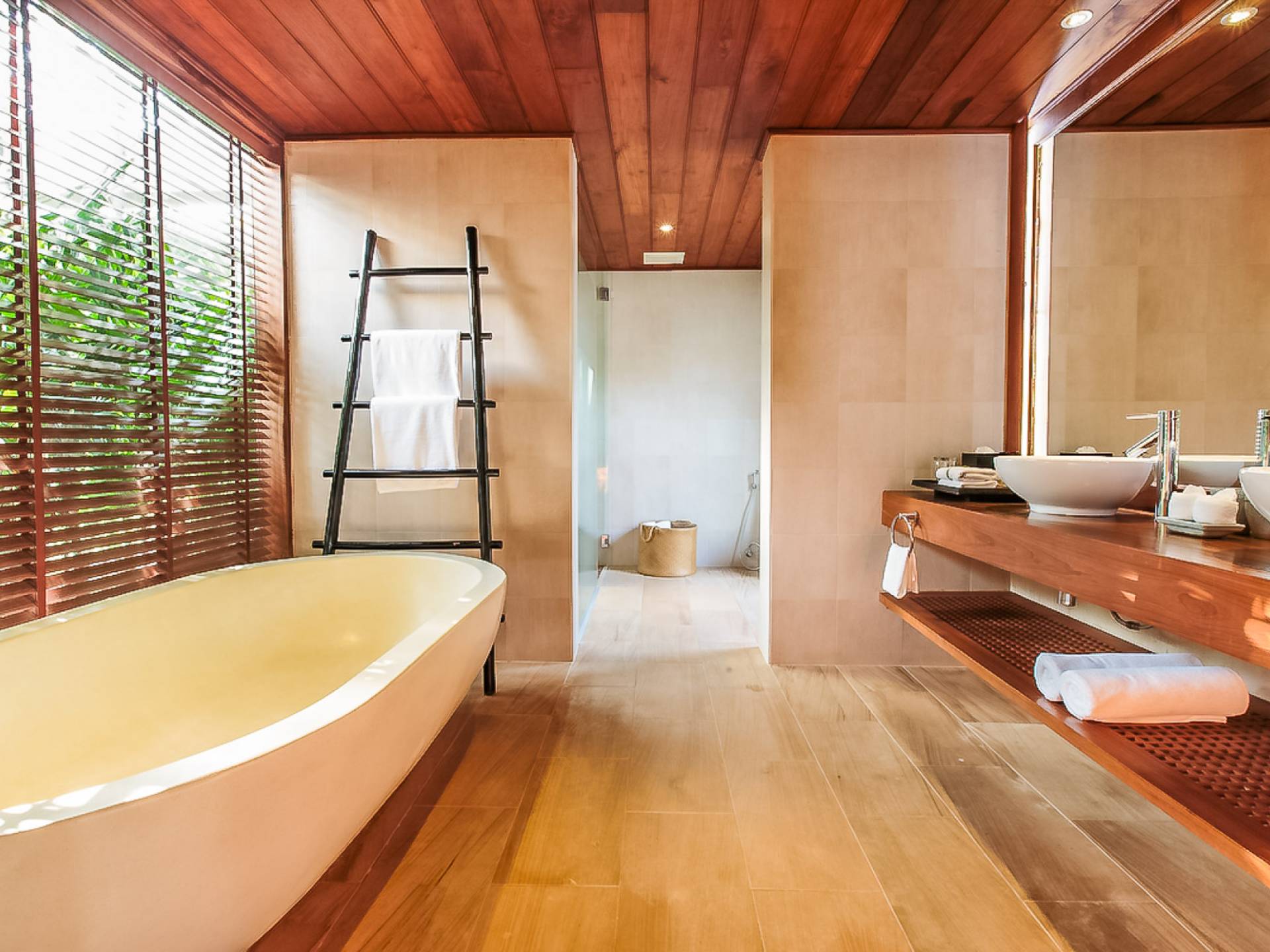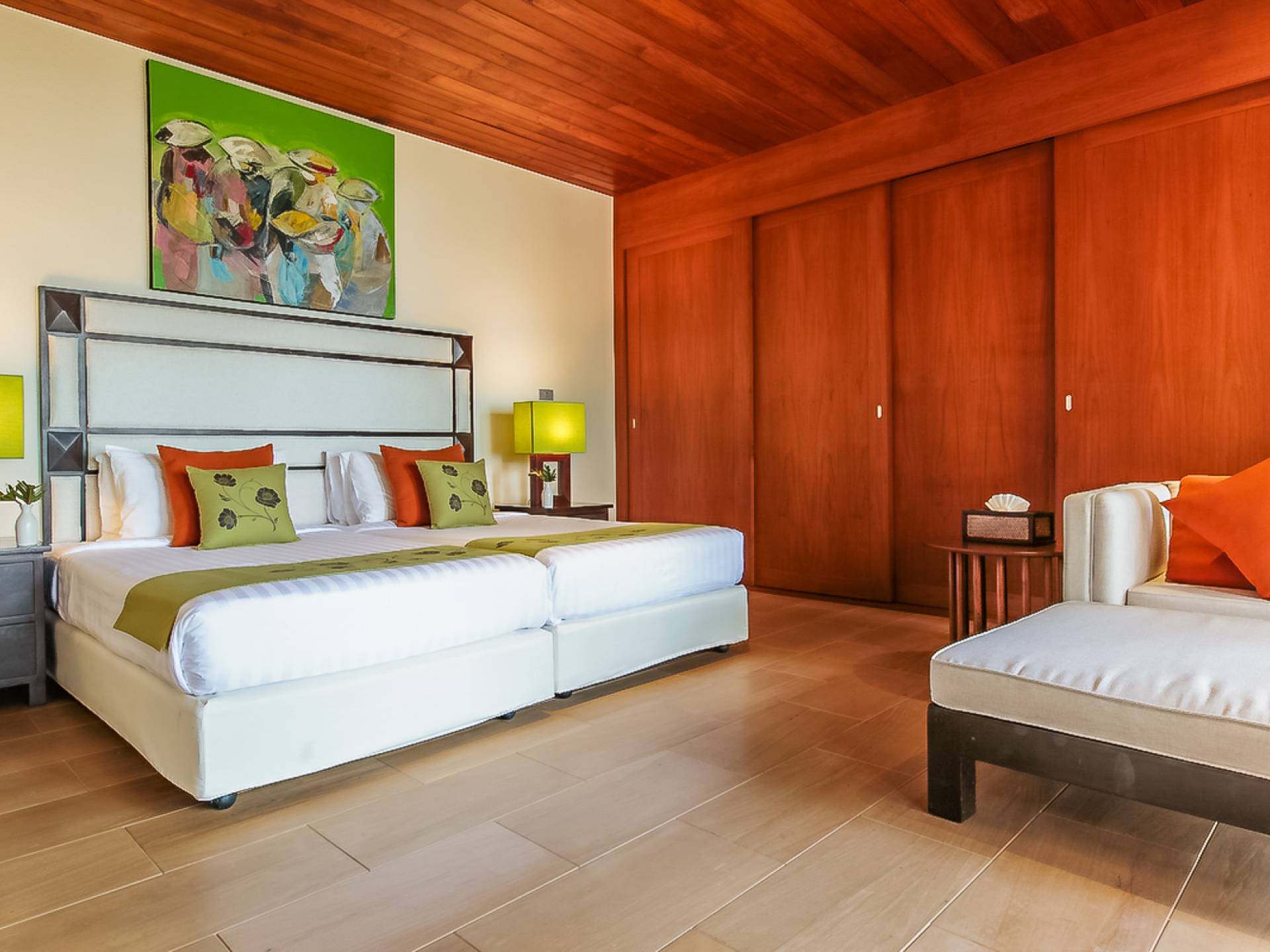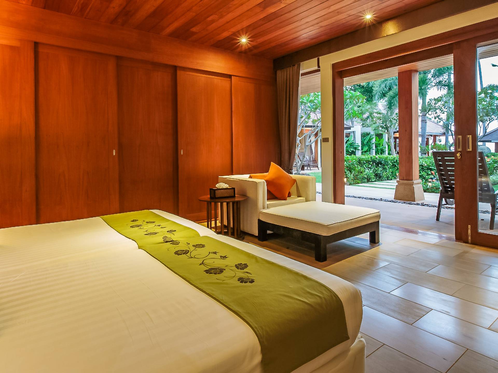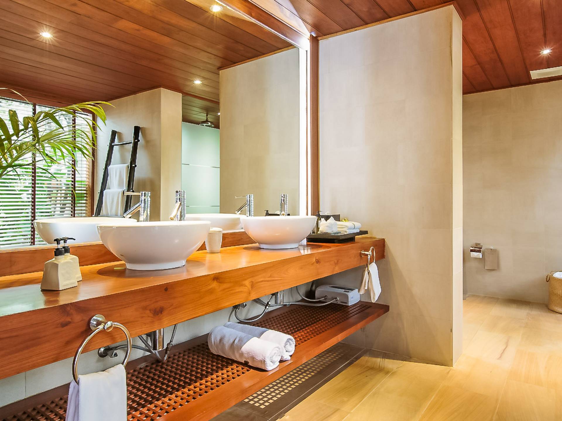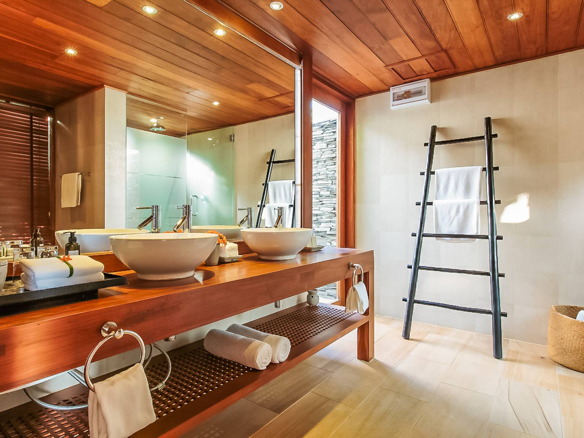 Вы покидаете это место через большой крытый балкон и спускаетесь на первый этаж по лестнице, выходящей на водопад, который впадает во внутренний двор внизу. Этот уровень содержит 6 спален, состоящих из 3 разных стилей (по 2 спальни на каждый дизайн). Все спальни имеют конфигурацию двуспальных кроватей (кровати размера «king-size»), оснащены ванными комнатами с большими душевыми кабинами и ваннами, а также телевизором / DVD-плеером с индивидуальными модулями спутникового телевидения. На первом этаже главного здания находятся спальни 5 и 6, а также парная. Далее по саду идут еще четыре индивидуальных спальных павильона. Спальни 3 и 4 - первые две по обе стороны от центральной лужайки и оснащены дополнительным душем на открытом воздухе в собственном частном дворе. Спальни 1 и 2 - это главные спальни и самые большие из них с дополнительным преимуществом в виде собственных стереосистем объемного звучания, которые можно изолировать от системы в главном доме.