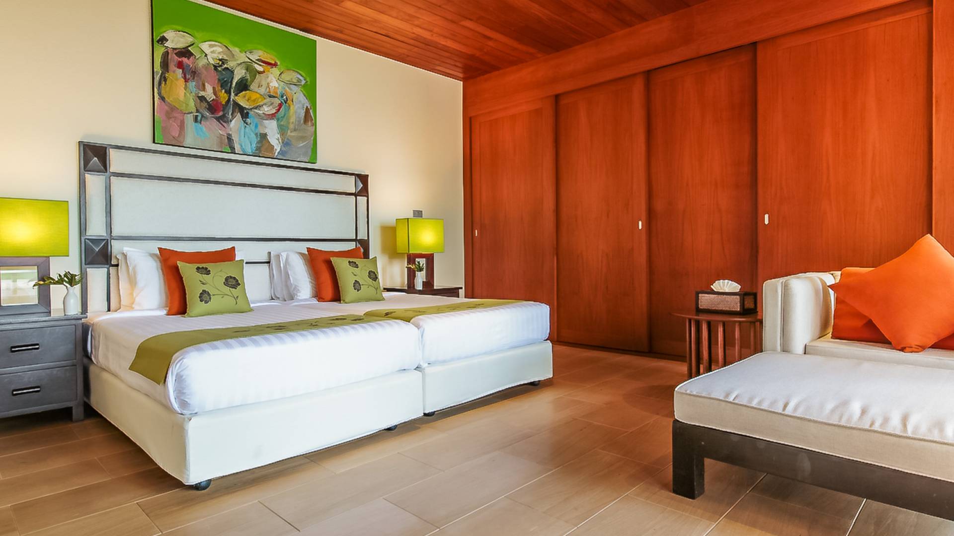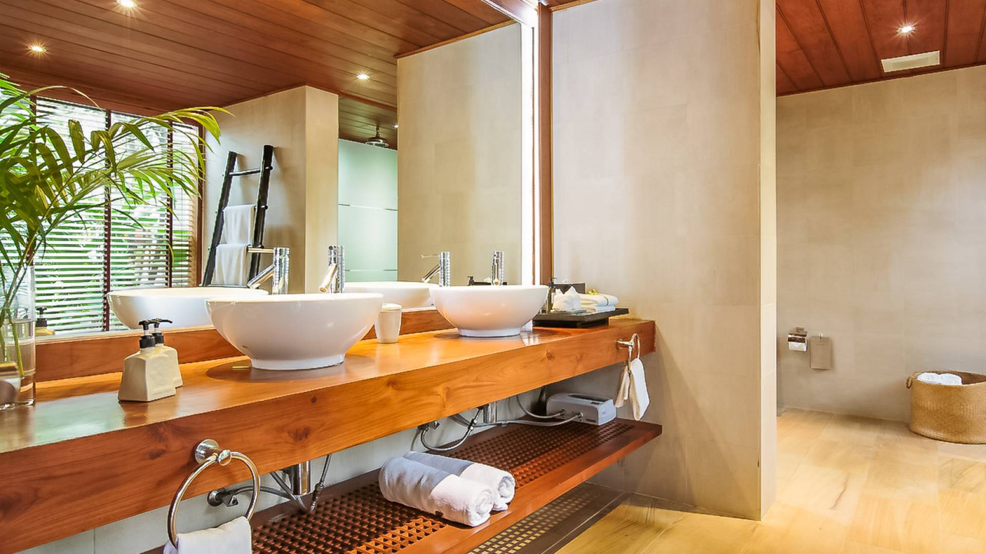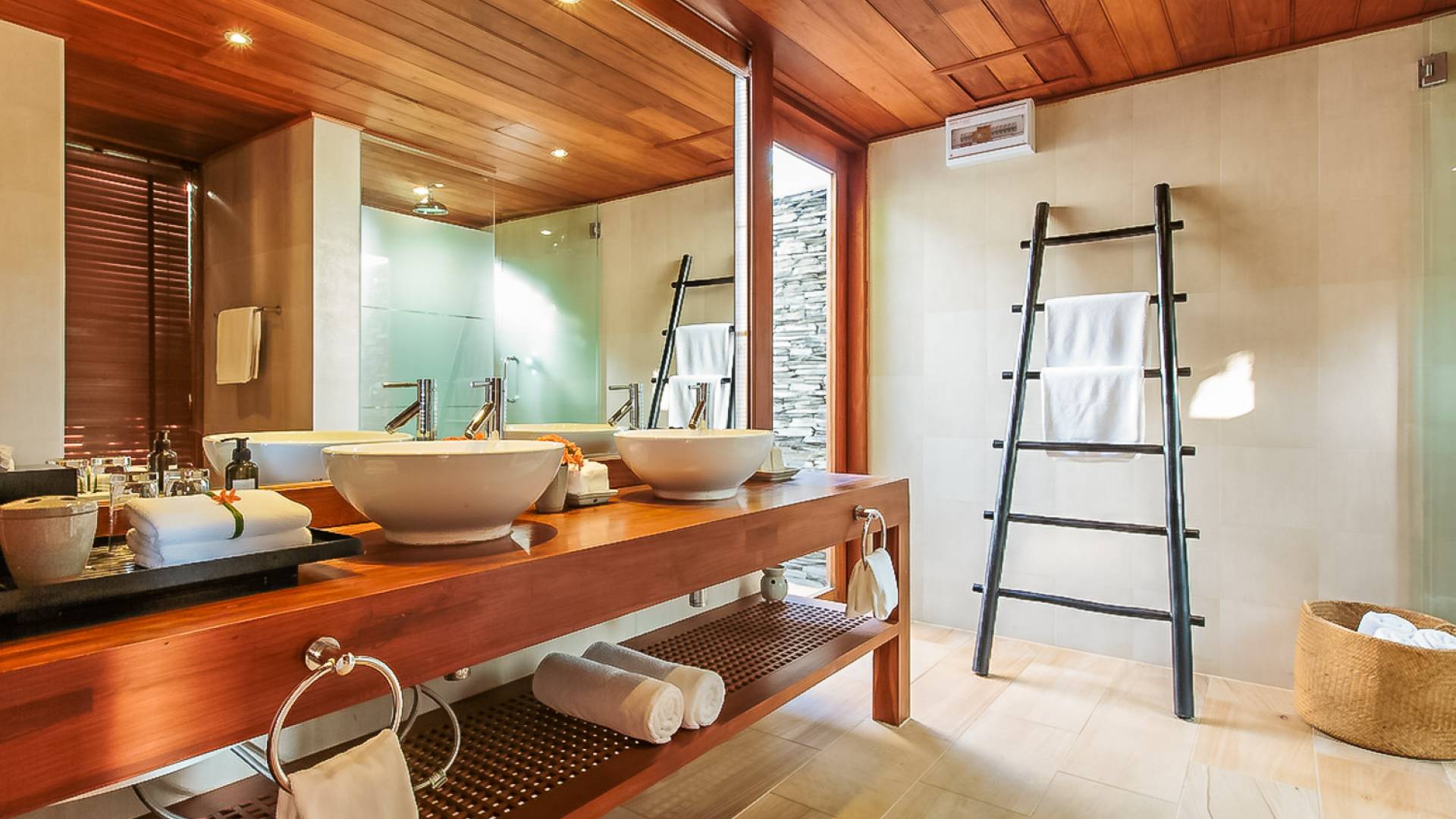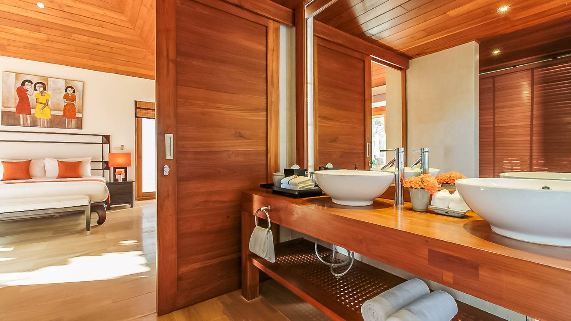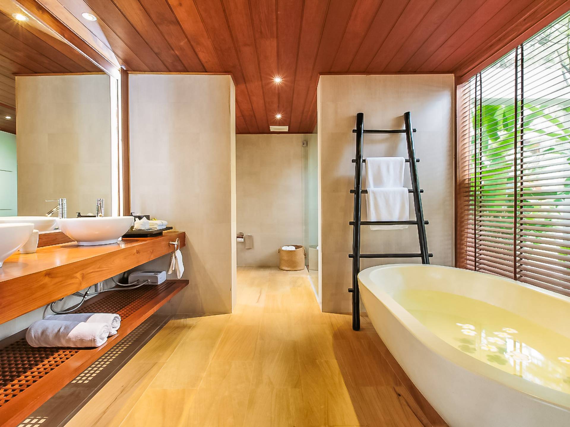 Вы покидаете это место через большой крытый балкон и спускаетесь на первый этаж по лестнице, выходящей на водопад, который впадает во внутренний двор внизу. Этот уровень содержит 6 спален, состоящих из 3 разных стилей (по 2 спальни на каждый дизайн). Все спальни имеют конфигурацию двуспальных кроватей (кровати размера «king-size»), оснащены ванными комнатами с большими душевыми кабинами и ваннами, а также телевизором / DVD-плеером с индивидуальными модулями спутникового телевидения. На первом этаже главного здания находятся спальни 5 и 6, а также парная. Далее по саду идут еще четыре индивидуальных спальных павильона. Спальни 3 и 4 - первые две по обе стороны от центральной лужайки и оснащены дополнительным душем на открытом воздухе в собственном частном дворе. Спальни 1 и 2 - это главные спальни и самые большие из них с дополнительным преимуществом в виде собственных стереосистем объемного звучания, которые можно изолировать от системы в главном доме.