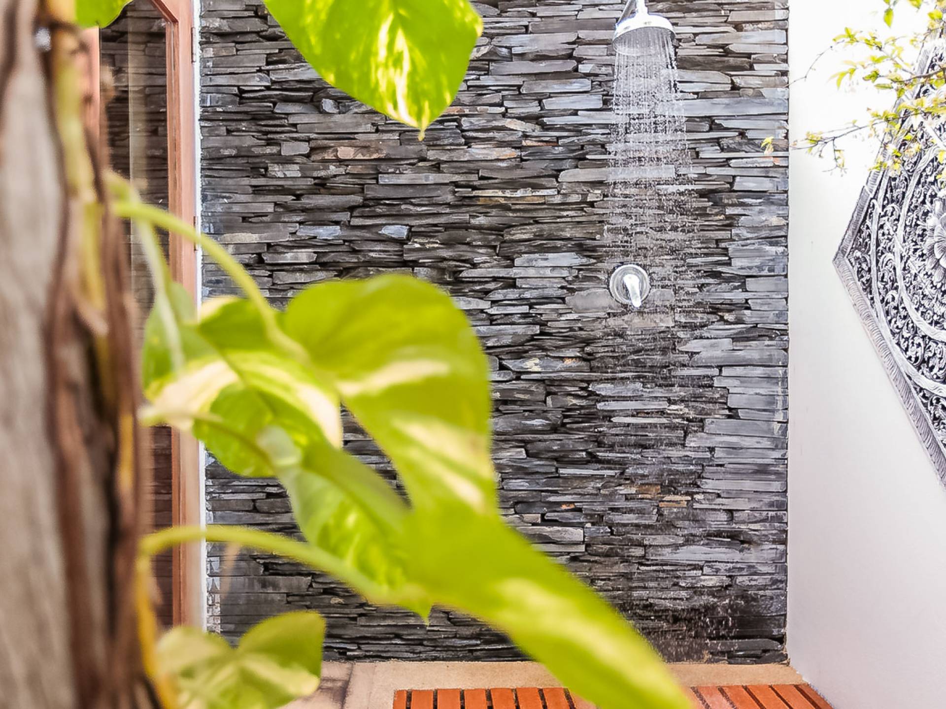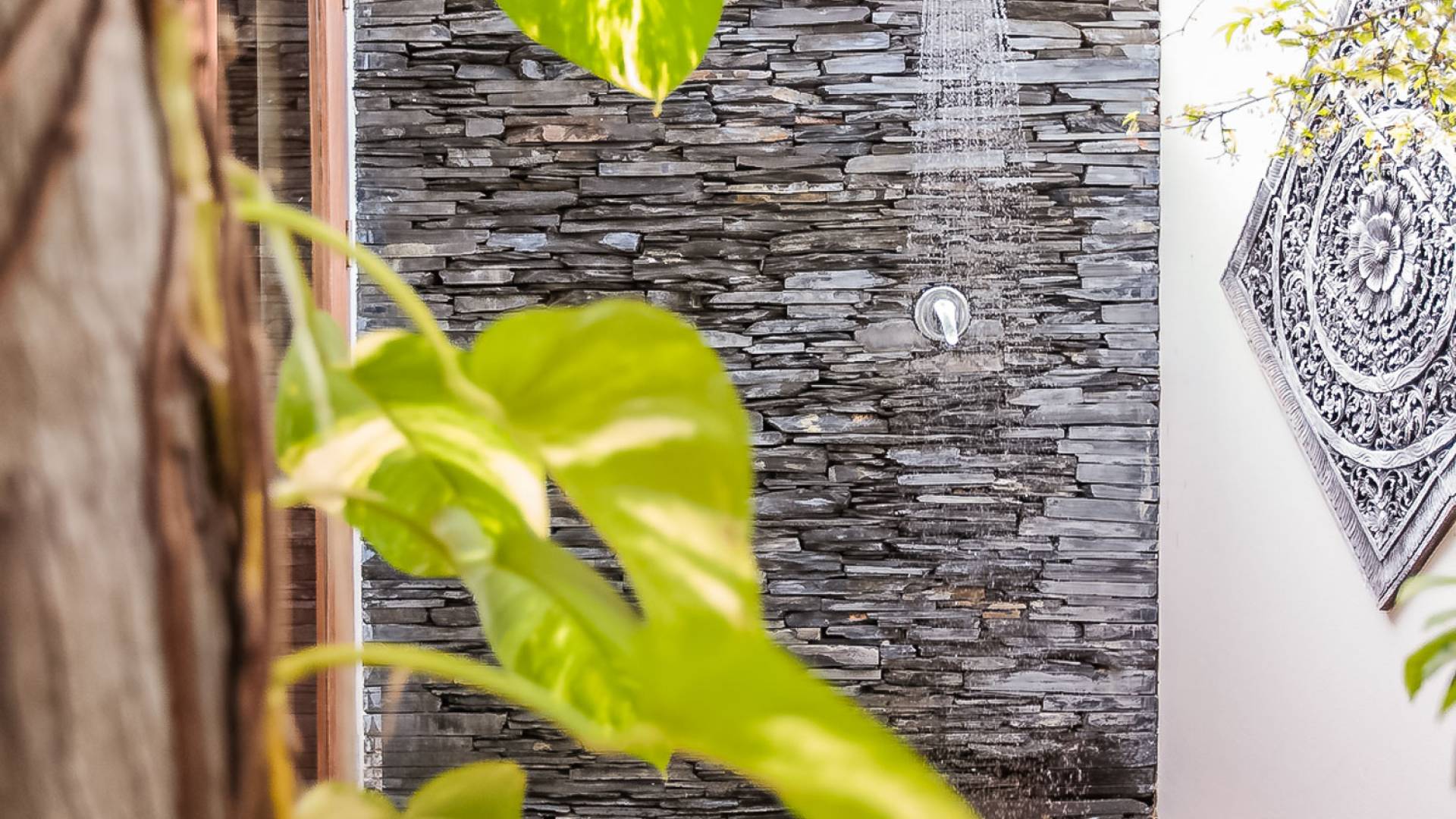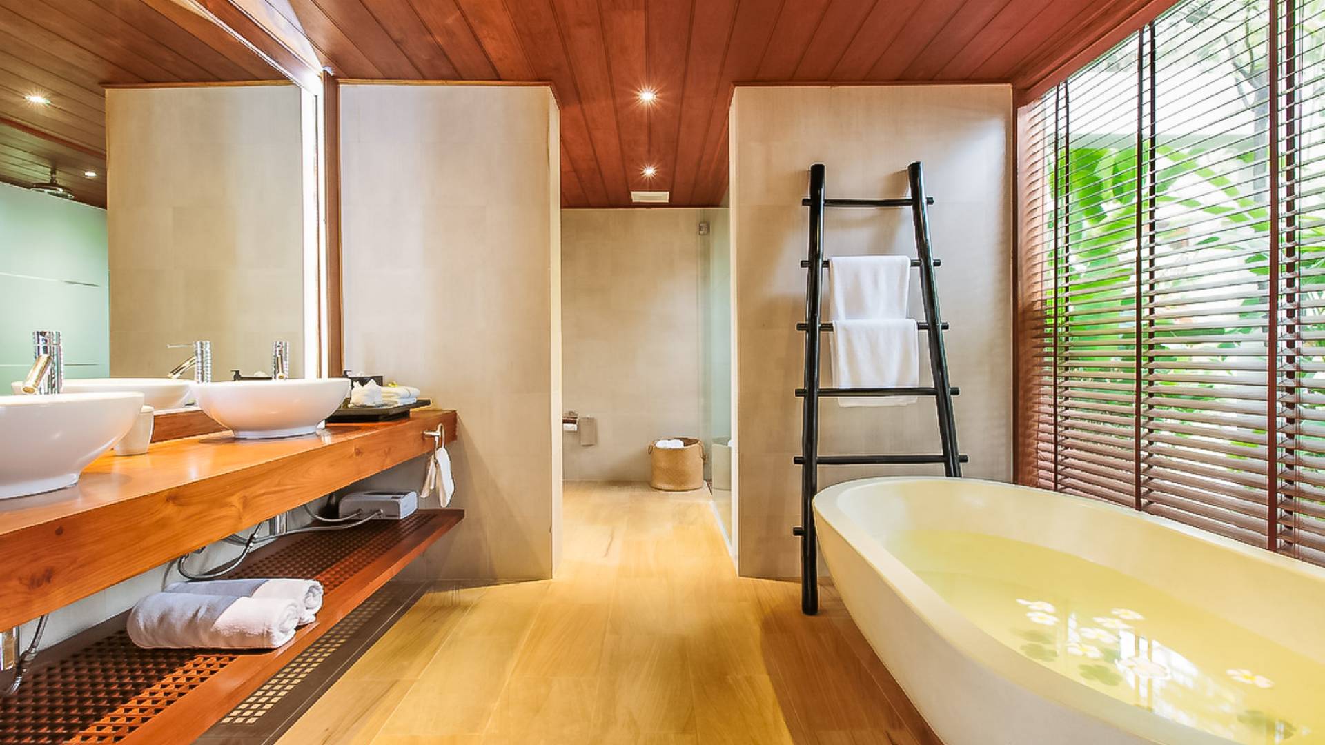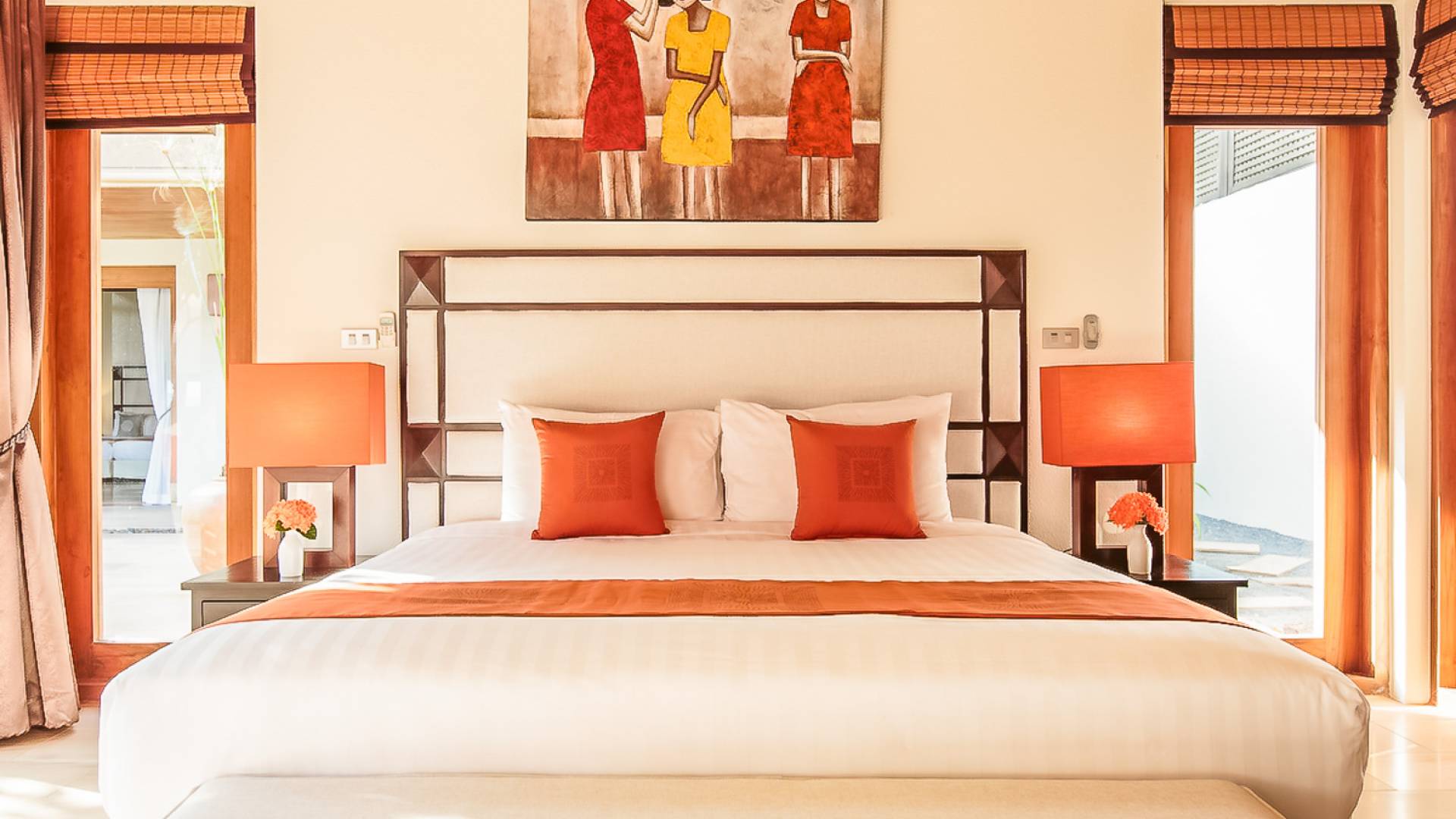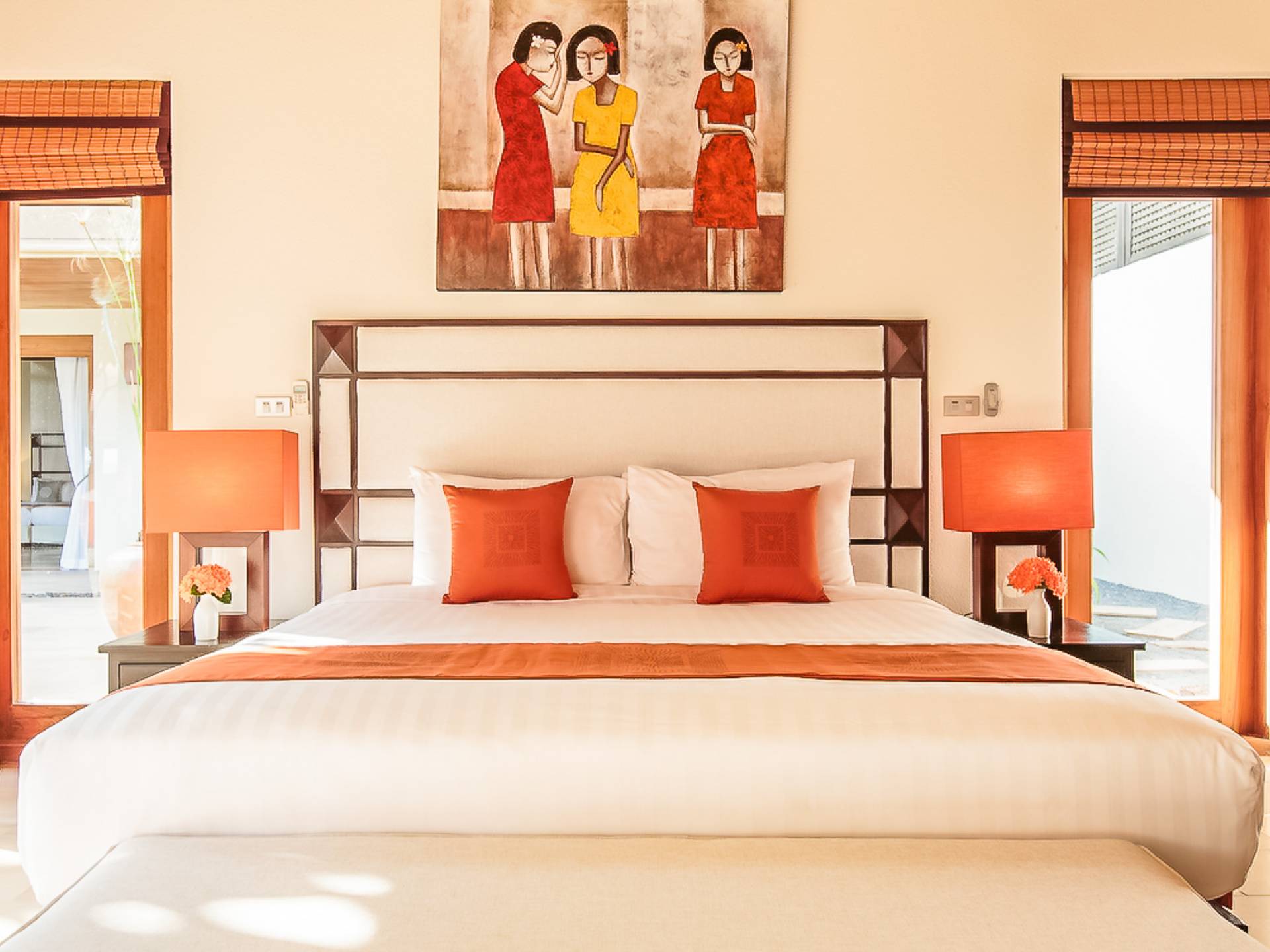 Вы покидаете это место через большой крытый балкон и спускаетесь на первый этаж по лестнице, выходящей на водопад, который впадает во внутренний двор внизу. Этот уровень содержит 6 спален, состоящих из 3 разных стилей (по 2 спальни на каждый дизайн). Все спальни имеют конфигурацию двуспальных кроватей (кровати размера «king-size»), оснащены ванными комнатами с большими душевыми кабинами и ваннами, а также телевизором / DVD-плеером с индивидуальными модулями спутникового телевидения. На первом этаже главного здания находятся спальни 5 и 6, а также парная. Далее по саду идут еще четыре индивидуальных спальных павильона. Спальни 3 и 4 - первые две по обе стороны от центральной лужайки и оснащены дополнительным душем на открытом воздухе в собственном частном дворе. Спальни 1 и 2 - это главные спальни и самые большие из них с дополнительным преимуществом в виде собственных стереосистем объемного звучания, которые можно изолировать от системы в главном доме.