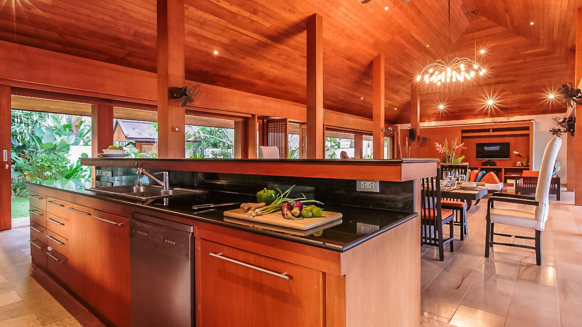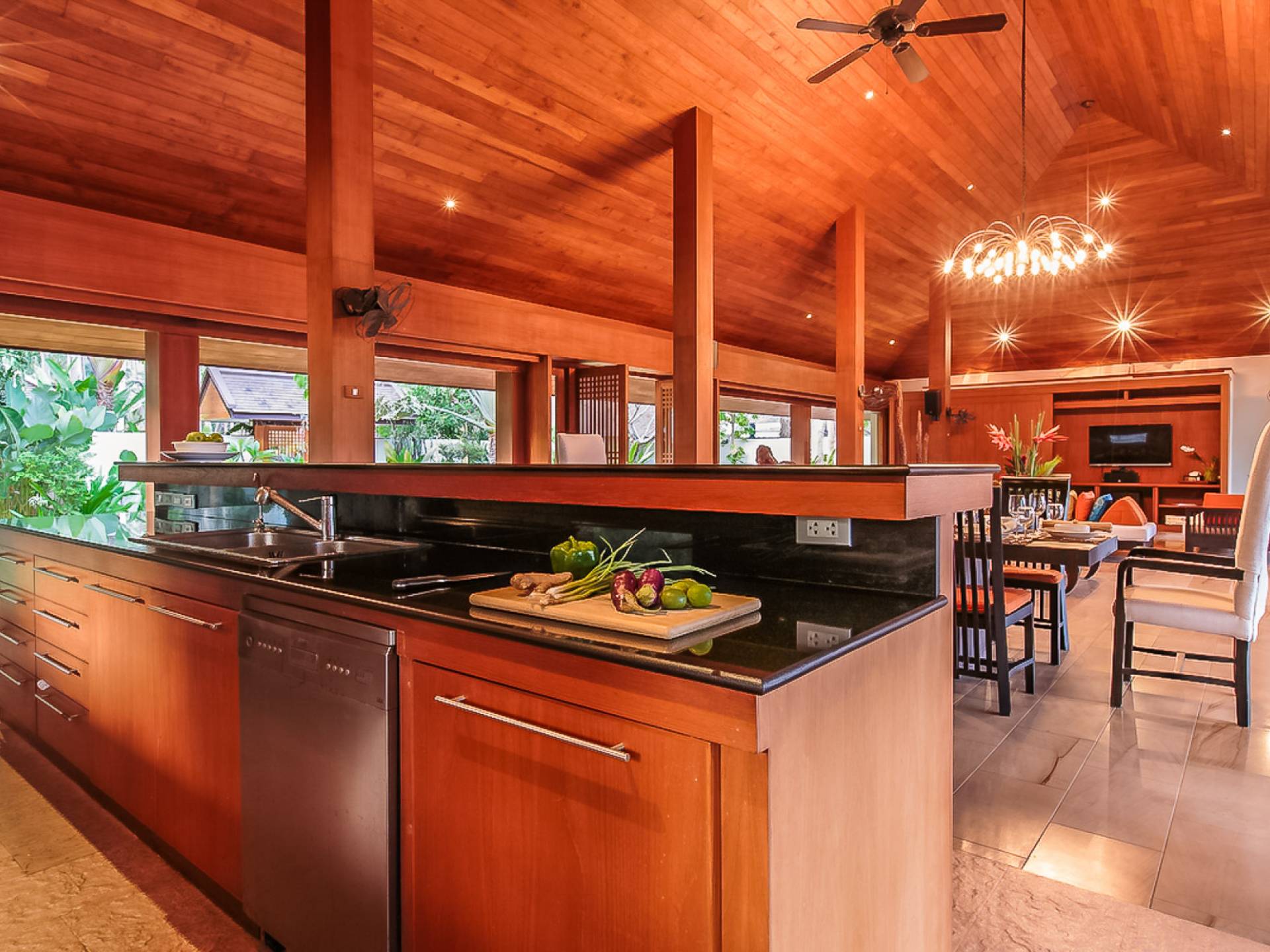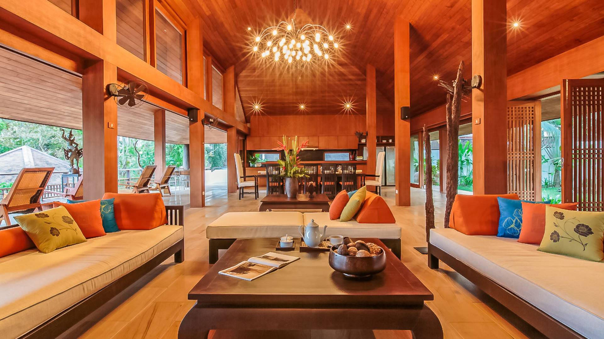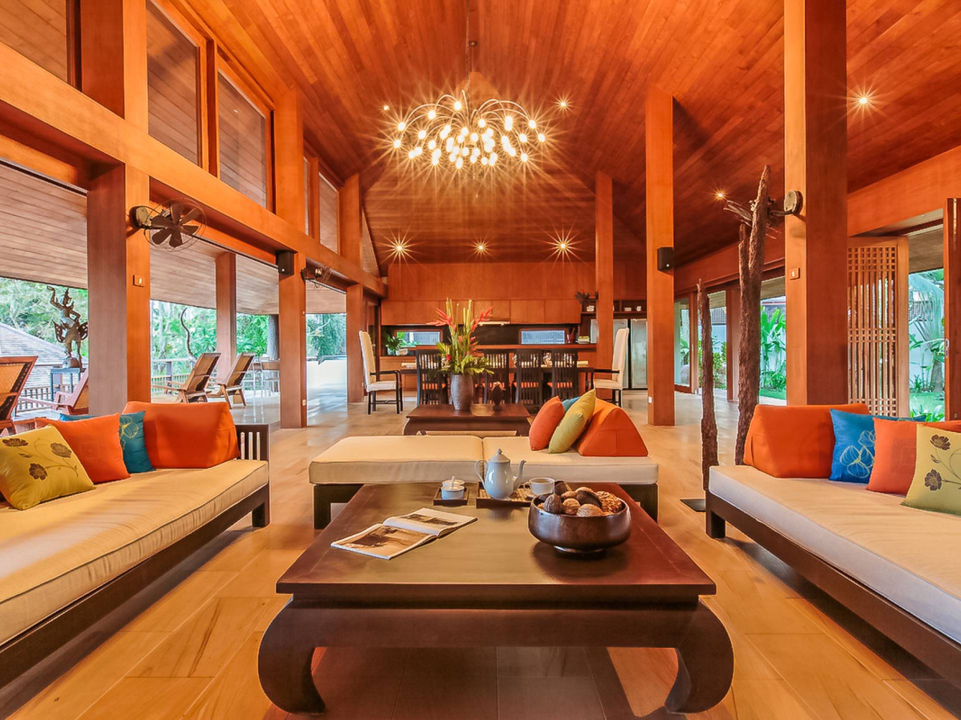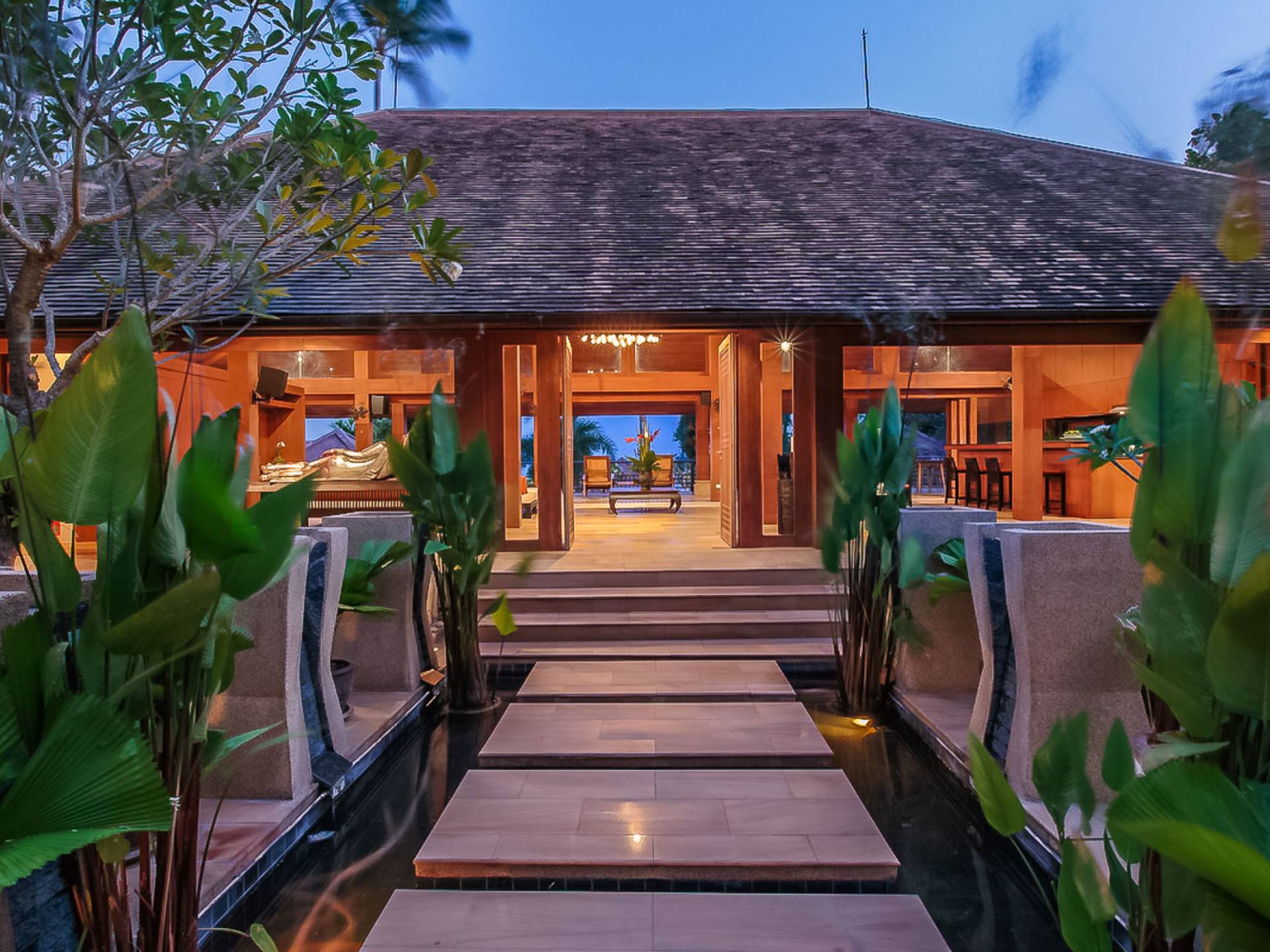 Войдя на территорию виллы, вы попадете в резиденцию над тихим ступенчатым прудом, наполненным рыбой кой, и с потрясающим видом на сверкающий вдалеке океан. Главный вход на виллу ведет прямо в просторный интерьер совмещенной гостиной / столовой / кухни. Этот грандиозный номер, расположенный на втором уровне главного дома, создает непринужденную атмосферу благодаря использованию пространства, дизайну открытой планировки и потрясающему виду, которым можно любоваться со всех сторон благодаря дополнительному использованию окон во всю длину. простор здания. В этой зоне находятся огромная кухня для гурманов, обеденный стол на 12 человек, пригодный для застолья, а также гостиная / развлекательная зона, оформленная в современном тайском стиле и являющаяся одним из главных украшений этого отеля; ультрасовременная аудио / визуальная система, оснащенная плазменным телевизором и технологией объемного звука, которая подключена к каждой части дома (внутри и снаружи), так что ваши любимые мелодии можно будет слушать, где бы вы ни находились!