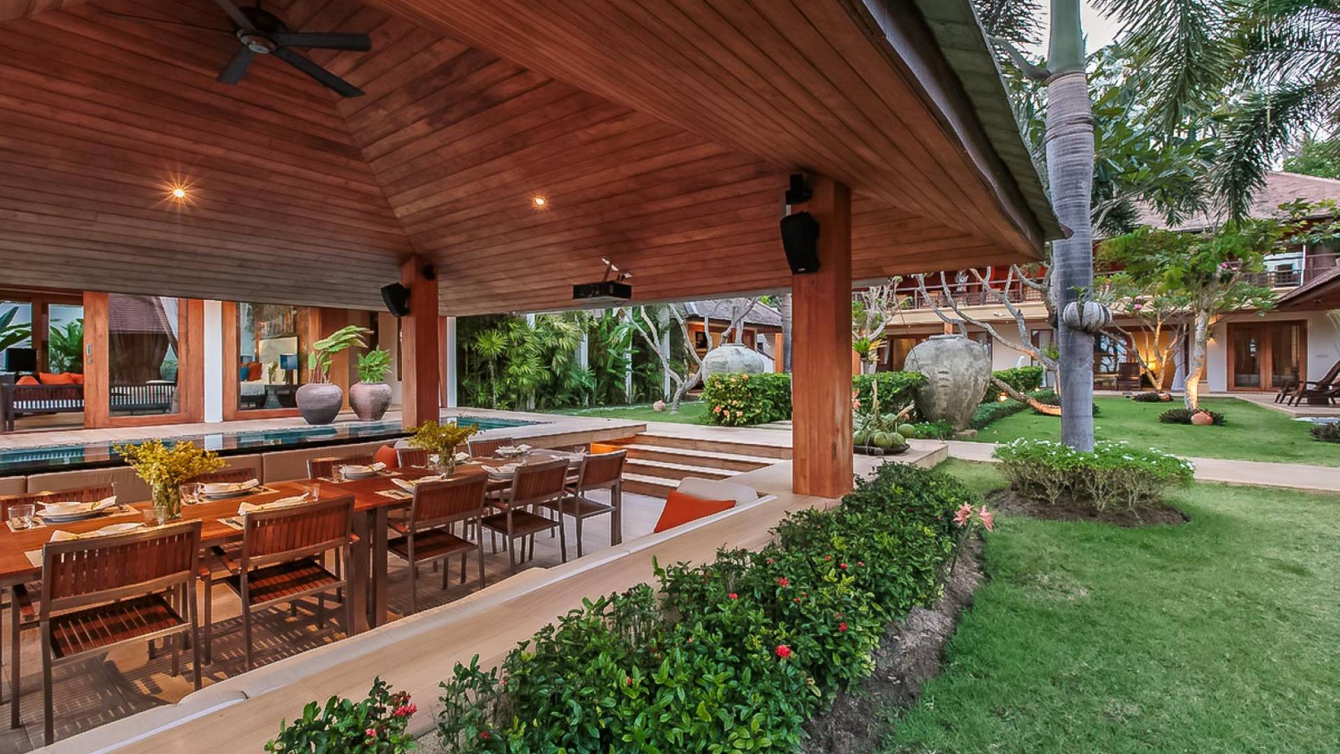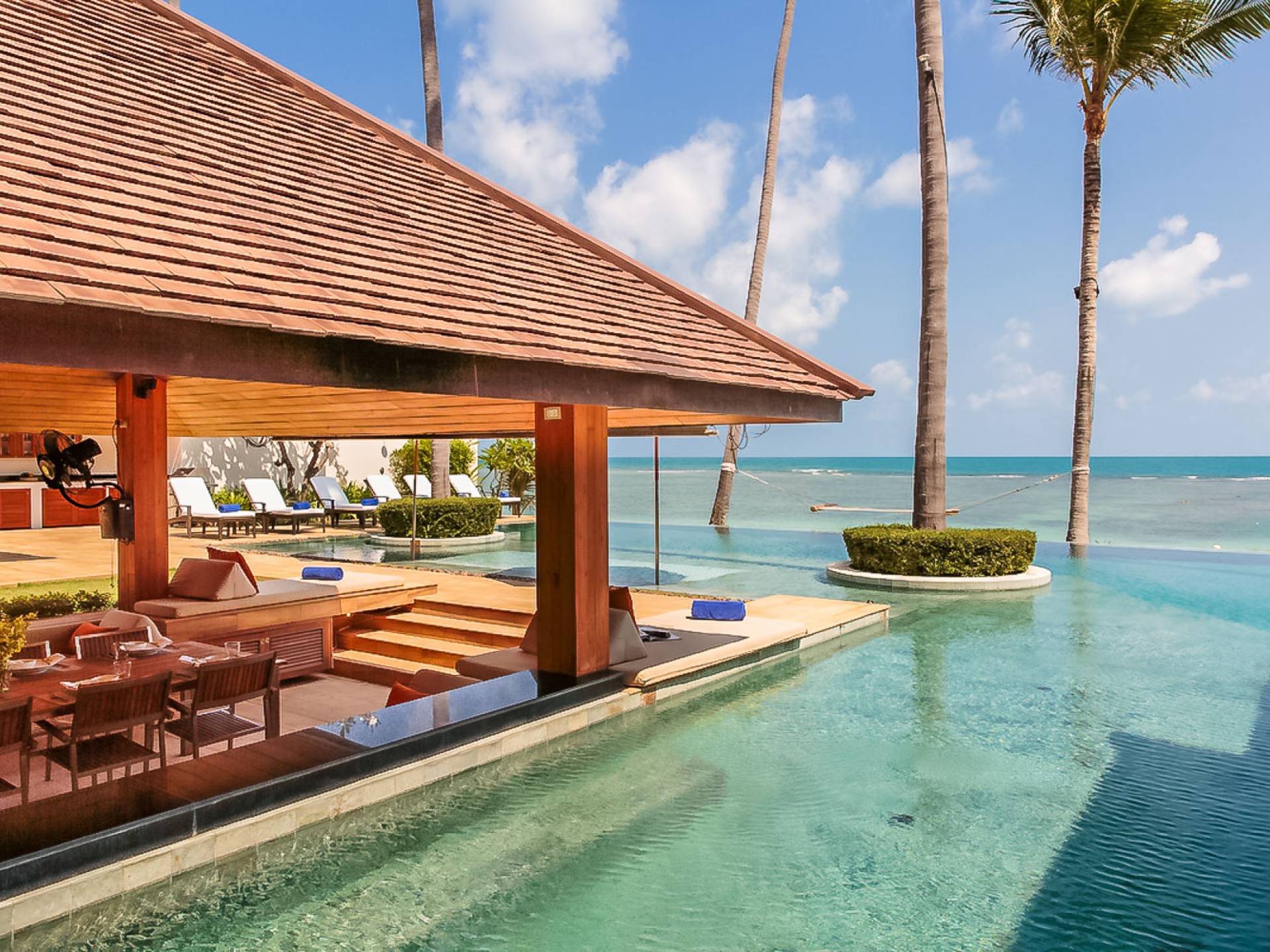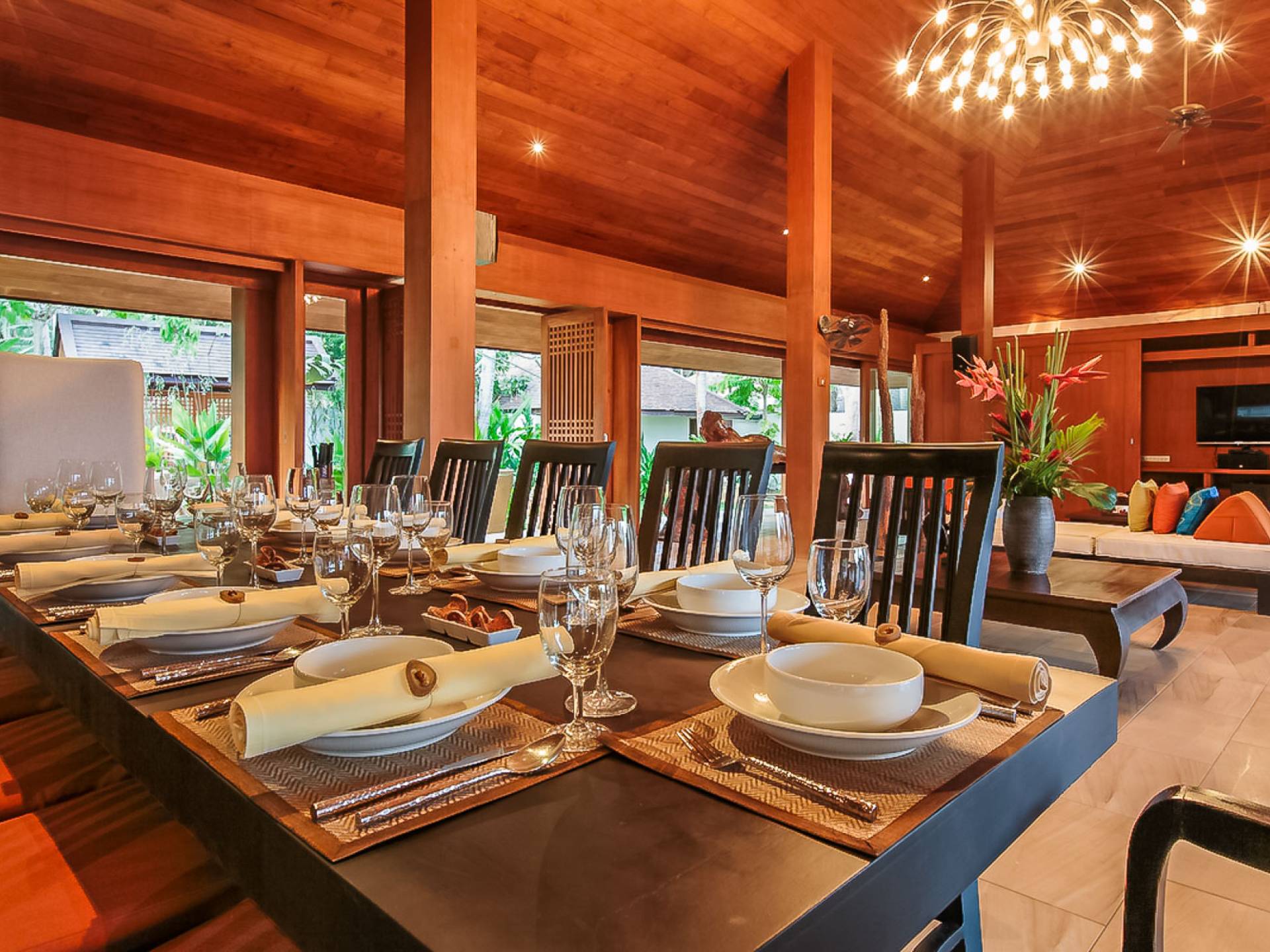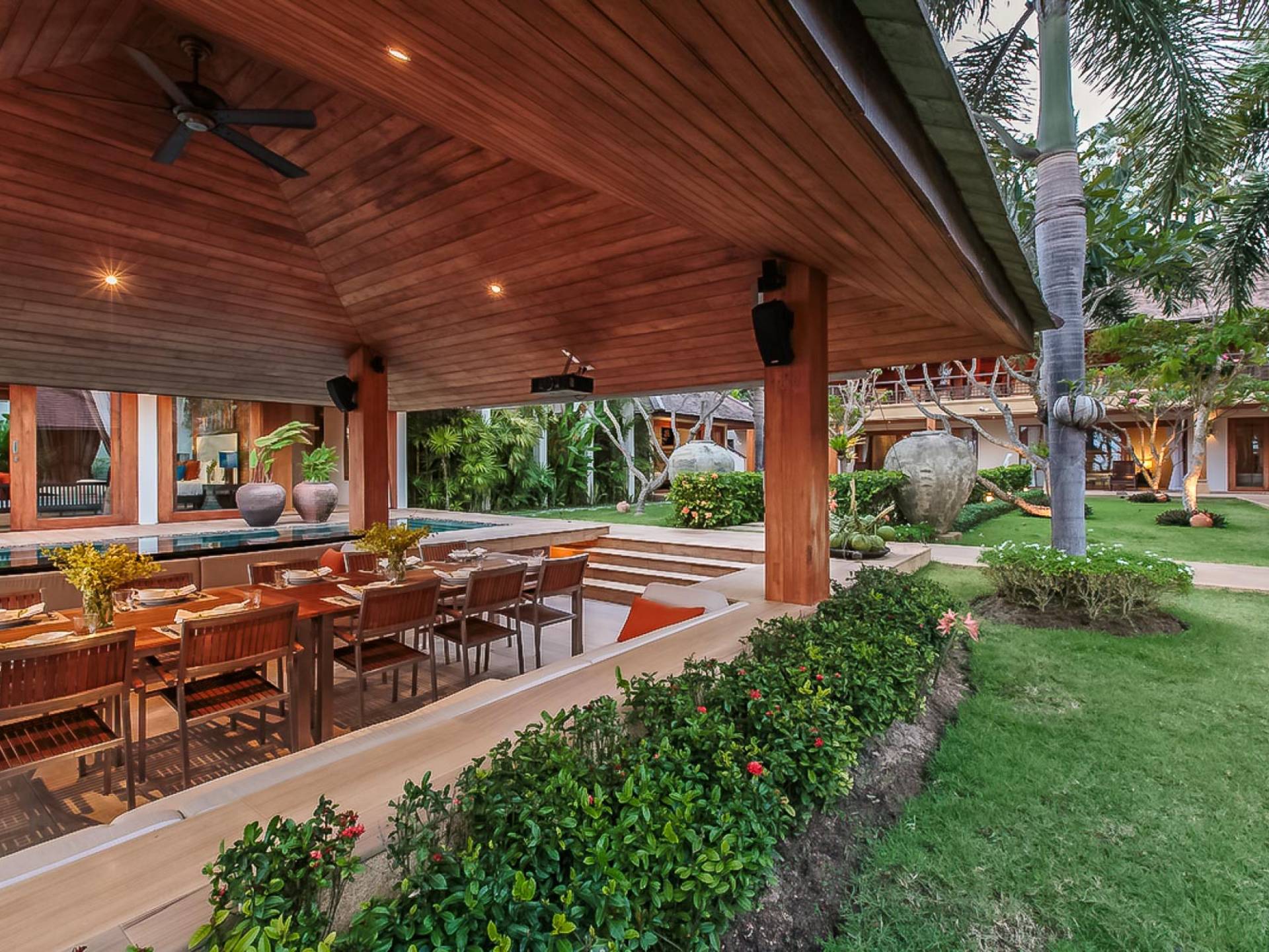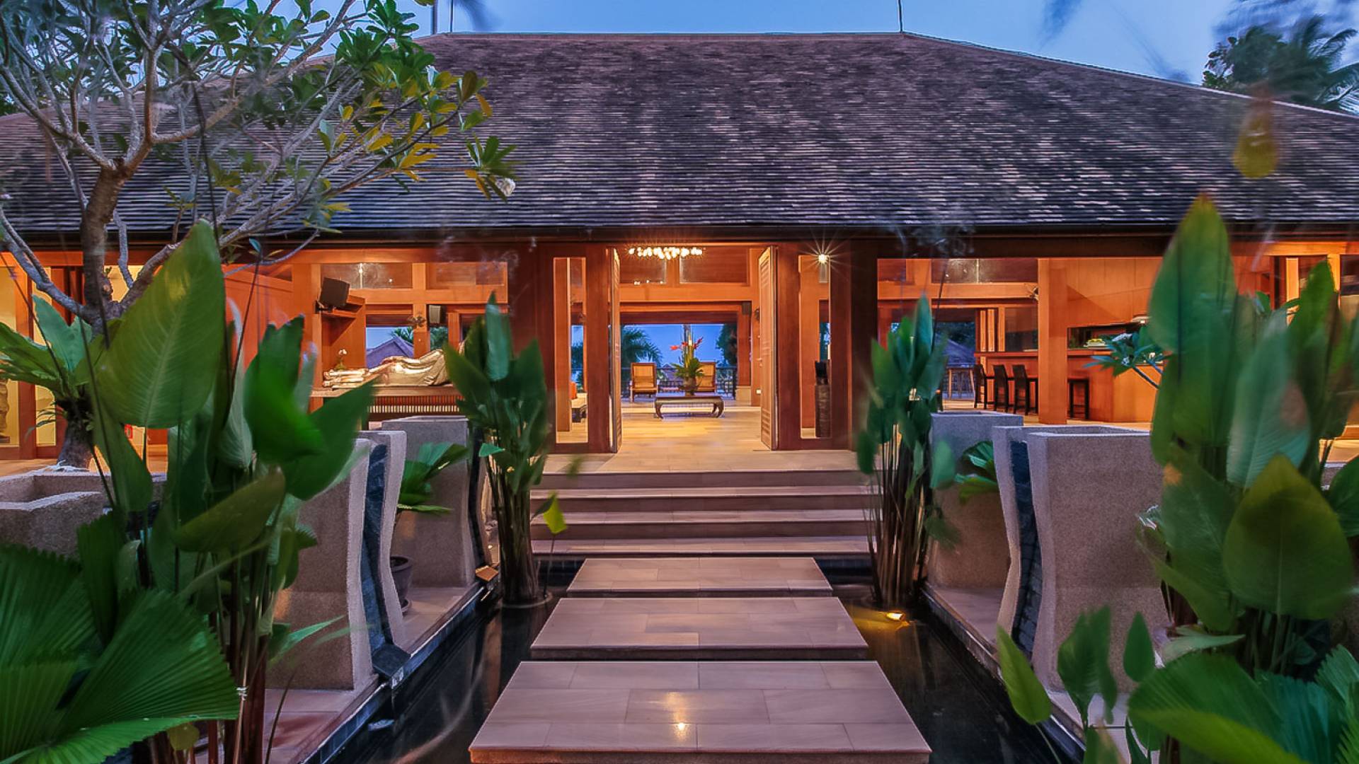 Войдя на территорию виллы, вы попадете в резиденцию над тихим ступенчатым прудом, наполненным рыбой кой, и с потрясающим видом на сверкающий вдалеке океан. Главный вход на виллу ведет прямо в просторный интерьер совмещенной гостиной / столовой / кухни. Этот грандиозный номер, расположенный на втором уровне главного дома, создает непринужденную атмосферу благодаря использованию пространства, дизайну открытой планировки и потрясающему виду, которым можно любоваться со всех сторон благодаря дополнительному использованию окон во всю длину. простор здания. В этой зоне находятся огромная кухня для гурманов, обеденный стол на 12 человек, пригодный для застолья, а также гостиная / развлекательная зона, оформленная в современном тайском стиле и являющаяся одним из главных украшений этого отеля; ультрасовременная аудио / визуальная система, оснащенная плазменным телевизором и технологией объемного звука, которая подключена к каждой части дома (внутри и снаружи), так что ваши любимые мелодии можно будет слушать, где бы вы ни находились!