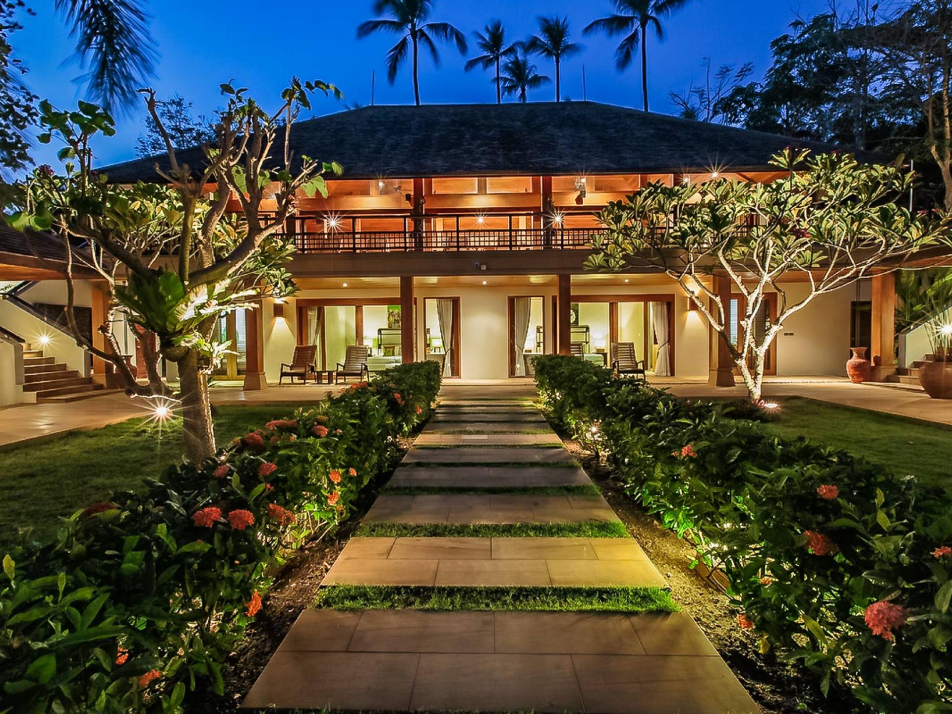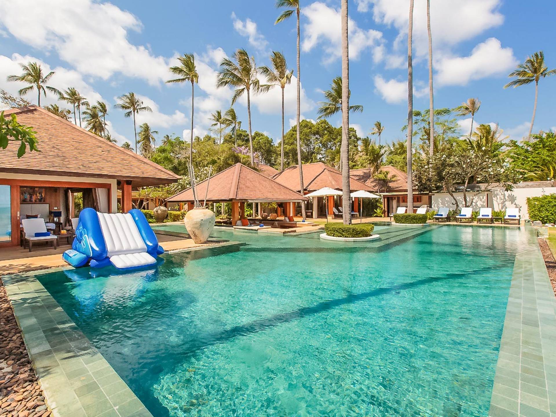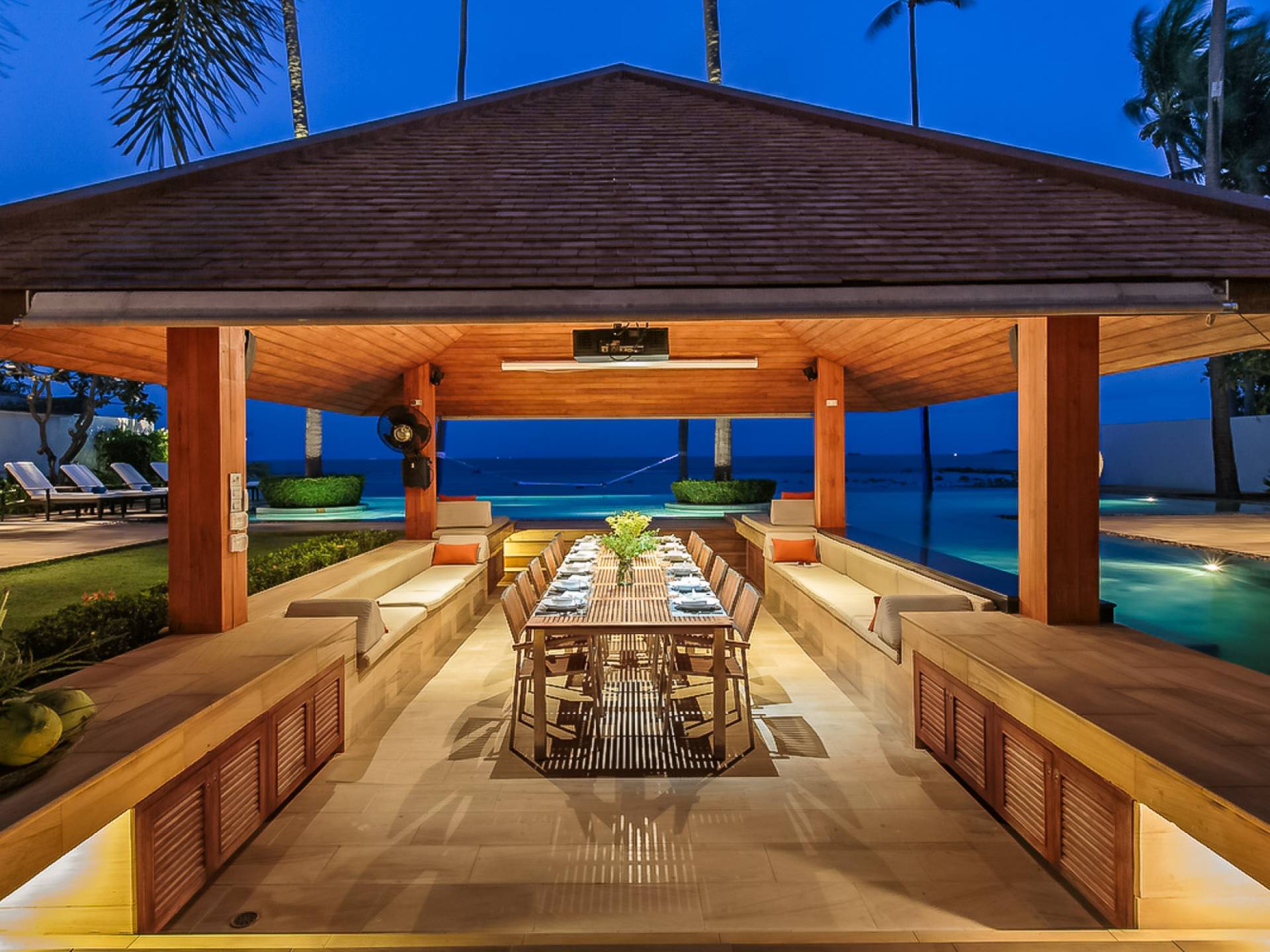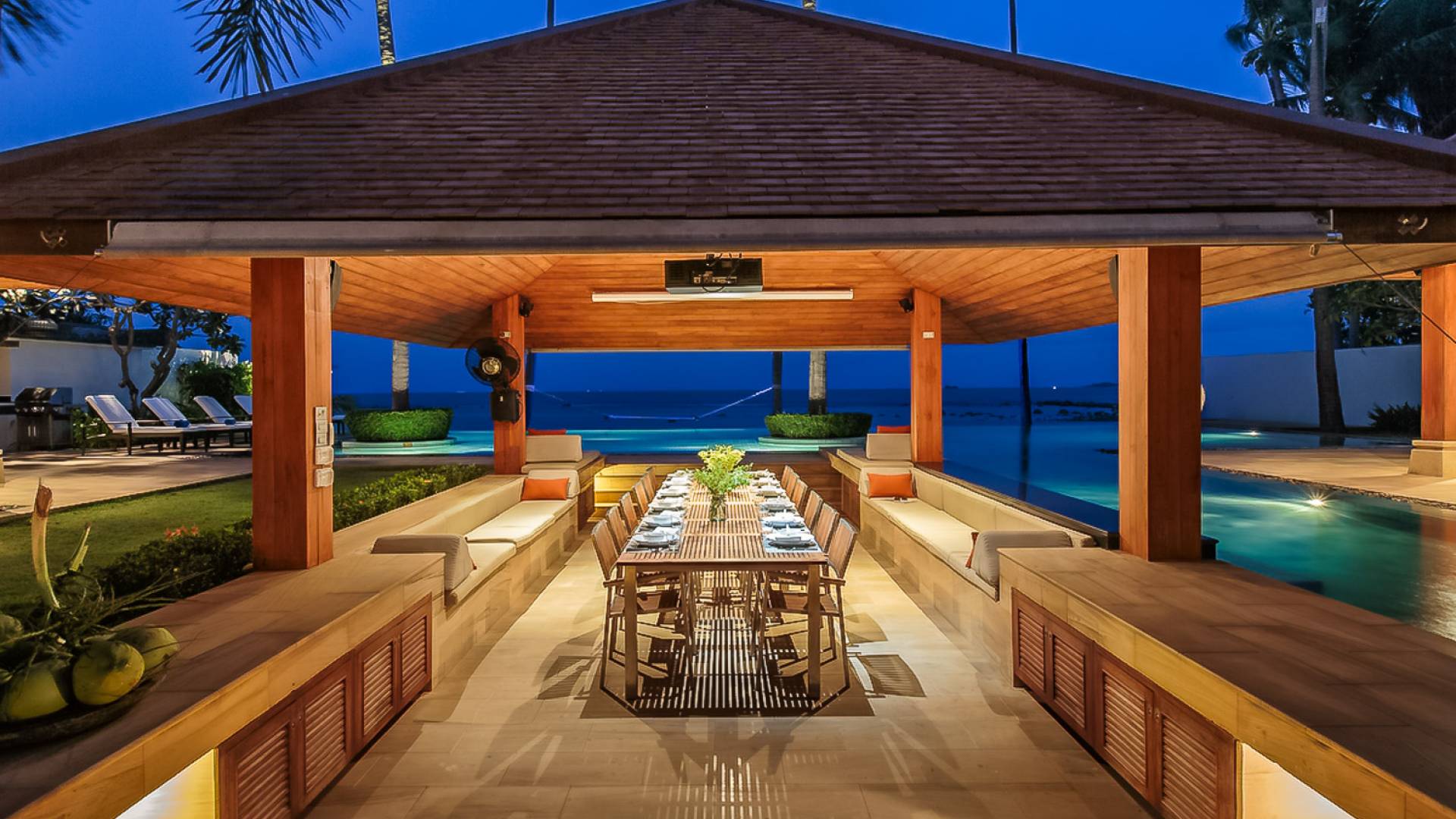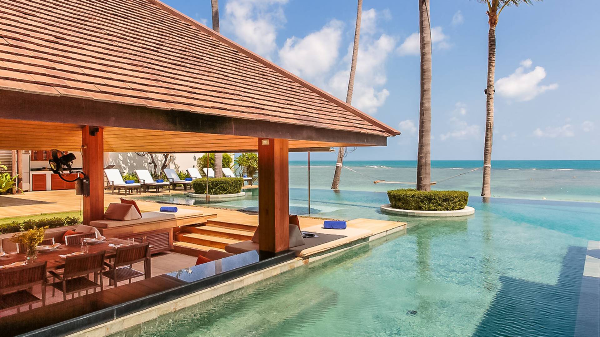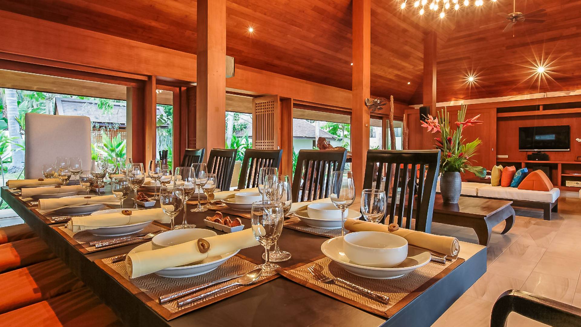 Войдя на территорию виллы, вы попадете в резиденцию над тихим ступенчатым прудом, наполненным рыбой кой, и с потрясающим видом на сверкающий вдалеке океан. Главный вход на виллу ведет прямо в просторный интерьер совмещенной гостиной / столовой / кухни. Этот грандиозный номер, расположенный на втором уровне главного дома, создает непринужденную атмосферу благодаря использованию пространства, дизайну открытой планировки и потрясающему виду, которым можно любоваться со всех сторон благодаря дополнительному использованию окон во всю длину. простор здания. В этой зоне находятся огромная кухня для гурманов, обеденный стол на 12 человек, пригодный для застолья, а также гостиная / развлекательная зона, оформленная в современном тайском стиле и являющаяся одним из главных украшений этого отеля; ультрасовременная аудио / визуальная система, оснащенная плазменным телевизором и технологией объемного звука, которая подключена к каждой части дома (внутри и снаружи), так что ваши любимые мелодии можно будет слушать, где бы вы ни находились!