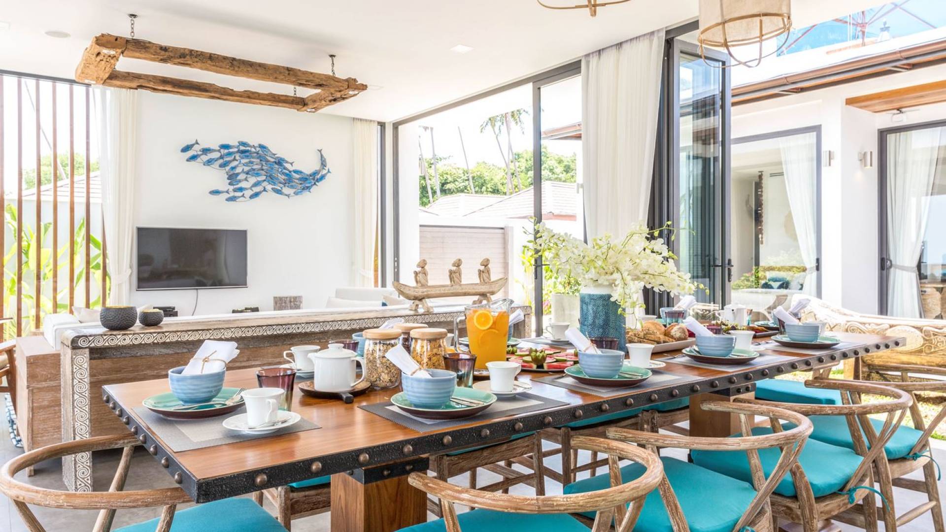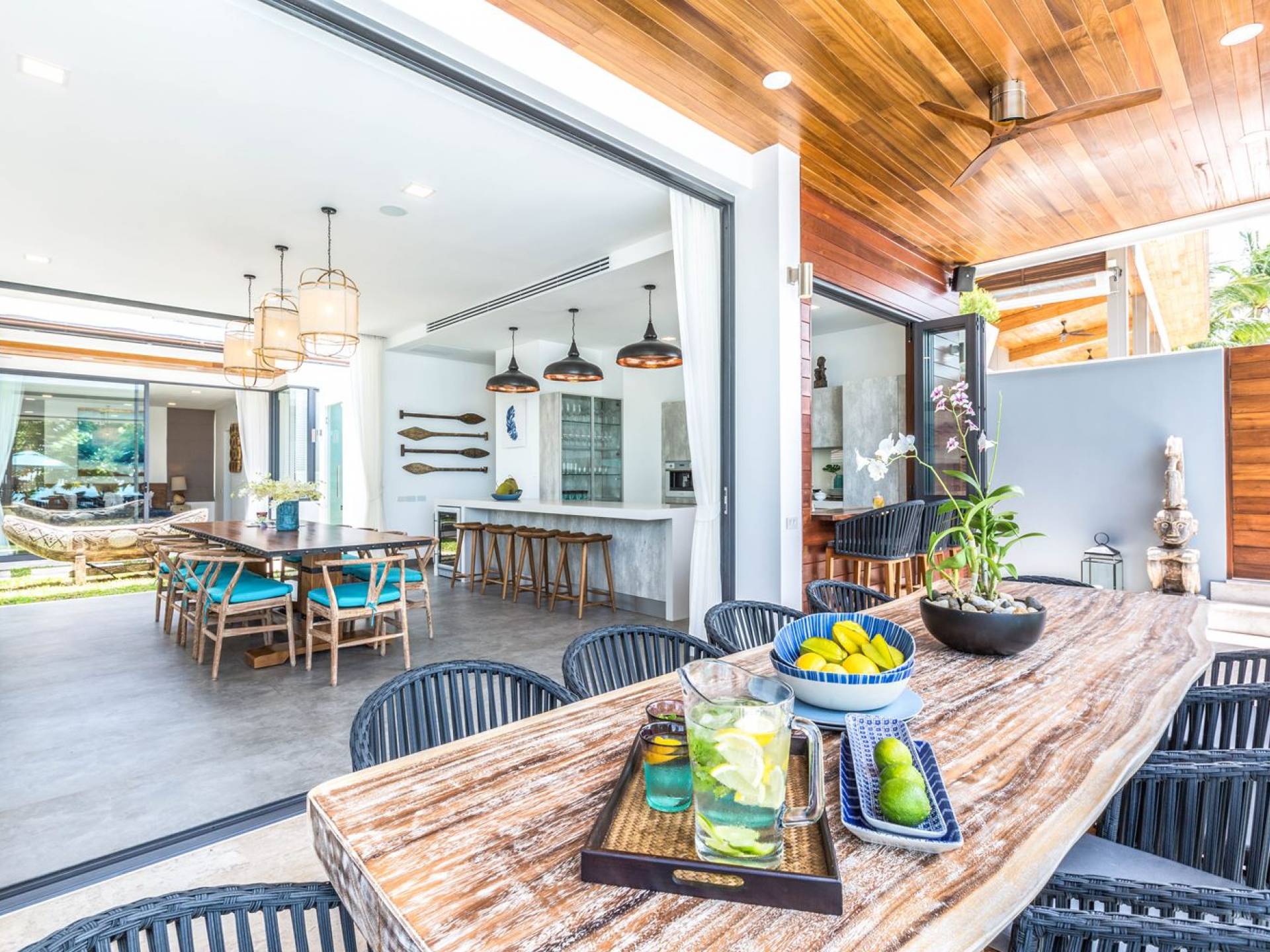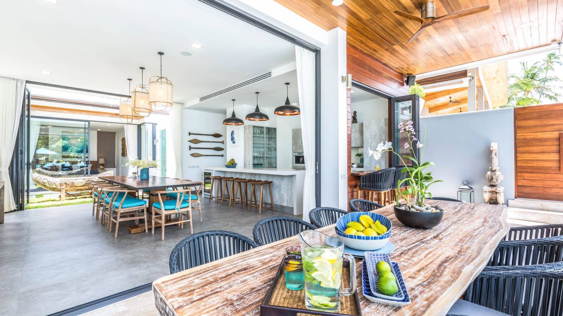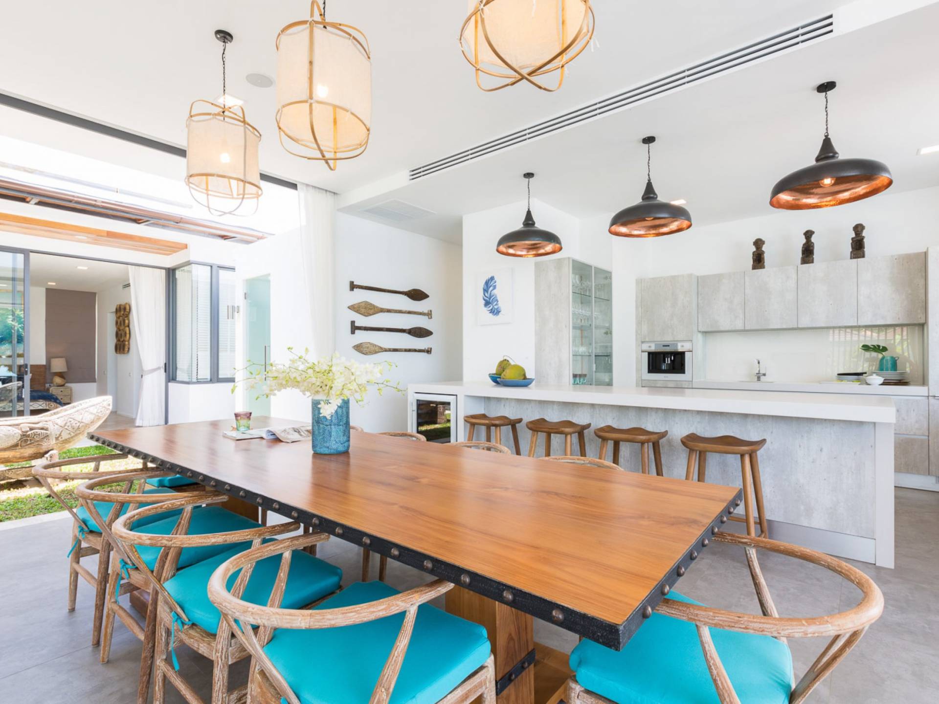 Напротив двора расположены гостиная и столовая открытой планировки. В обеденном зале с комфортом могут разместиться 12 человек. Чтобы перекусить в течение дня или приготовить любимые блюда ребенка, встроенная кухня виллы Suma, изготовленная по индивидуальному заказу, оснащена всеми необходимыми кухонными принадлежностями и техникой. От восхитительных тайских блюд до барбекю из морепродуктов, пасты и салатов, опытный тайский шеф-повар приготовит аппетитные блюда, которые удовлетворят самые привередливые вкусы. Шесть спален с ванными комнатами на вилле Suma обеспечивают максимальное уединение, пространство и вид на море. Во всех светлых, светлых и просторных спальнях есть кровати размера "king-size" и свежее постельное белье из египетского хлопка. Высокие потолки и четкие современные линии с шикарной мебелью и современной сантехникой создают спокойную и домашнюю атмосферу. На втором этаже есть отдельная детская двухъярусная комната со смежными дверями, ведущими в одну из спален для взрослых, чтобы дети были в пределах легкой досягаемости.