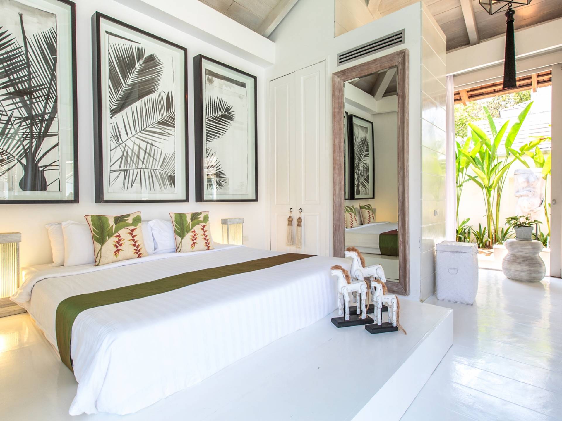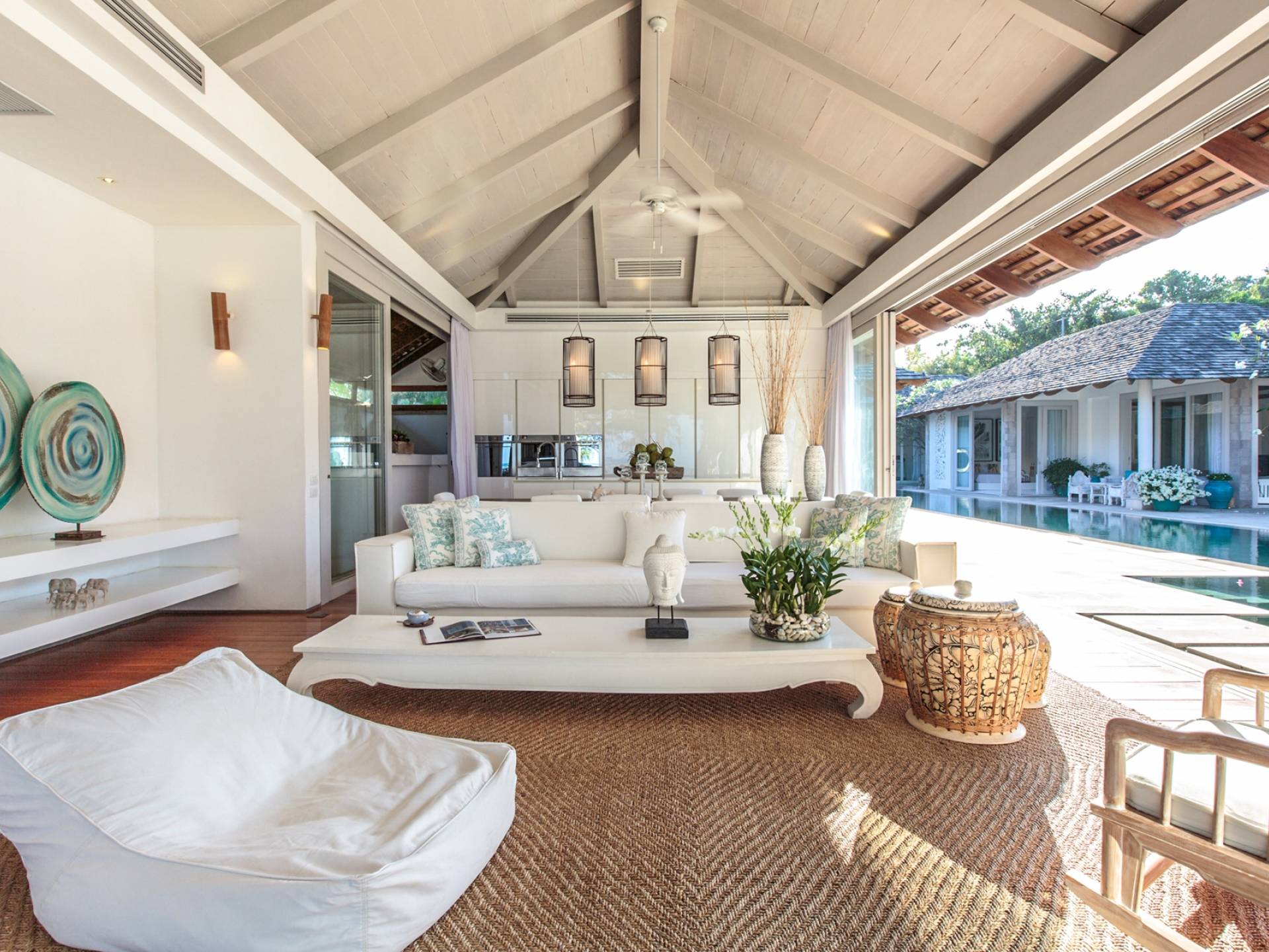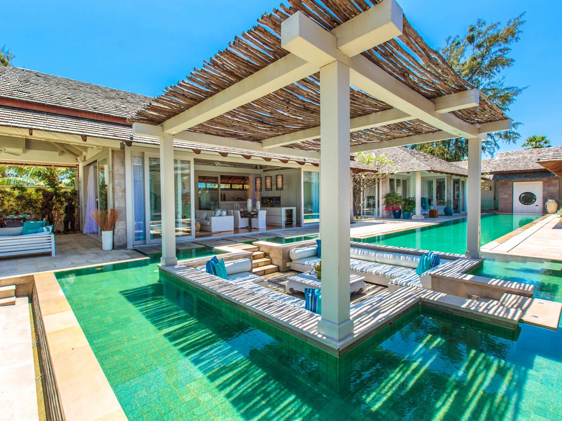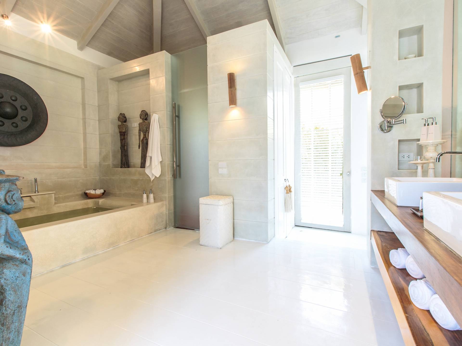 Напротив главной спальни, с правой стороны, современная кухня и столовая выходят на океан. В гостиной есть еще одна обеденная зона на улице. Резиденция состоит из трех павильонов, расположенных вокруг великолепного 23-метрового плавательного бассейна, облицованного балийскими зелеными камнями. Бассейн окружает огромную крытую беседку с удобными креслами. В дальнем конце бассейн становится мельче и позволяет маленьким детям безопасно плавать. Элегантно обставленные спальни оснащены кроватями размера "king-size", ЖК-телевизором с Netflix, встроенными шкафами, персональными сейфами, мини-барами и большими зеркалами. Каждая спальня имеет собственную ванную комнату с тропическим душем, двумя раковинами и небольшим частным садом с тропическими растениями с тропическим душем на открытом воздухе или роскошной ванной из терраццо. Все спальни выходят на бассейн и имеют прямой доступ к террасе у бассейна.