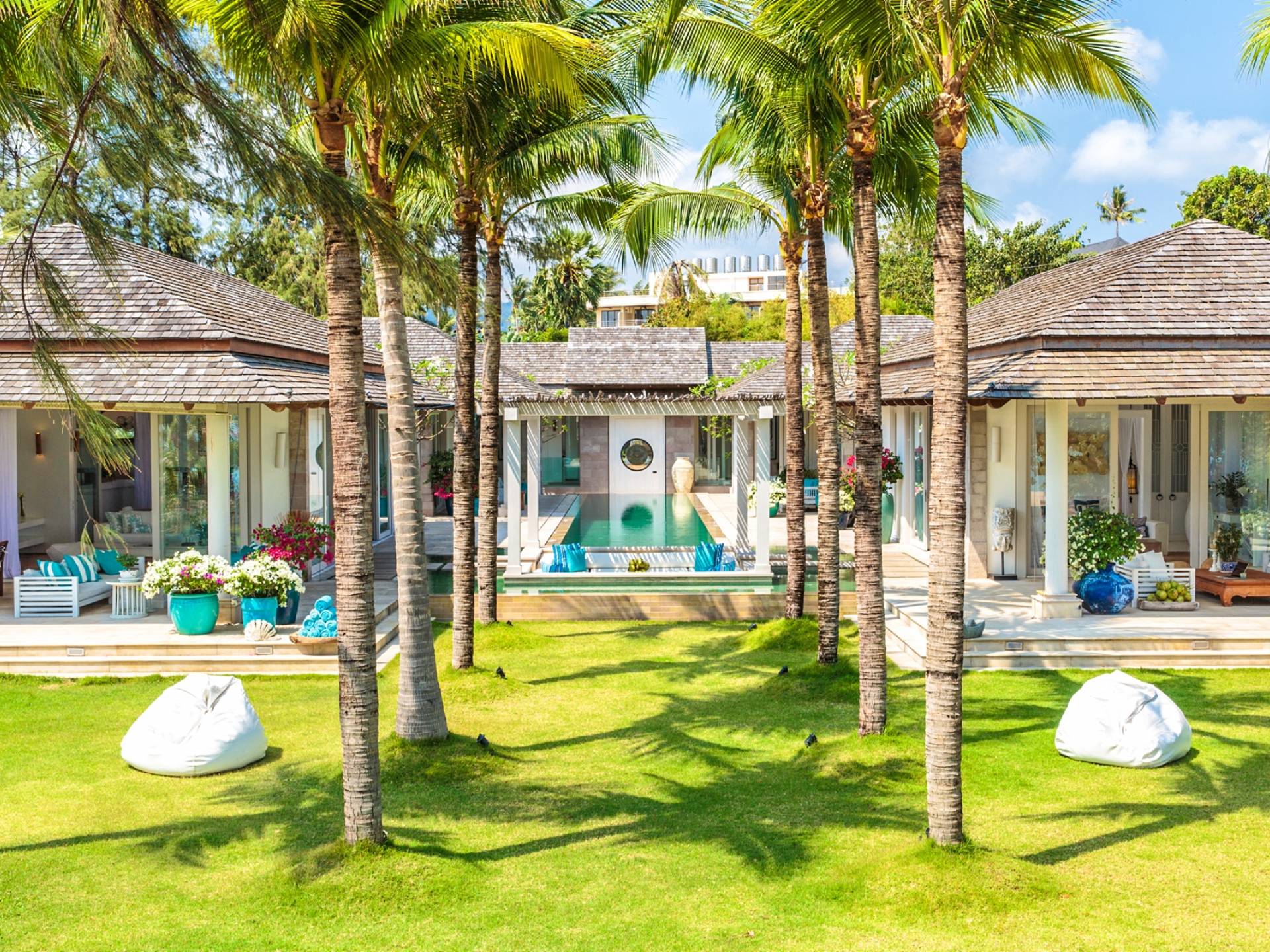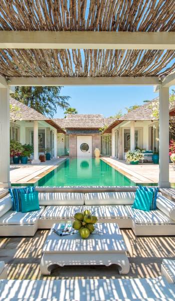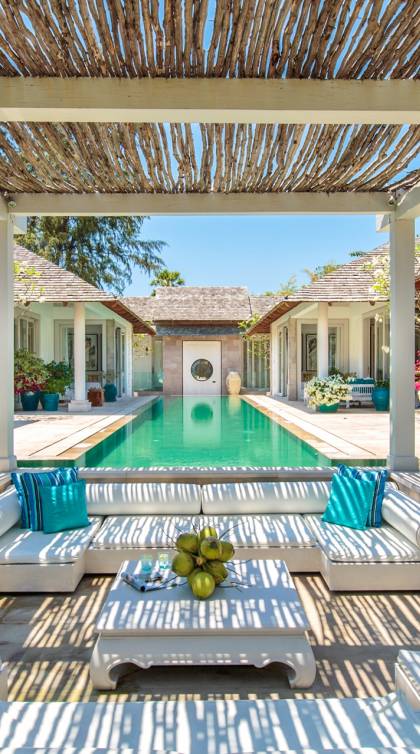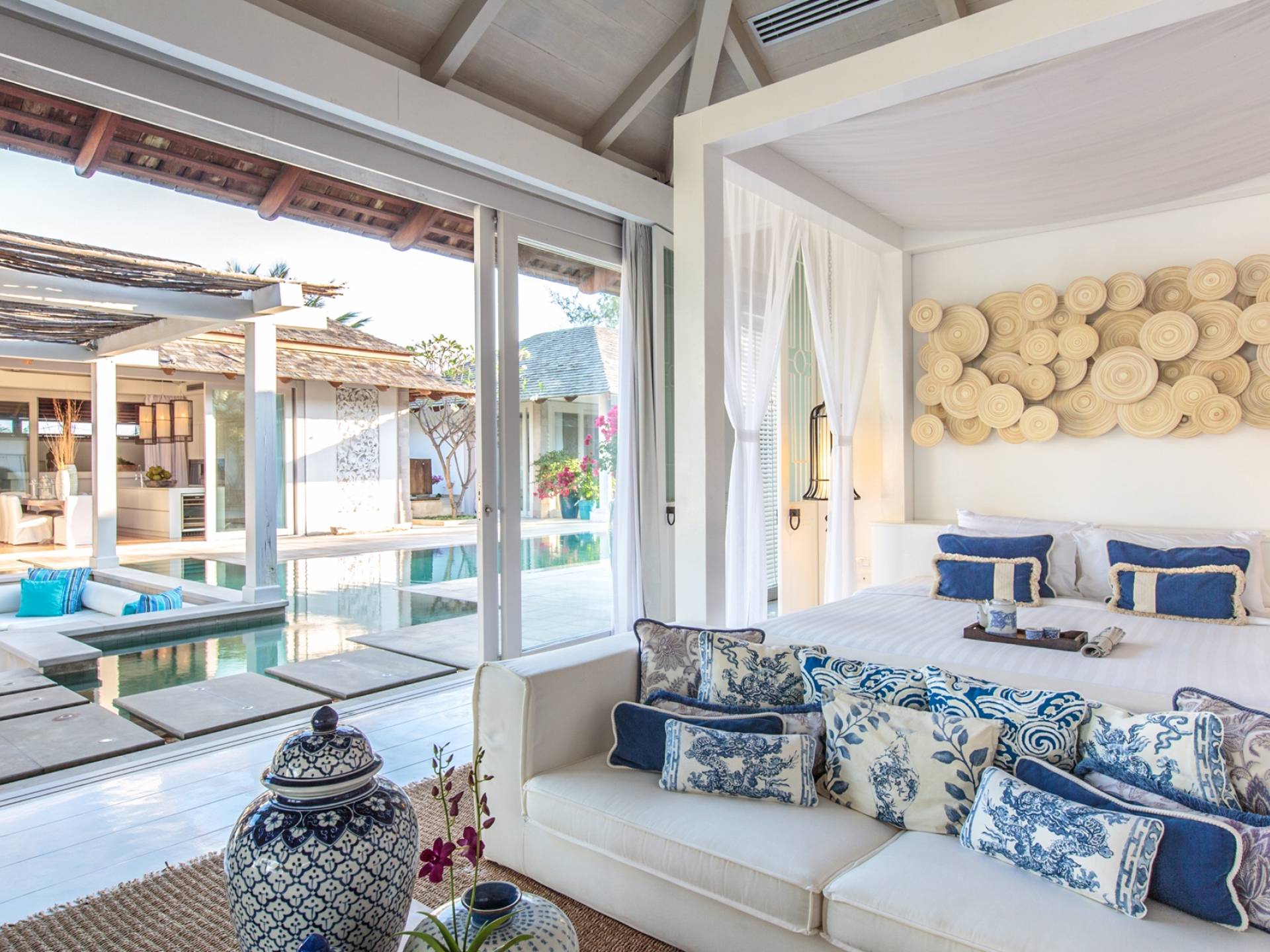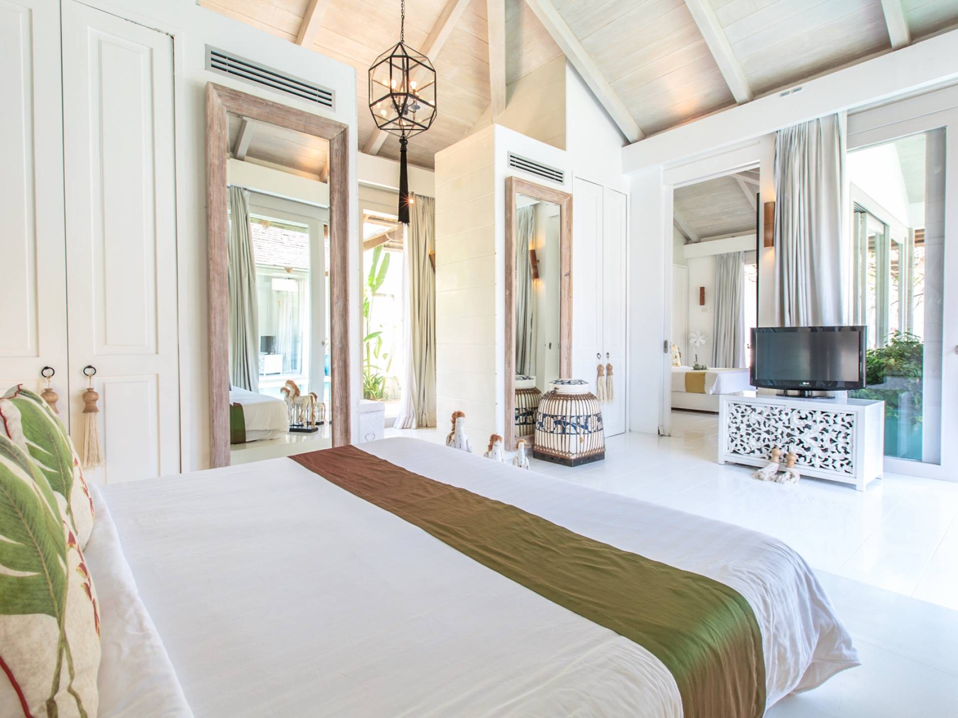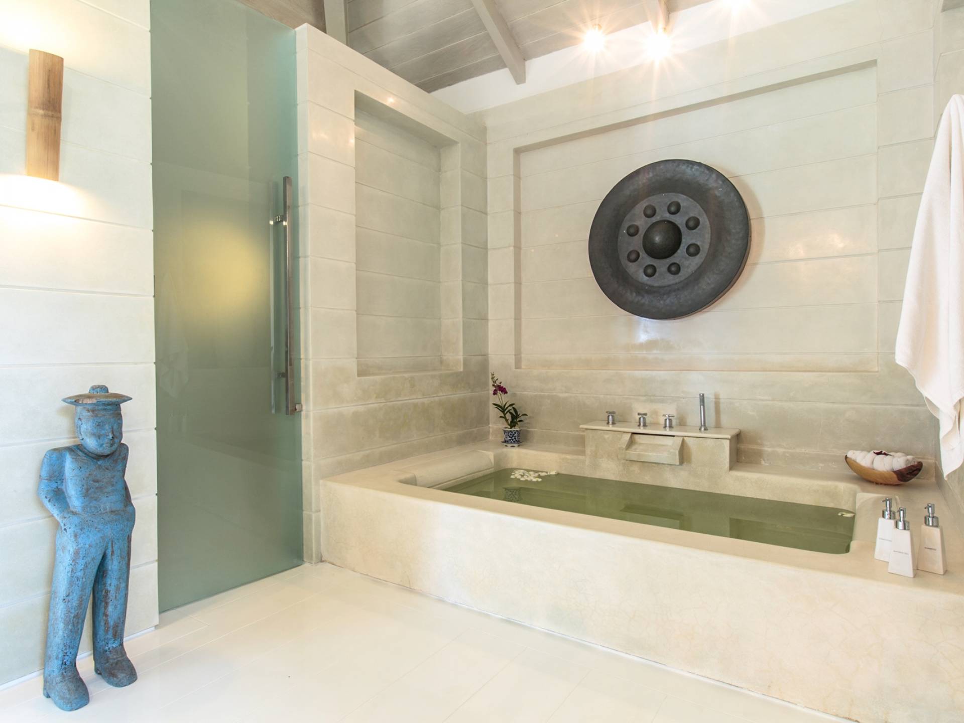 Напротив главной спальни, с правой стороны, современная кухня и столовая выходят на океан. В гостиной есть еще одна обеденная зона на улице. Резиденция состоит из трех павильонов, расположенных вокруг великолепного 23-метрового плавательного бассейна, облицованного балийскими зелеными камнями. Бассейн окружает огромную крытую беседку с удобными креслами. В дальнем конце бассейн становится мельче и позволяет маленьким детям безопасно плавать. Элегантно обставленные спальни оснащены кроватями размера "king-size", ЖК-телевизором с Netflix, встроенными шкафами, персональными сейфами, мини-барами и большими зеркалами. Каждая спальня имеет собственную ванную комнату с тропическим душем, двумя раковинами и небольшим частным садом с тропическими растениями с тропическим душем на открытом воздухе или роскошной ванной из терраццо. Все спальни выходят на бассейн и имеют прямой доступ к террасе у бассейна.