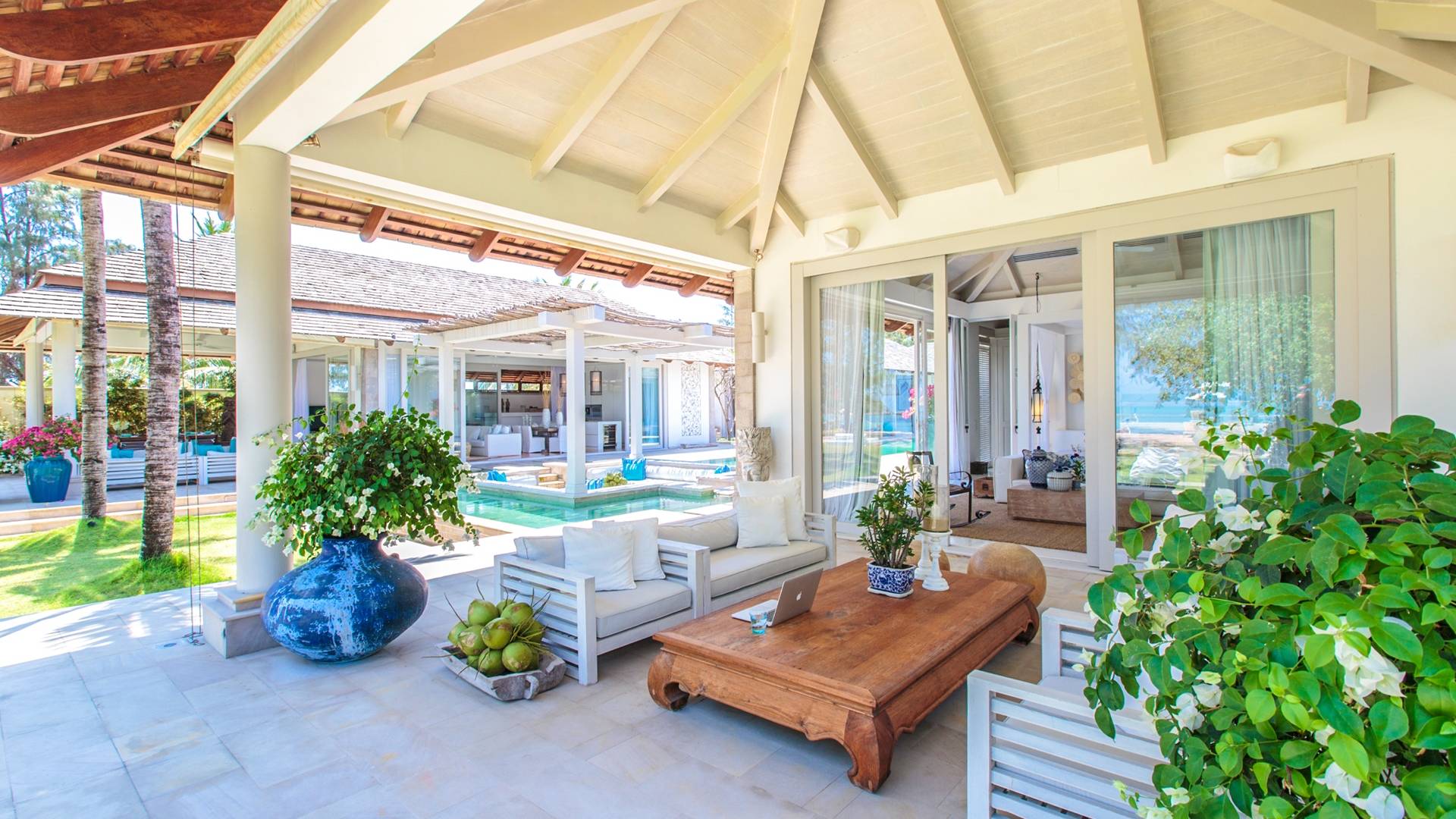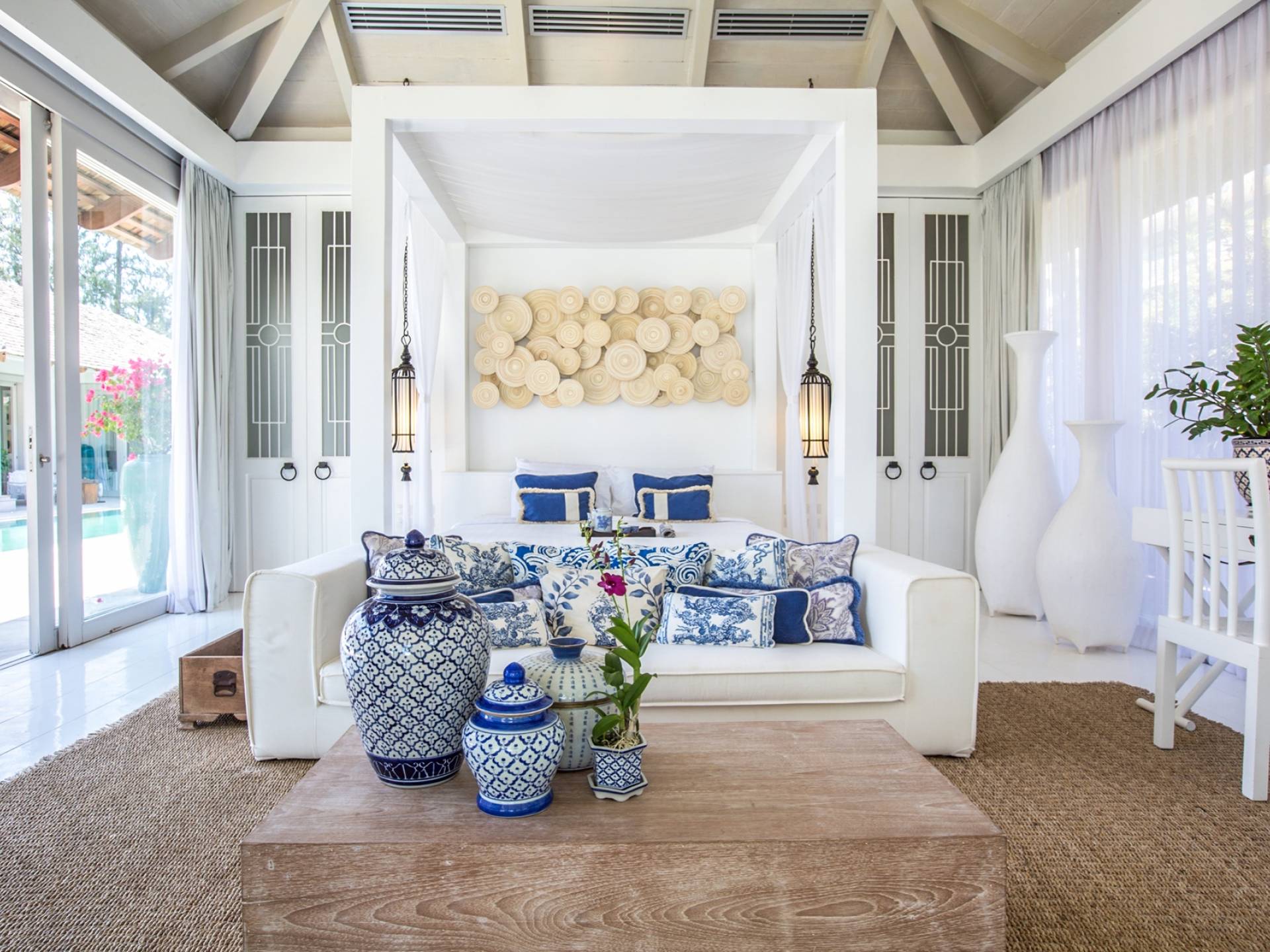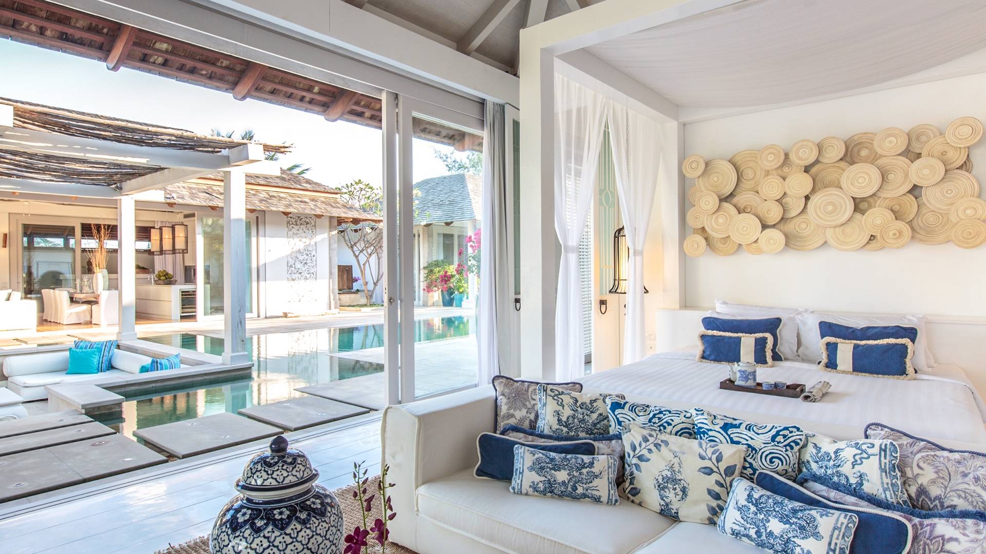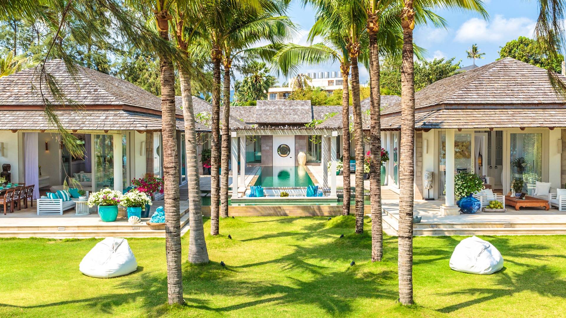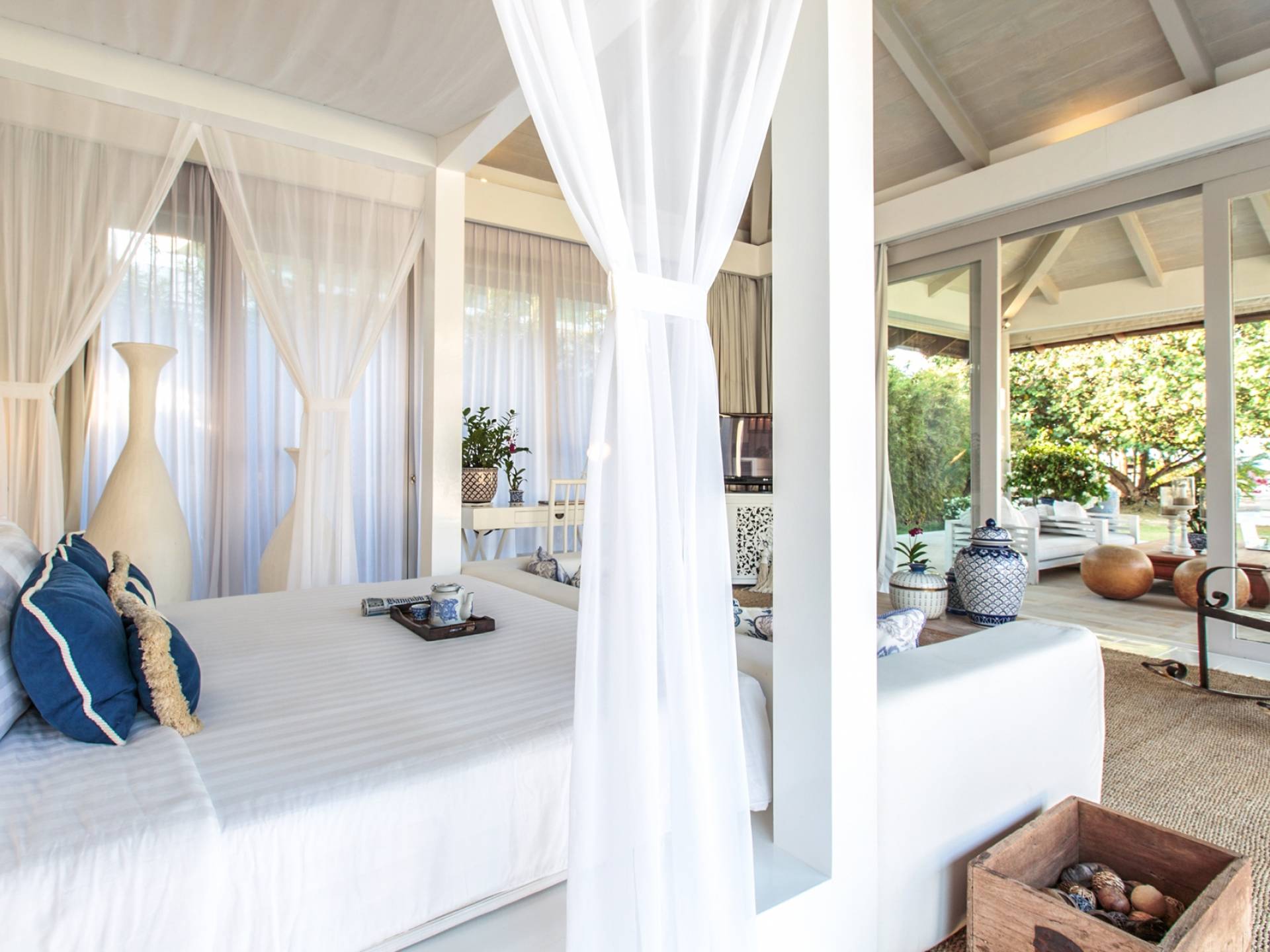 Напротив главной спальни, с правой стороны, современная кухня и столовая выходят на океан. В гостиной есть еще одна обеденная зона на улице. Резиденция состоит из трех павильонов, расположенных вокруг великолепного 23-метрового плавательного бассейна, облицованного балийскими зелеными камнями. Бассейн окружает огромную крытую беседку с удобными креслами. В дальнем конце бассейн становится мельче и позволяет маленьким детям безопасно плавать. Элегантно обставленные спальни оснащены кроватями размера "king-size", ЖК-телевизором с Netflix, встроенными шкафами, персональными сейфами, мини-барами и большими зеркалами. Каждая спальня имеет собственную ванную комнату с тропическим душем, двумя раковинами и небольшим частным садом с тропическими растениями с тропическим душем на открытом воздухе или роскошной ванной из терраццо. Все спальни выходят на бассейн и имеют прямой доступ к террасе у бассейна.