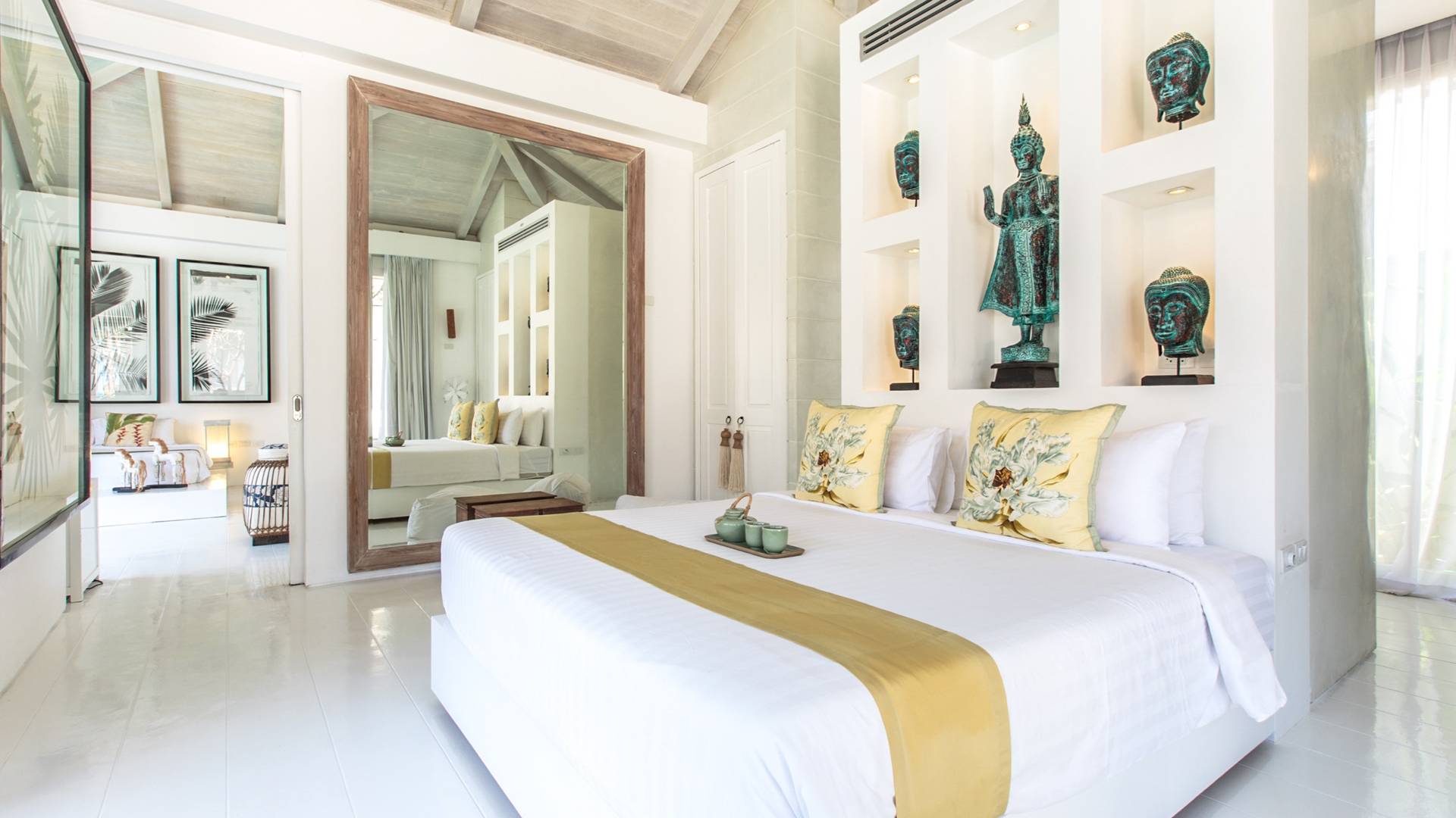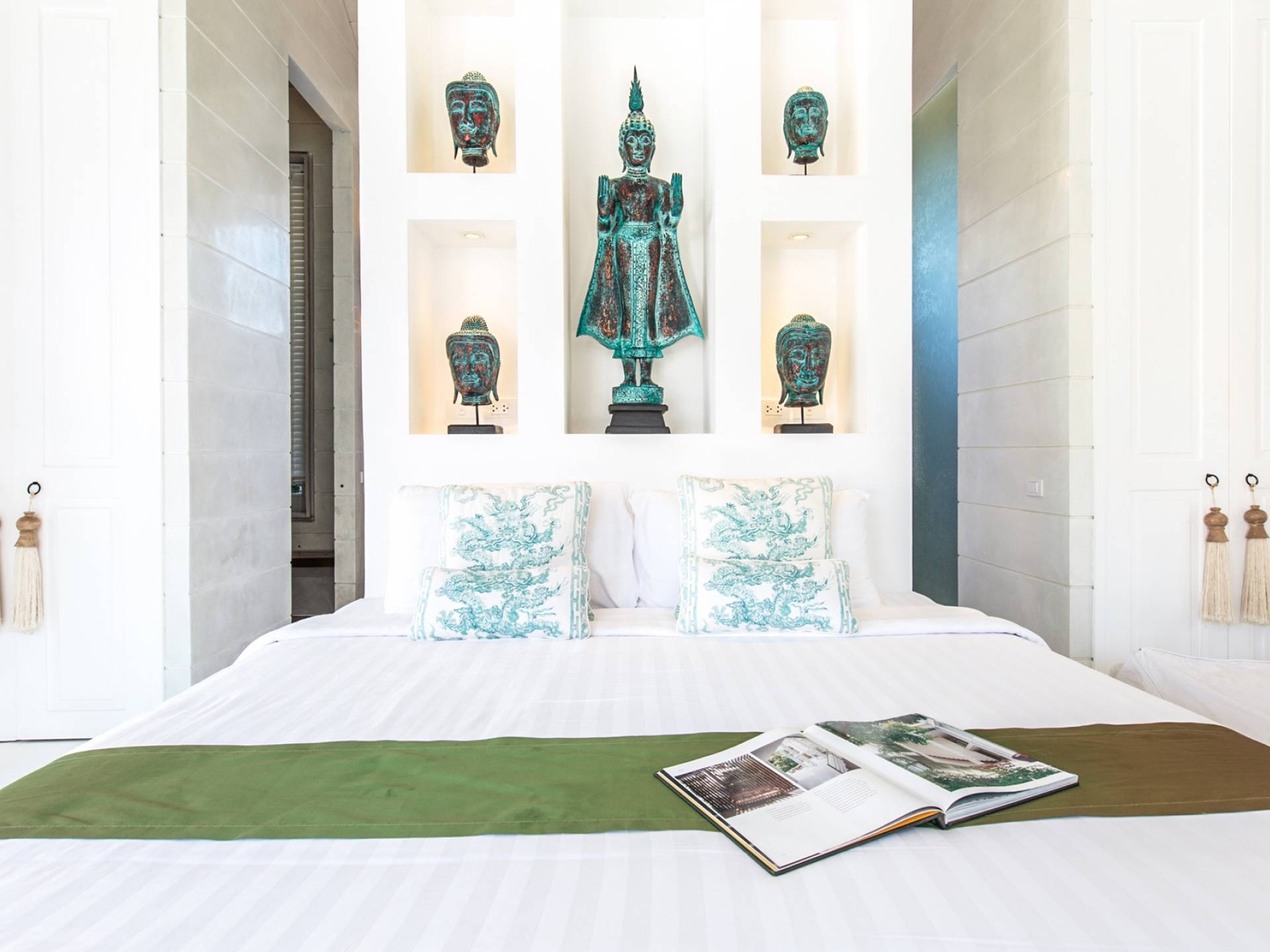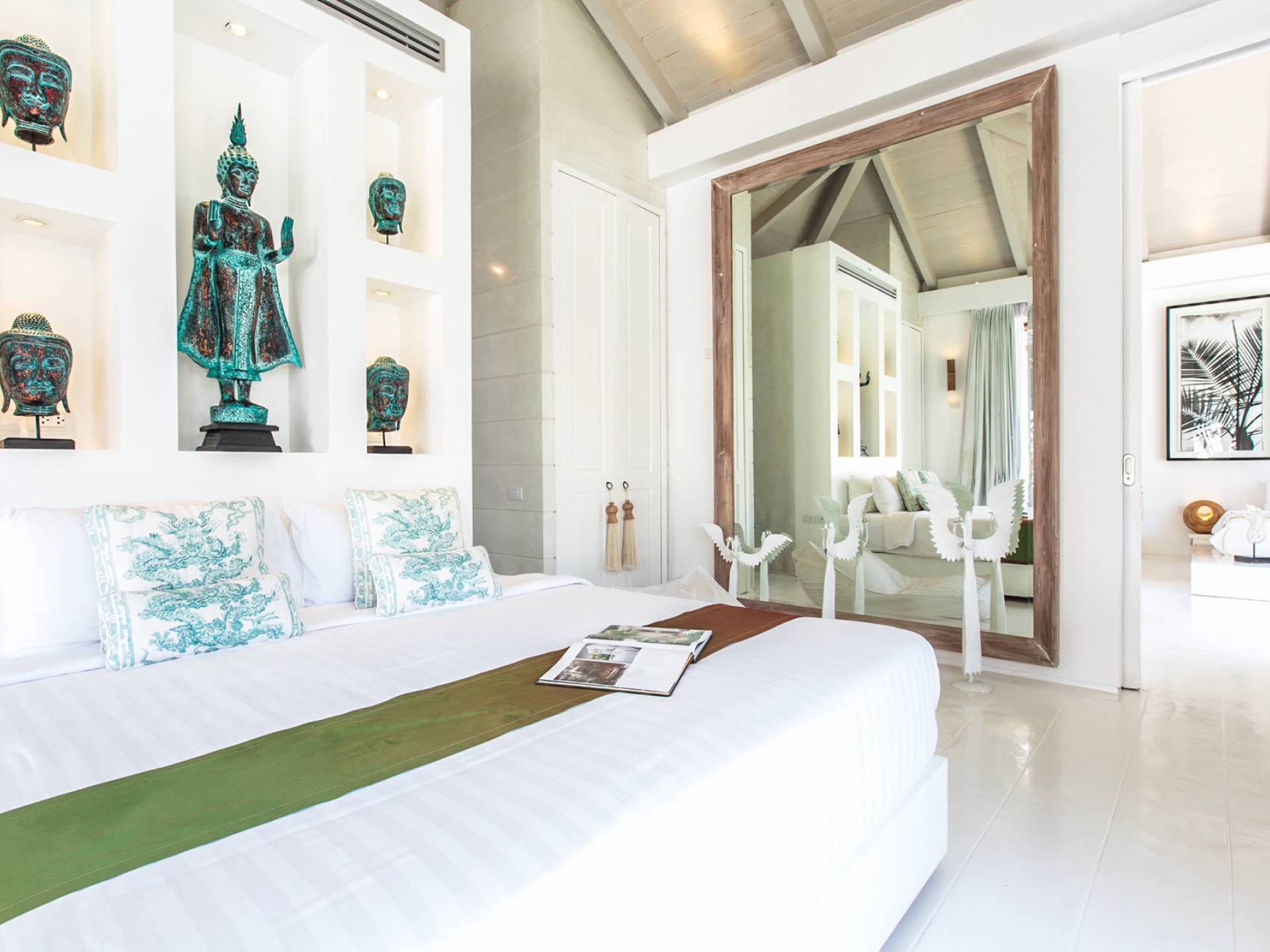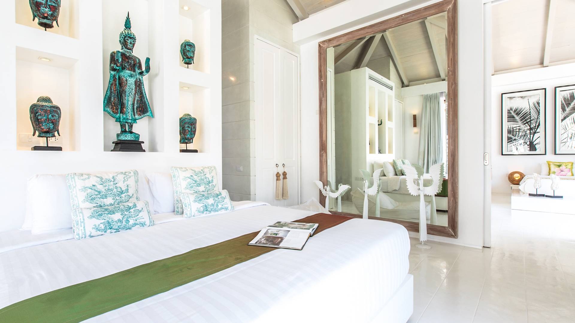 Напротив главной спальни, с правой стороны, современная кухня и столовая выходят на океан. В гостиной есть еще одна обеденная зона на улице. Резиденция состоит из трех павильонов, расположенных вокруг великолепного 23-метрового плавательного бассейна, облицованного балийскими зелеными камнями. Бассейн окружает огромную крытую беседку с удобными креслами. В дальнем конце бассейн становится мельче и позволяет маленьким детям безопасно плавать. Элегантно обставленные спальни оснащены кроватями размера "king-size", ЖК-телевизором с Netflix, встроенными шкафами, персональными сейфами, мини-барами и большими зеркалами. Каждая спальня имеет собственную ванную комнату с тропическим душем, двумя раковинами и небольшим частным садом с тропическими растениями с тропическим душем на открытом воздухе или роскошной ванной из терраццо. Все спальни выходят на бассейн и имеют прямой доступ к террасе у бассейна.