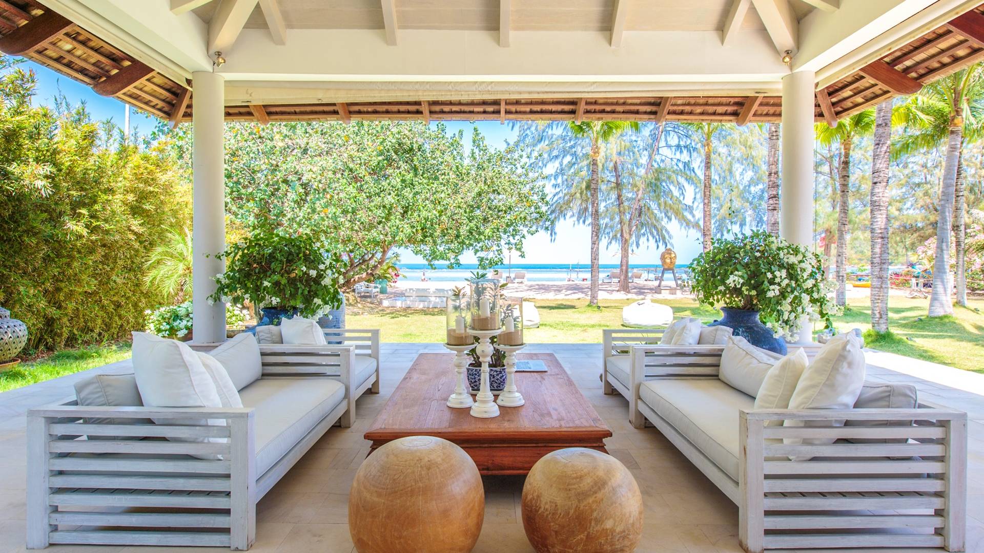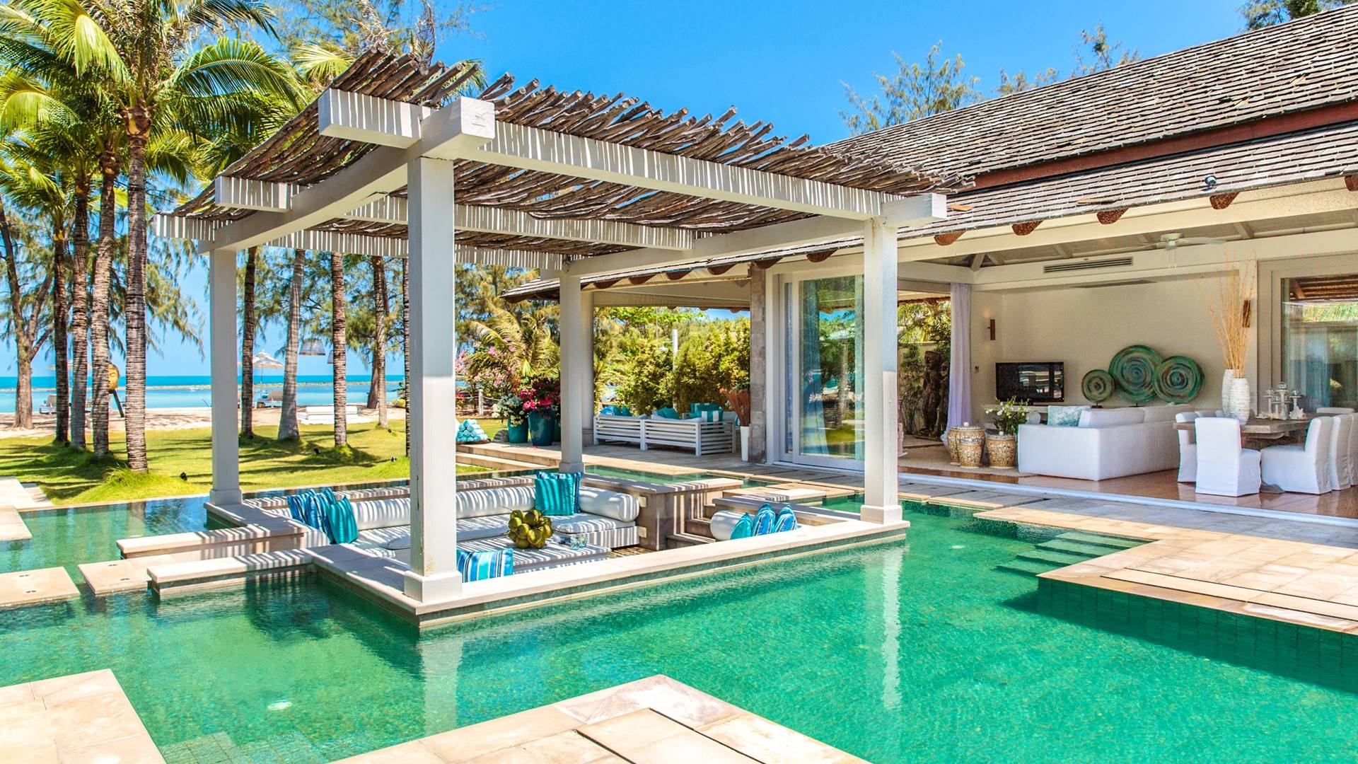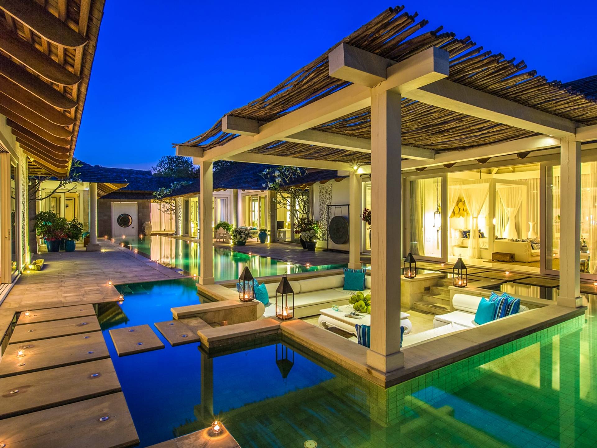 На пляже по обеим сторонам бассейна расположены большие веранды с дополнительными зонами отдыха на свежем воздухе и обеденным столом на открытом воздухе. За бассейном и верандой гостиные представляют собой плоскую травяную лужайку с шезлонгами и зонтиками, засаженную кокосовыми пальмами. Посреди пляжа большая голова Будды благосклонно улыбается вилле. По обеим сторонам пляжа установлены большие двуспальные кушетки для отдыха. Бассейн и зона отдыха Резиденция состоит из трех павильонов, расположенных вокруг великолепного 23-метрового плавательного бассейна, выложенного балийскими зелеными камнями. Бассейн окружает огромную крытую беседку с удобными креслами. В дальнем конце бассейн становится мельче и позволяет маленьким детям безопасно плавать.