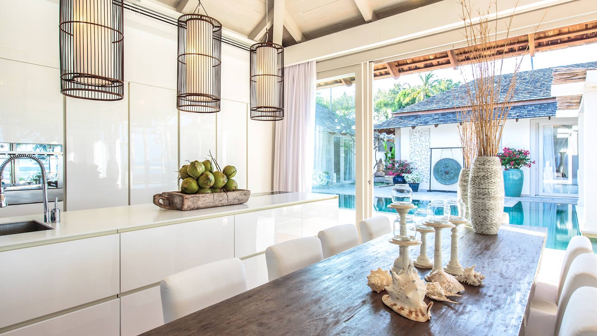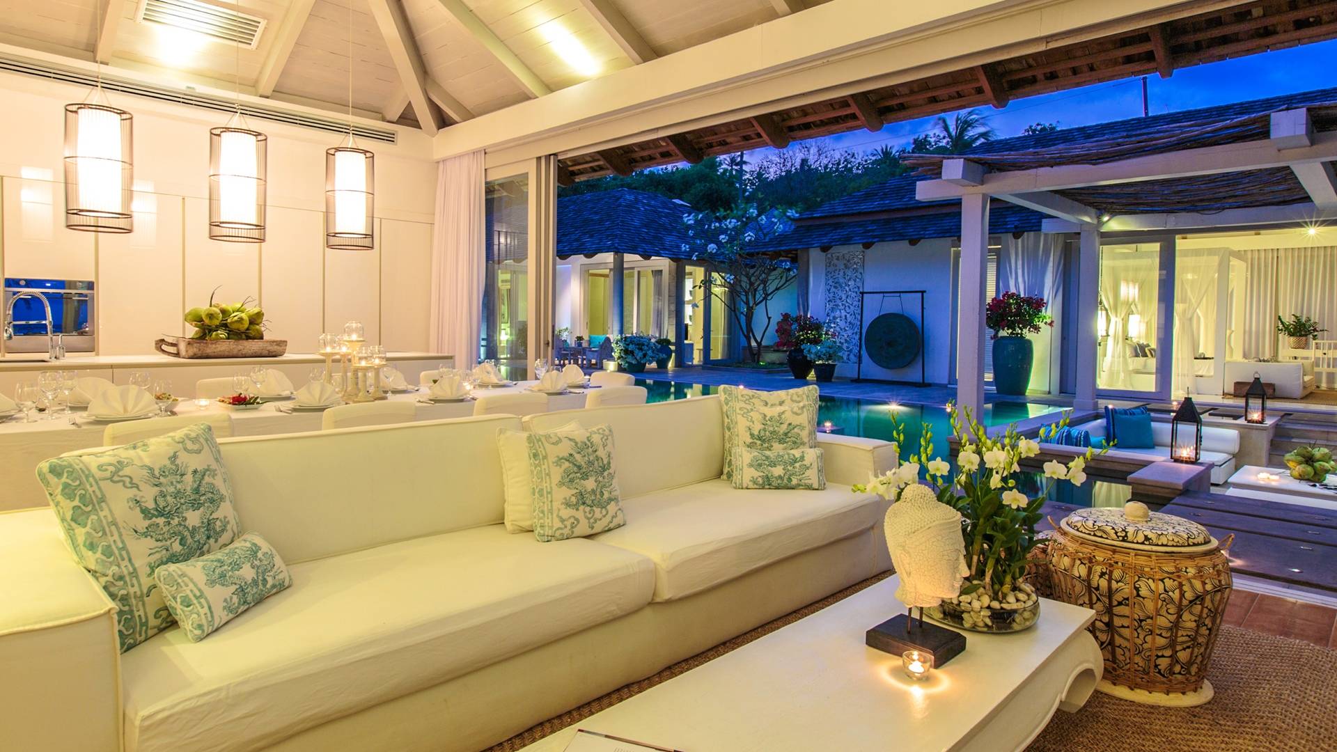 Большой современный интерьер В просторной гостиной открытой планировки преобладают удобные длинные белые диваны и большой телевизор с плоским экраном. Полностью оборудованная кухня определяется длинным парящим островом со встроенным винным холодильником и тонкими черными конфорками, а обеденный стол рассчитан на десять человек. За кухней находится крытая кухня в тайском стиле с барбекю.