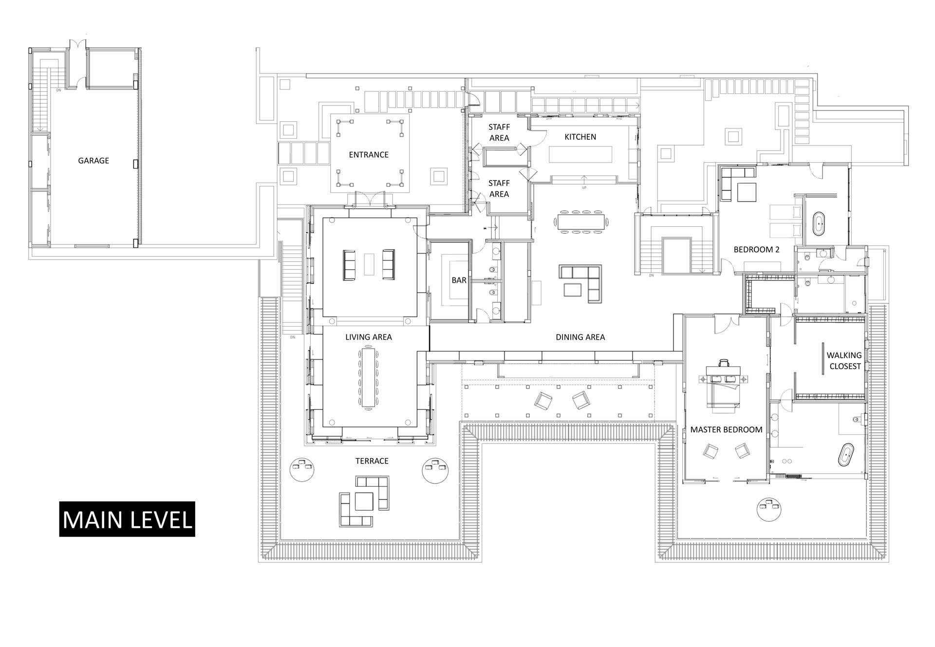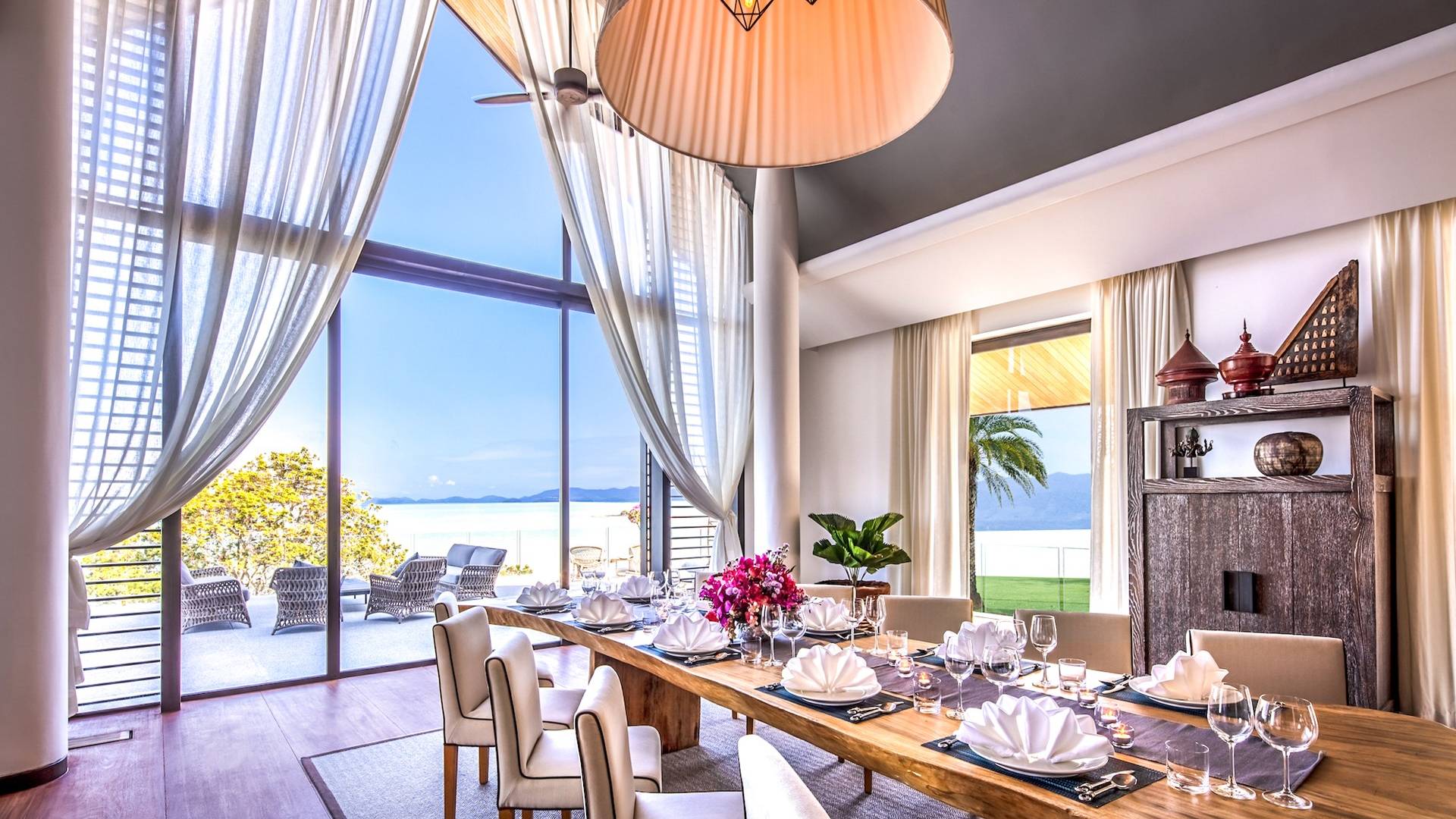 Если посмотреть на виллу Алхимия с самого входа, она покажется обычным скромным бунгало. Однако, если смотреть со стороны залива, этот дом представляет собой растянутый 4-этажный роскошный дом, спускающийся каскадом вниз по склону холма, как великолепная лестница, облицованная элегантной белой, кристально-синей и пышной зеленой плиткой. Несмотря на скромный подъезд, вилла действительно вместительна. На самом деле, он может похвастаться самым большим количеством спален среди всех других объектов недвижимости в поместье, всего десять, все из которых имеют ванные комнаты и имеют прекрасный вид на залив Пхангнга.