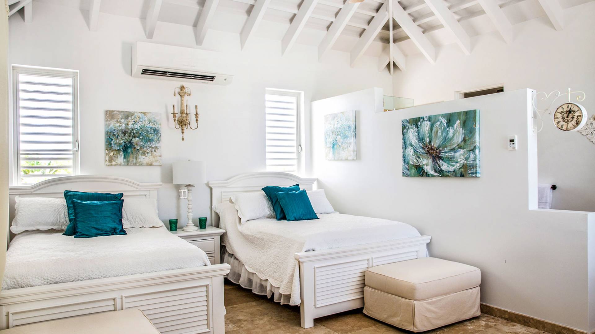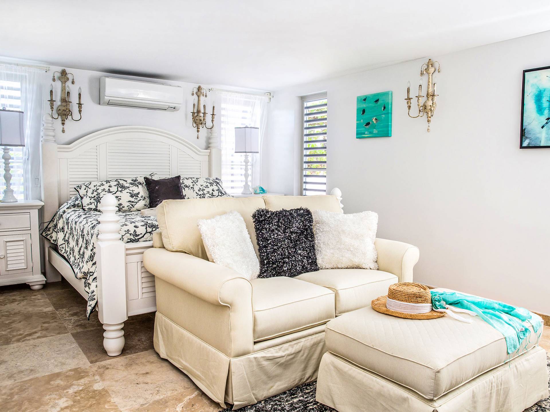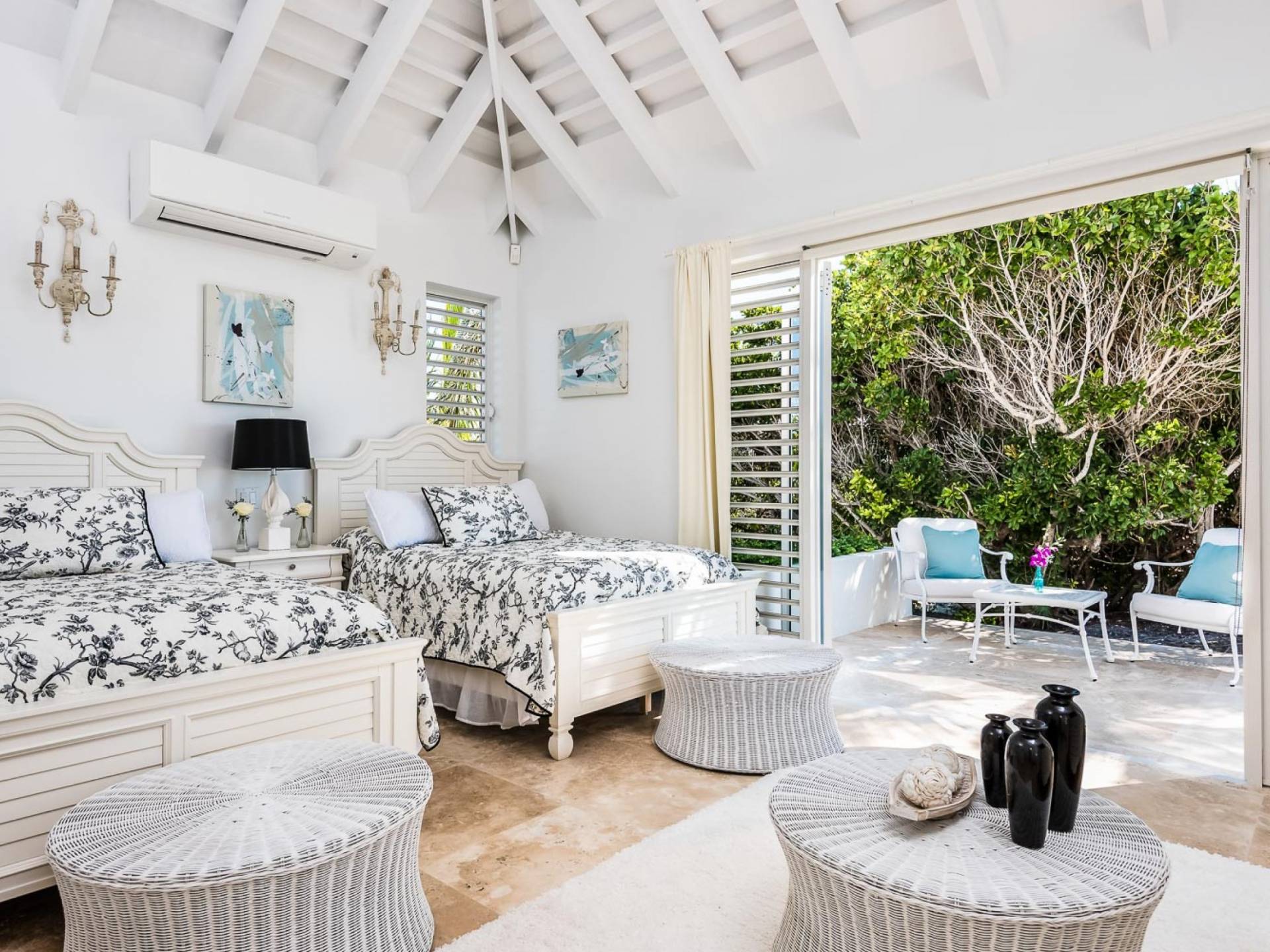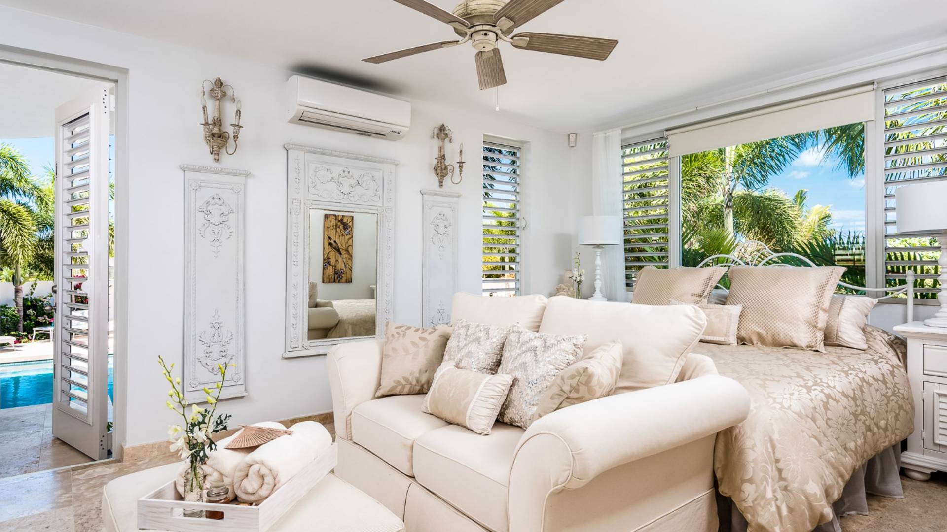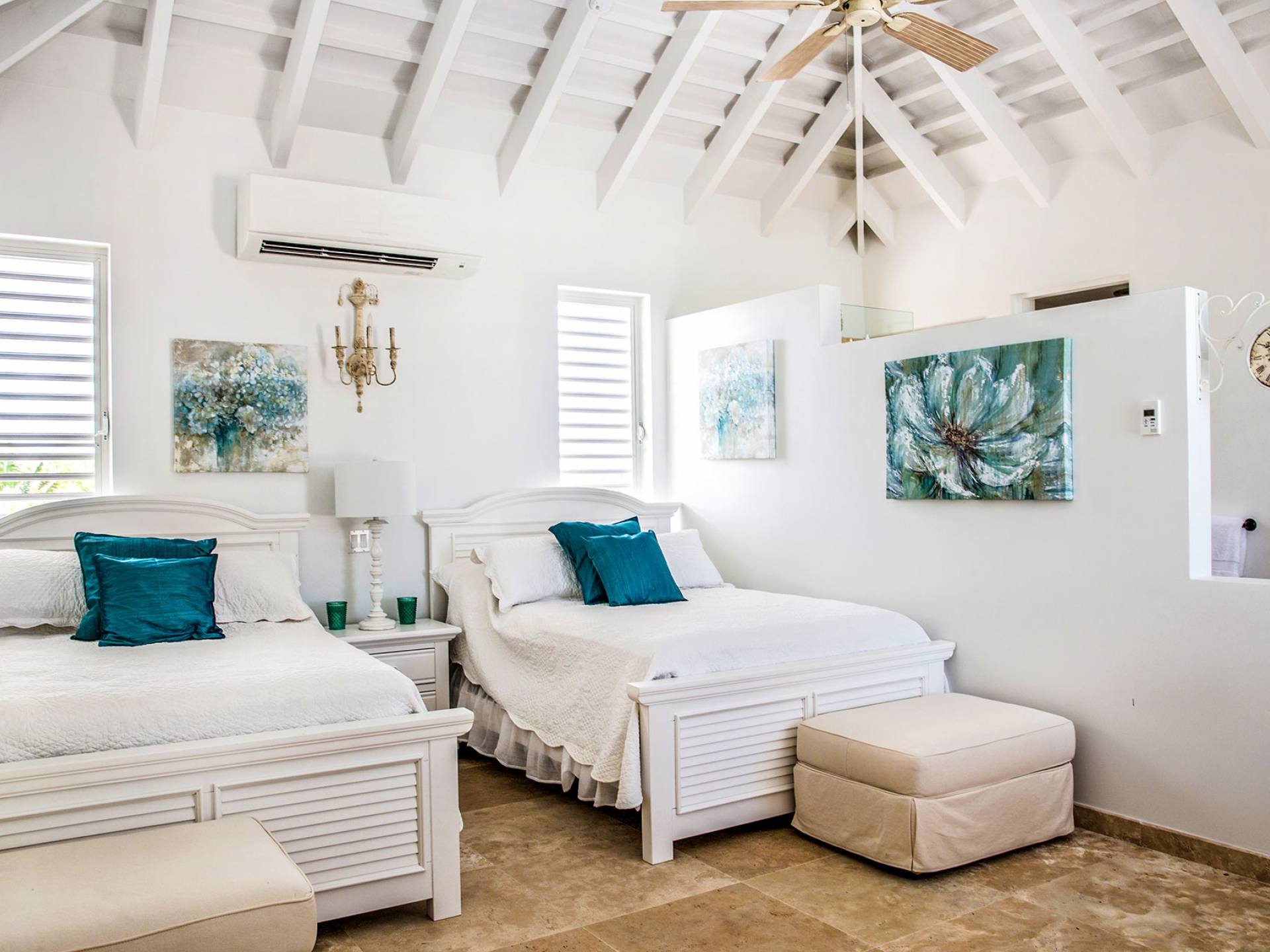 Вилла Pearl West имеет восемь великолепных спален с ванными комнатами, которые отражают волшебную красоту островов Теркс и Кайкос. Просторная главная спальня с раздвижными стеклянными дверями выходит на красивый балкон с потрясающими видами. В остальных гостевых спальнях, также роскошно обставленных, также есть ванная комната, потолочные вентиляторы, кондиционер, телевизор с плоским 55-дюймовым экраном, Apple TV, Netflix, Wi-Fi, сейф и холодильник.
