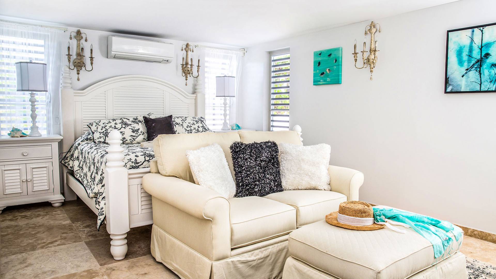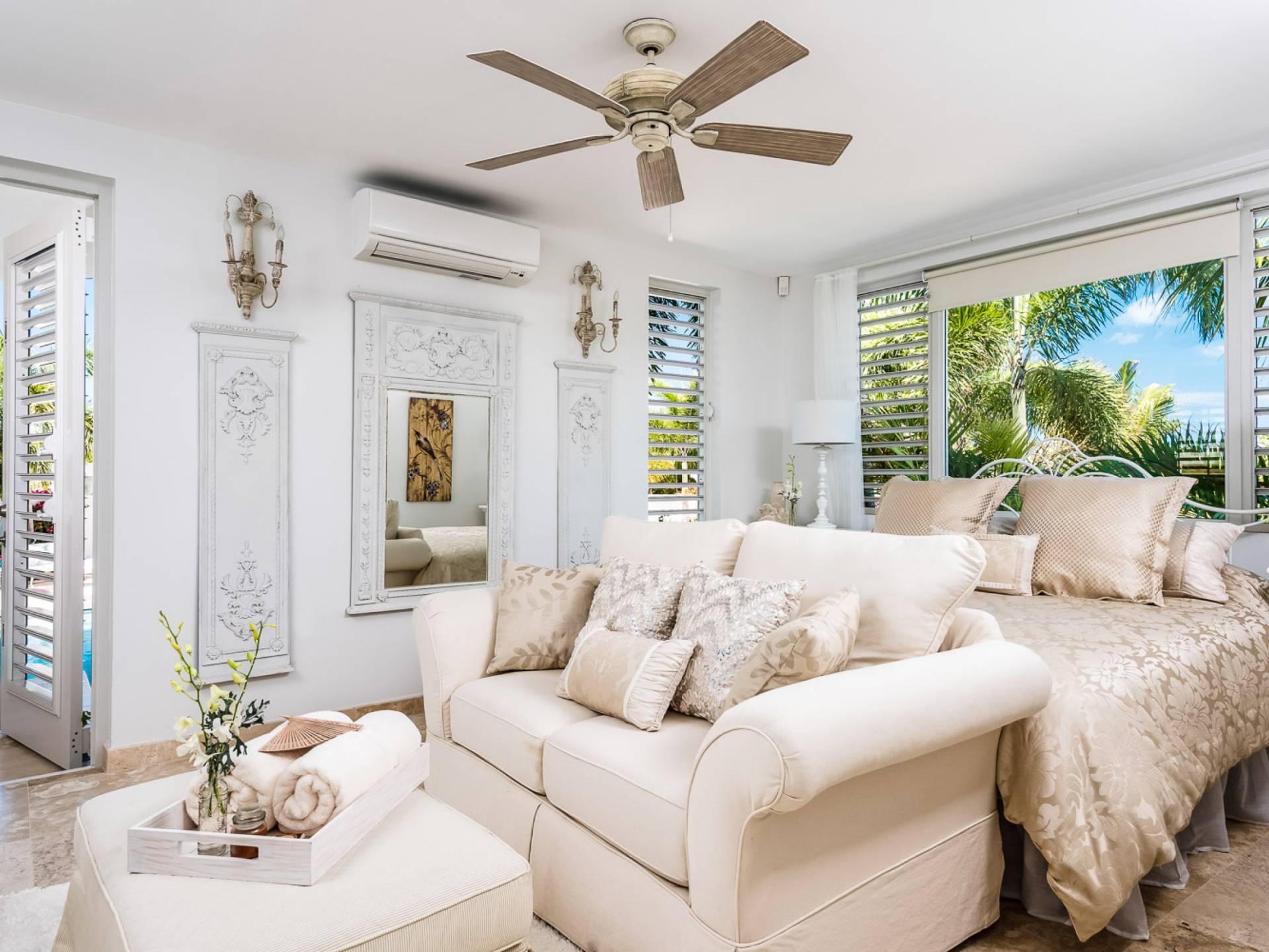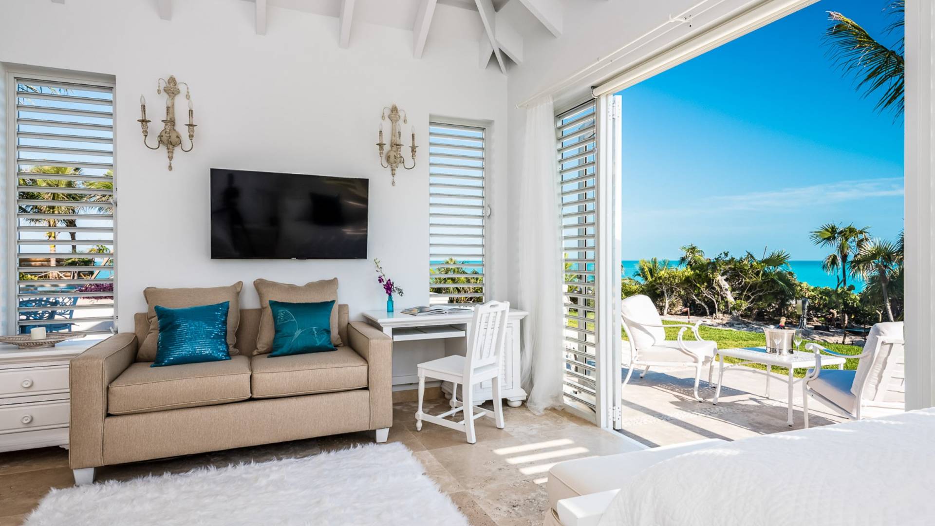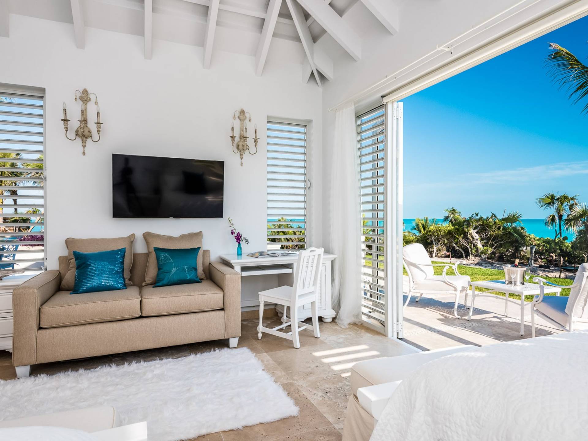 Вилла Pearl West имеет восемь великолепных спален с ванными комнатами, которые отражают волшебную красоту островов Теркс и Кайкос. Просторная главная спальня с раздвижными стеклянными дверями выходит на красивый балкон с потрясающими видами. В остальных гостевых спальнях, также роскошно обставленных, также есть ванная комната, потолочные вентиляторы, кондиционер, телевизор с плоским 55-дюймовым экраном, Apple TV, Netflix, Wi-Fi, сейф и холодильник.