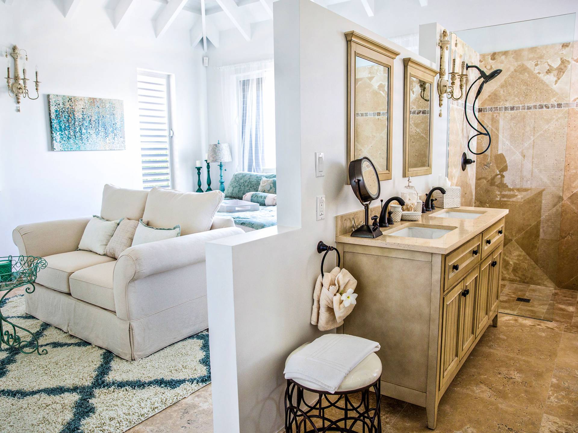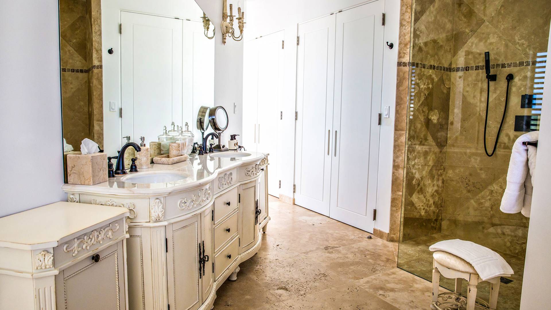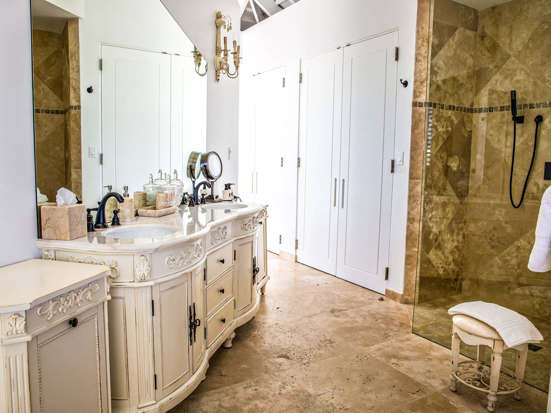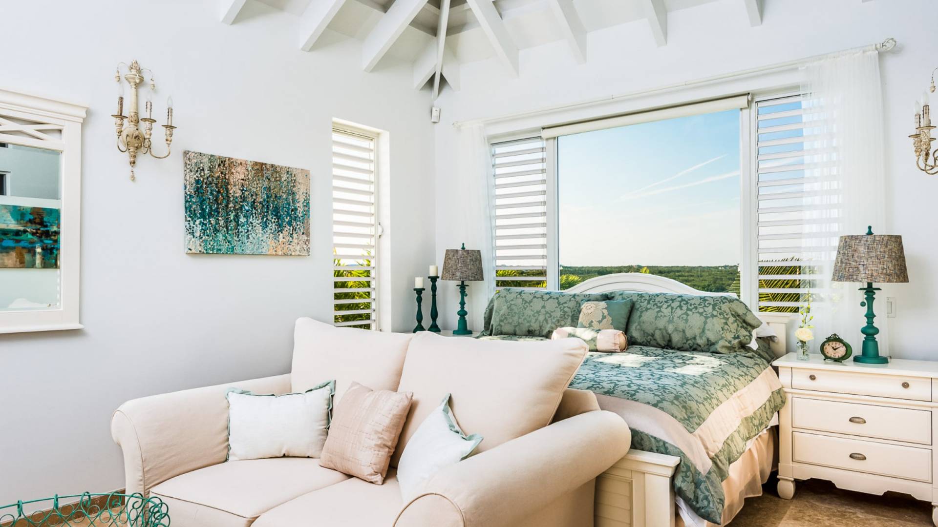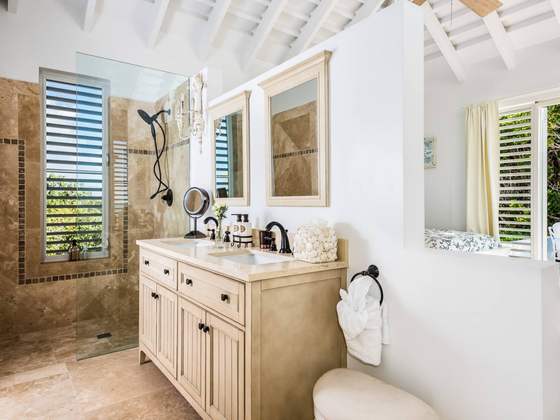 Вилла Pearl West имеет восемь великолепных спален с ванными комнатами, которые отражают волшебную красоту островов Теркс и Кайкос. Просторная главная спальня с раздвижными стеклянными дверями выходит на красивый балкон с потрясающими видами. В остальных гостевых спальнях, также роскошно обставленных, также есть ванная комната, потолочные вентиляторы, кондиционер, телевизор с плоским 55-дюймовым экраном, Apple TV, Netflix, Wi-Fi, сейф и холодильник.